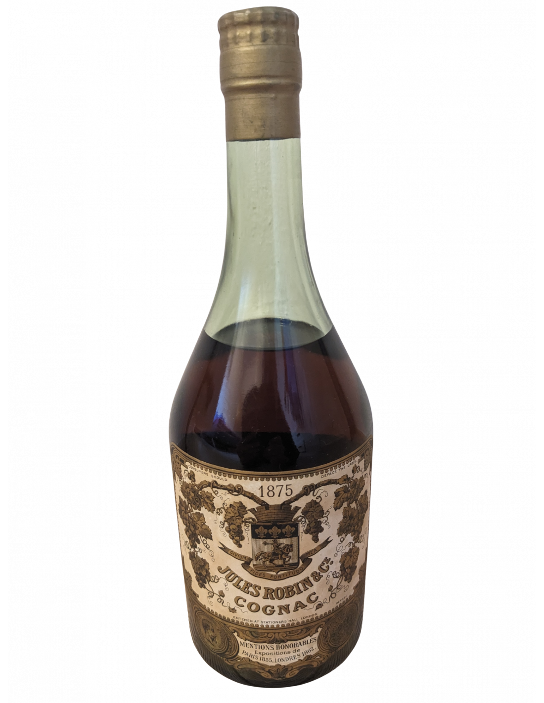 CONSUMERS SHOULD DEFACE THE LABEL – 1875 – CIVIUM FIDES FORTITUDO MEA – Jules ROBIN & C° COGNAC – ENTERED AT STATIONERS HALL LONDON – PRODUCED & BOTTLED BY J. ROBIN & C° CHARENTE, FRANCE – VINTAGE GUARANTEE – MENTIONS HONORABLES, EXPOSITIONS DE PARIS 1855, LONDRES 1862.