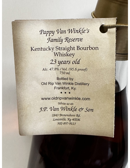 - Pappy Van Winkle's Family Reserve Kentucky Straight Bourbon Whiskey 23 years old Alc. 47.8% / Vol. (95.6 proof) 750 ml Bottled by Old Rip Van Winkle Distillery Frankfort, Ky. www.oldripvanwinkle.com Write us at: J.P. Van Winkle cơ Son 2843...