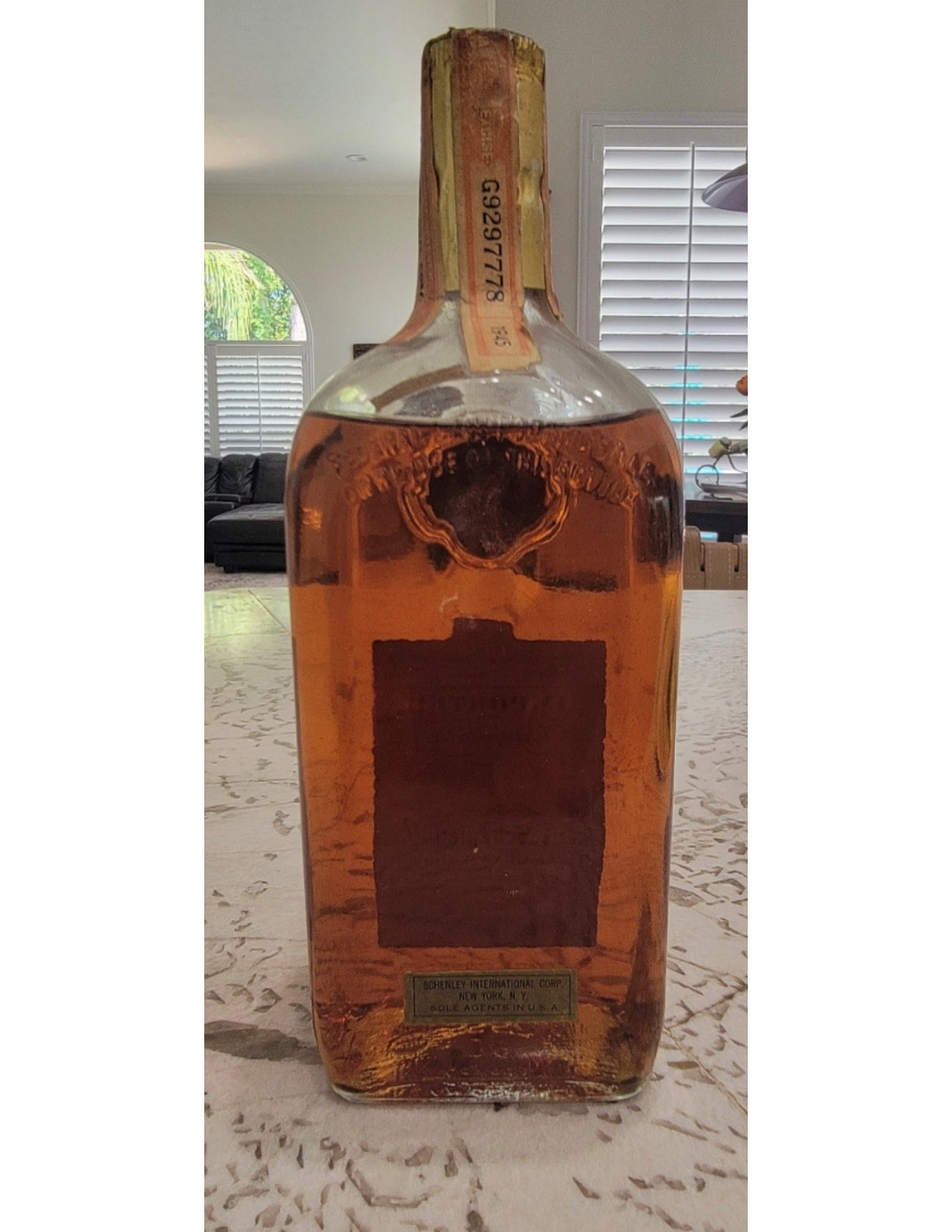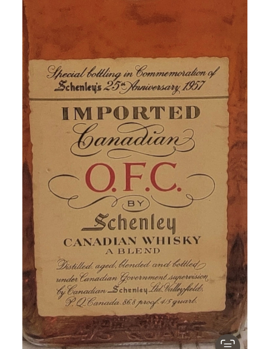 - Special bottling in Commemoration of Schnely's 25th Anniversary 1057. Imported Canadian O,F, C, by Schenley Canadian Whisky a blend. Distilled, aged, blended and bottled under Canadian Government supervision by Canadian Schenley, Ltd Valley...