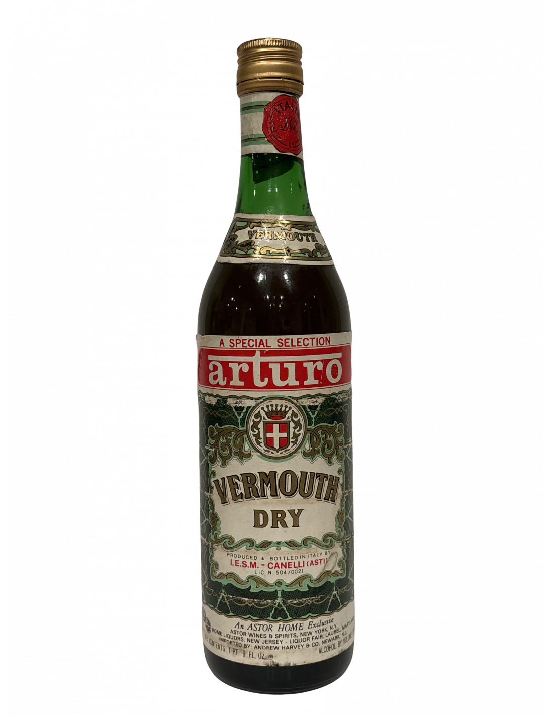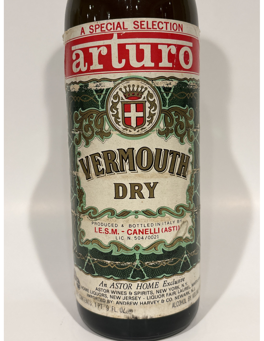 This bottle of Arturo Vermouth Dry is a true piece of cocktail and retail history, representing the golden era of mid-20th century U.S. imports of Italian aromatized wines. Unlike mass-market vermouths, it was produced in Canelli (Asti, Piedmont)—a town renowned for its spumante and vermouth traditions—and bottled under the now-vanished producer name I.E.S.M.. What makes it particularly collectible is its status as an “Astor Home Exclusive”, created for a distribution network linking some of the most prominent East Coast wine and liquor retailers of the time: Astor Wines & Spirits in New York, Home Liquors in New Jersey, and Liquor Fair in Laurel, Maryland. Imported by Andrew Harvey & Co. of Newark, NJ, the bottle carries all the hallmarks of its 1960s–70s era—most notably the U.S.-specific volume declaration (“1 Pt. 9 Fl. Oz.”) and the period-style design. Today, bottles like this survive only rarely in sealed condition, making them prized collectibles for enthusiasts of vintage spirits, mid-century cocktail culture, and historic U.S.–Italian trade connections.