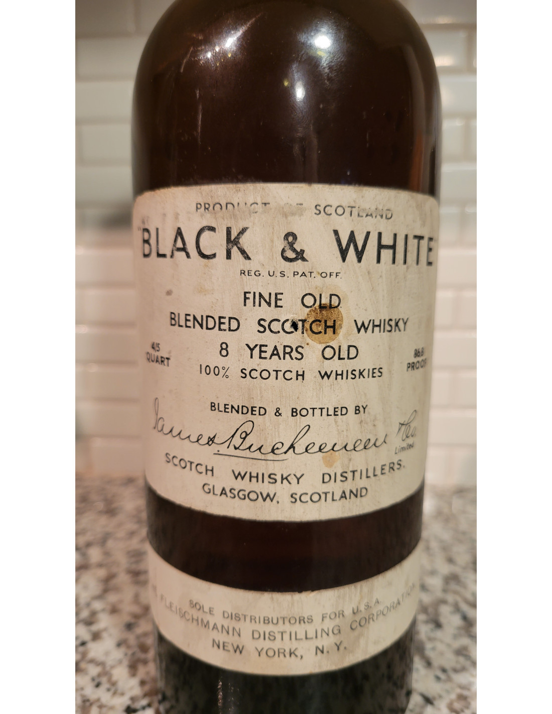 - Product is Scotland Black and White Fine Old Blended Scotch Whiskey 8 years old 100% Scotch Whiskeys Blended and Bottled by James Buchanan 4/5 Quart. 86.8 Proof
