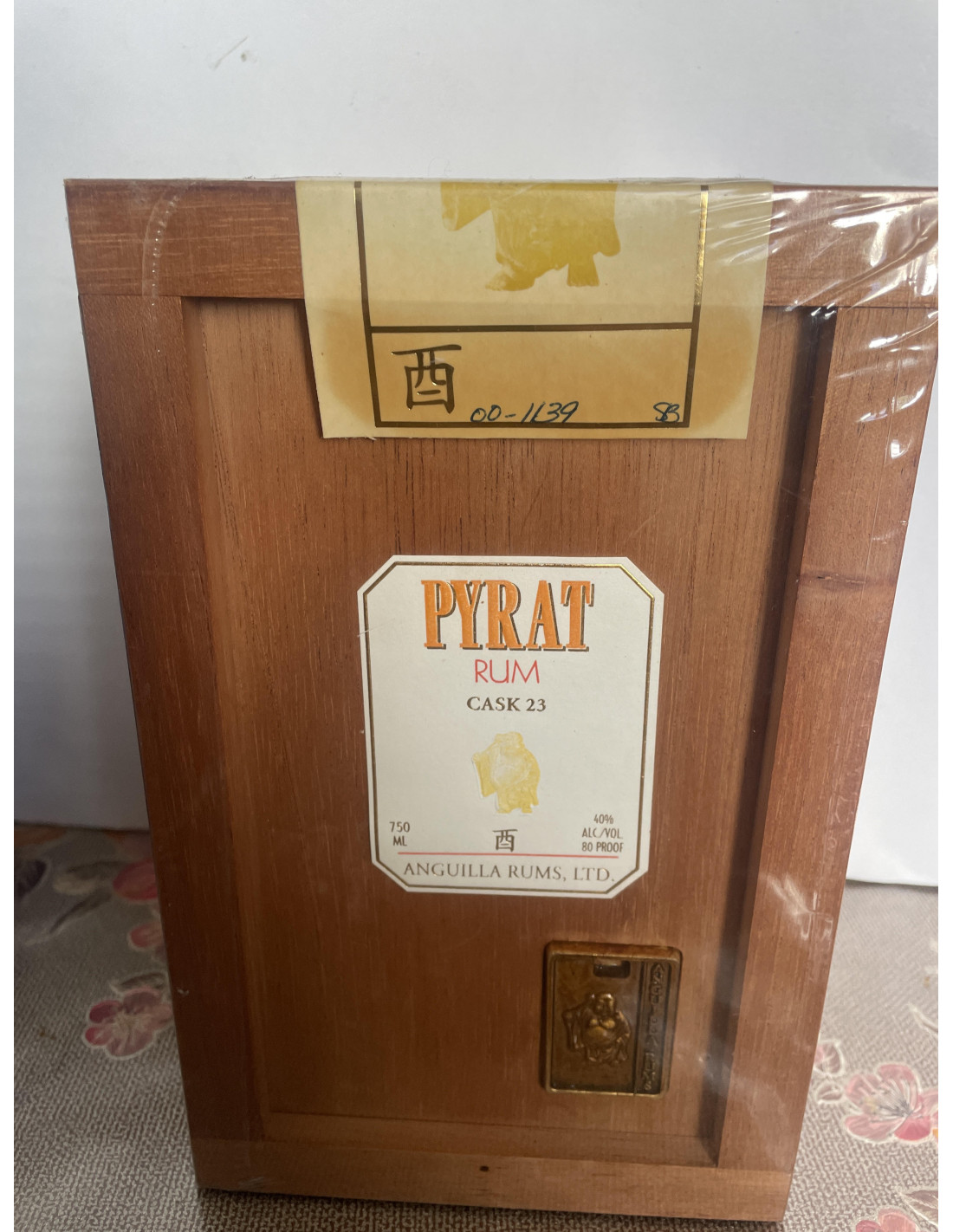 - I cannot read the bottle because it is enclosed in a box that is sealed. On the box, however, there is a label that reads: Pyrat Rum Cask 23 Anguilla Rums, Ltd. Another sticker has the number: 00-1139 SB (handwritten) and a sticker on the b...
