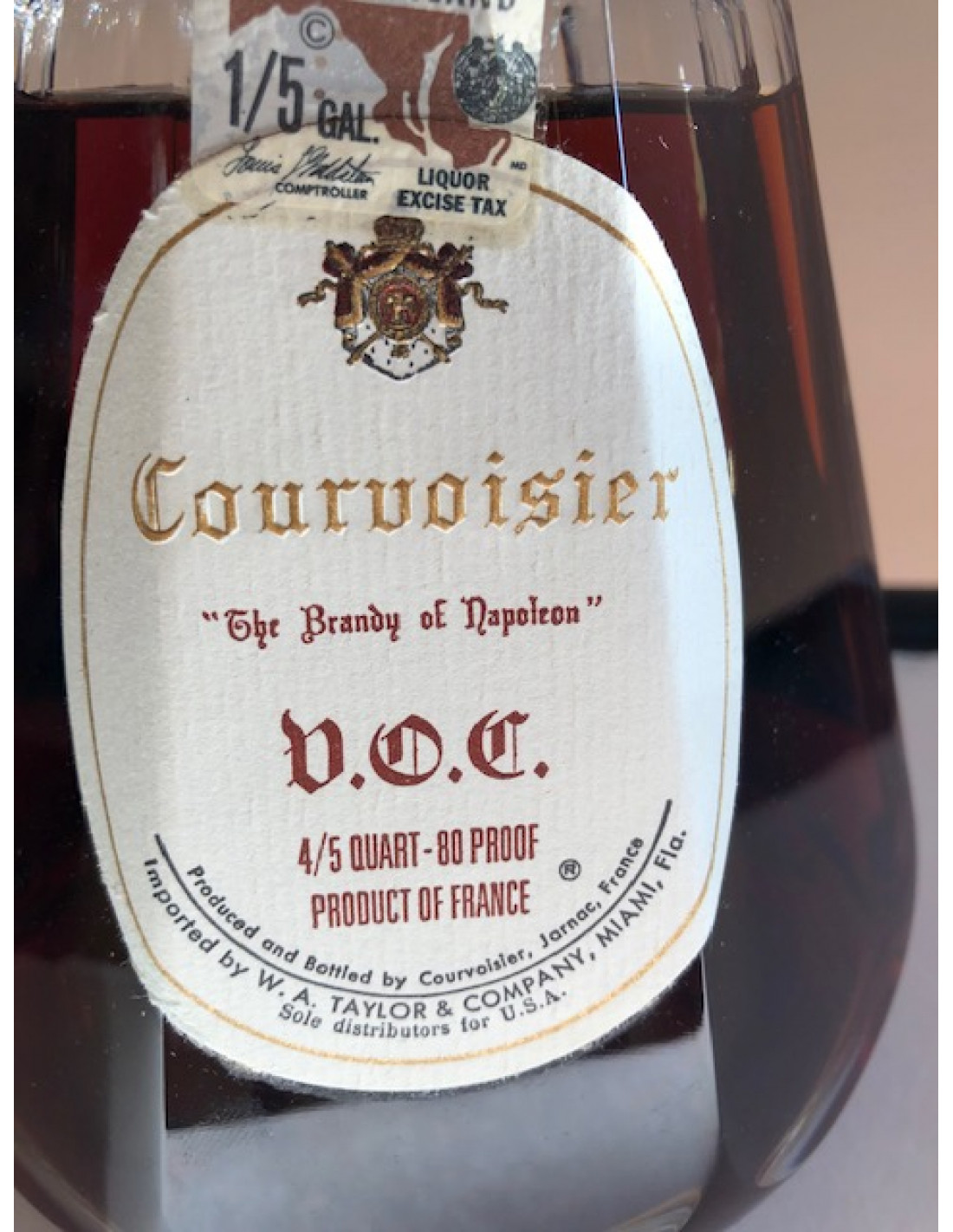 - Courvoisier "The Brandy of Napoleon" V.O.C. 4/5 QUART - 80 PROOF PRODUCT OF FRANCE Produced and Bottled by Courvoisier, Jarnac, France Imported by W.A. TAYLOR & COMPANY. MIAMI, Fla. Sole distributor for U.S.A
