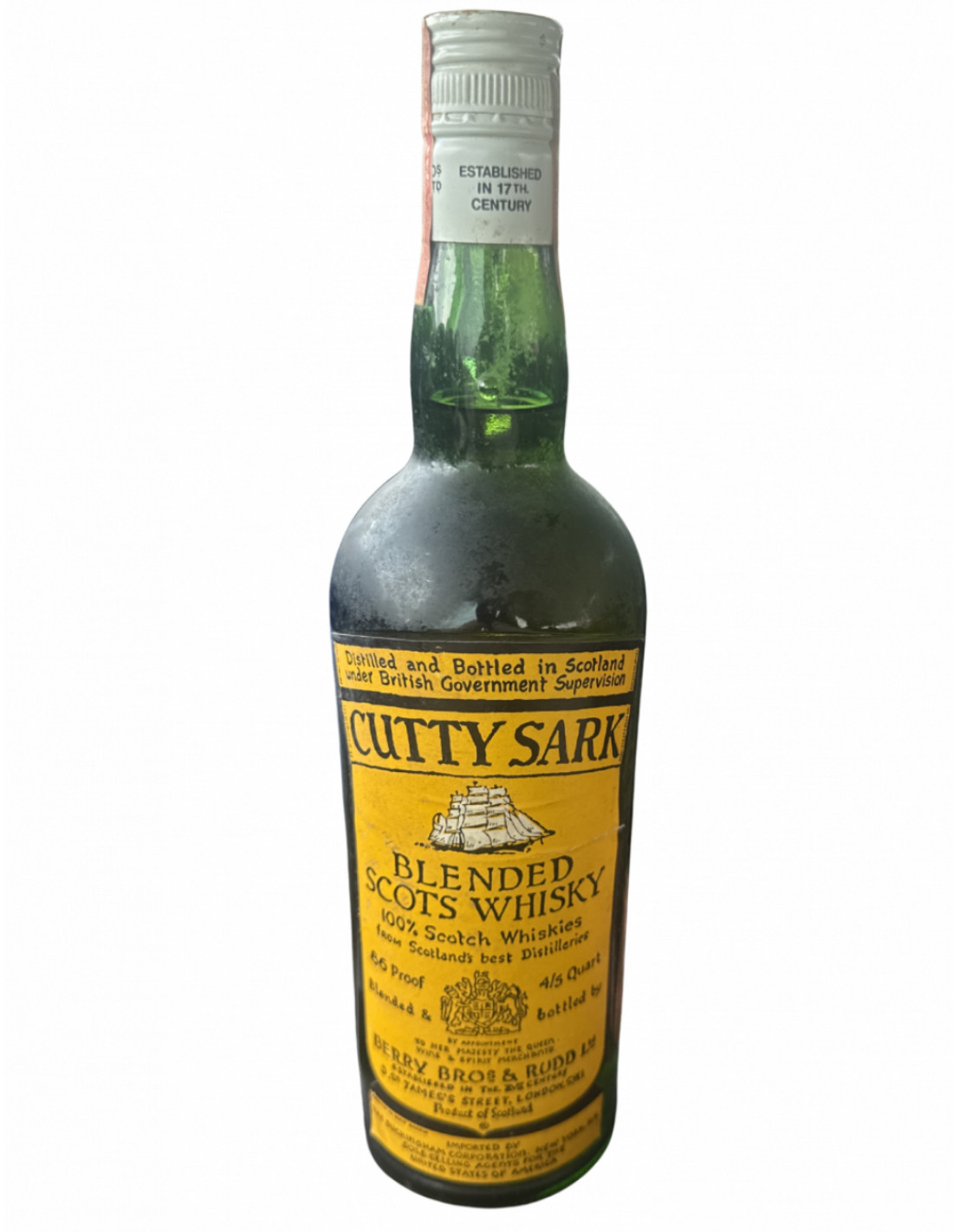 - 1) Text on label: ESTABLISHED IN 17TH. CENTURY Distilled and Bottled in Scotland under British Government Supervision CUTTY SARK BLENDED SCOTS WHISKY 100% Scotch Whiskies from Scotland's best Distilleries 8...