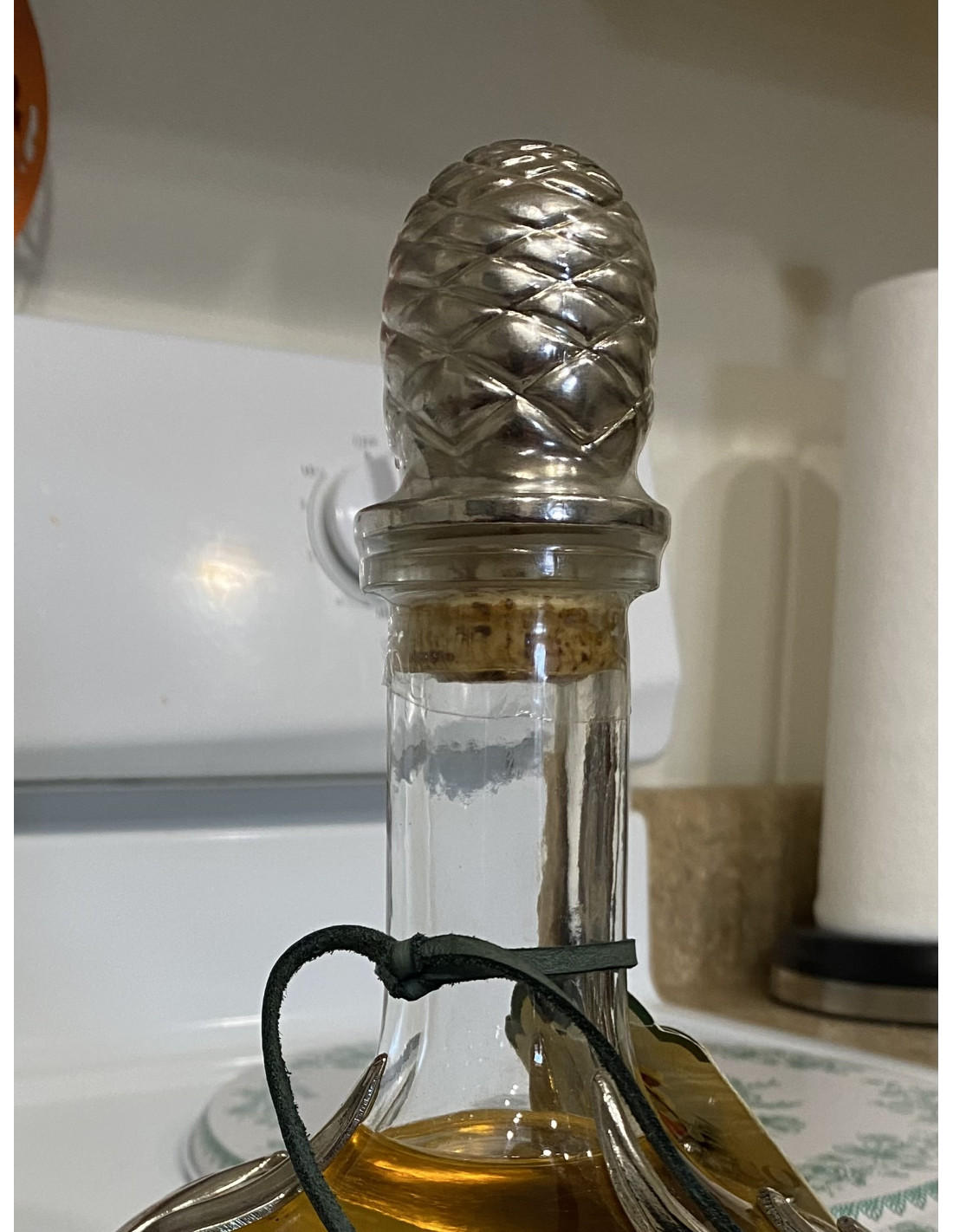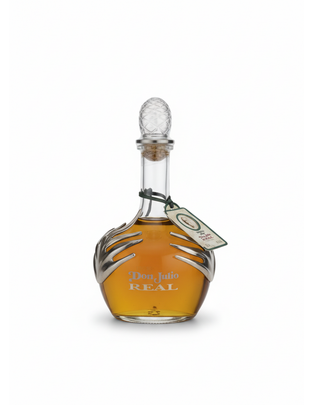 Bottle: Features a silver-colored, pineapple-shaped (agave piña) stopper on a cork. The clear glass bottle has a distinctive, wide, flattened base adorned with silver-colored, stylized agave "fronds" wrapping around the lower half. The brand names "Don Julio" and "REAL" are embossed on the glass in the mid-lower section. Small numeric digits are embossed on the lower neck.