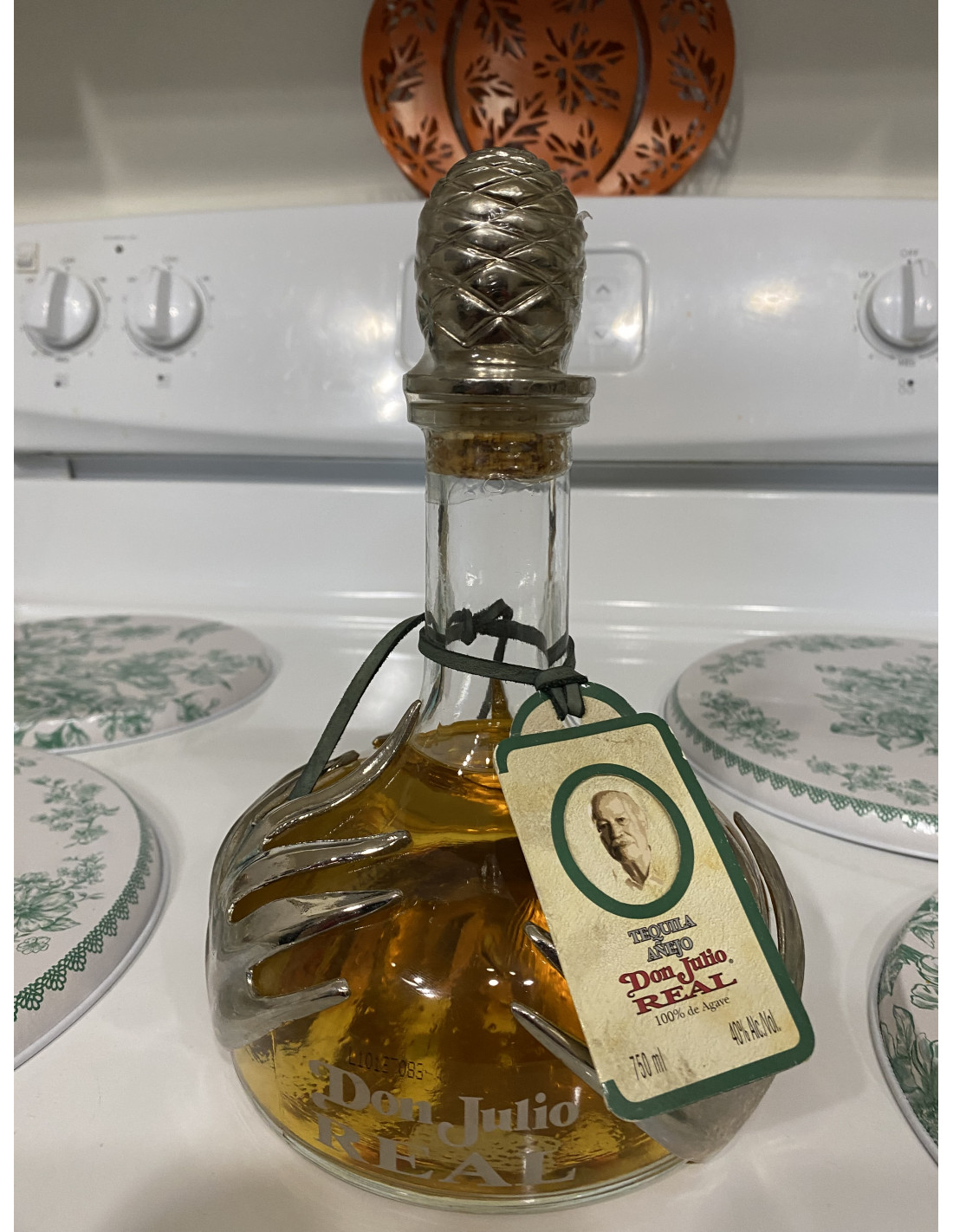 - 1) Text on label: From bottle glass (embossed on lower section): Don Julio REAL From hang tag (front): TEQUILA AÑEJO Don Julio REAL 100% de Agave 750 mL 40% Alc./Vol. From bottle neck (embossed small digits): 4101121035 From box (top/front...
