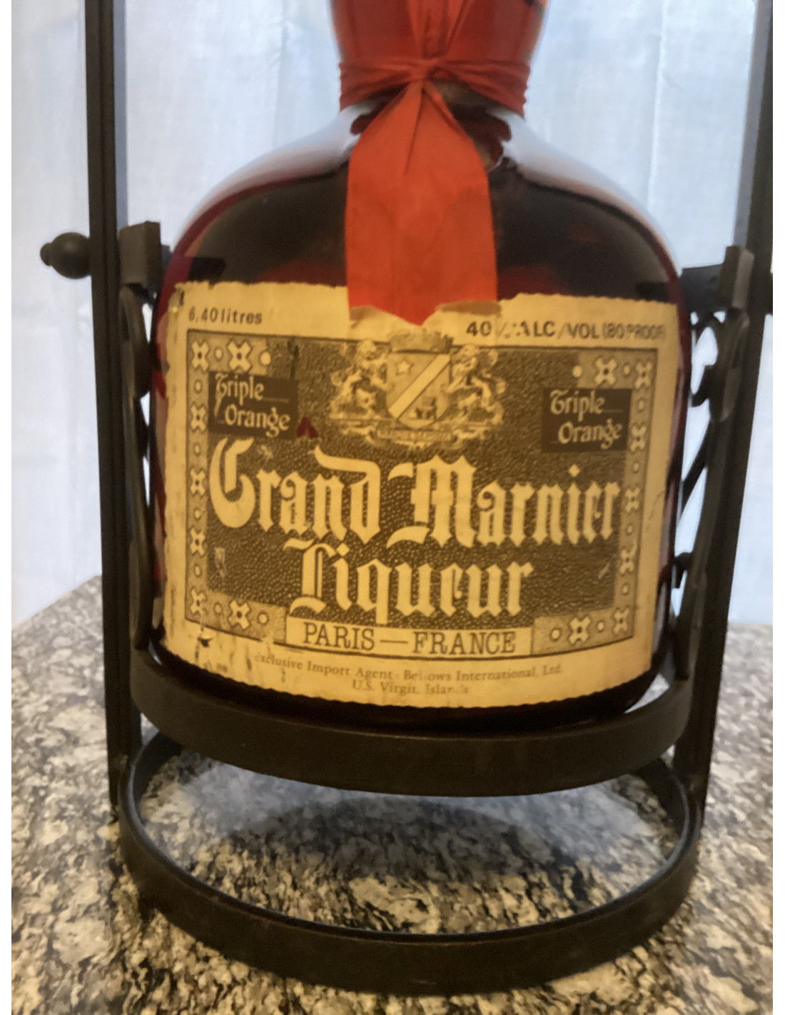 - Top seal… Grand-Iapostolle Liquer Cordon Rouge Produce of France Bottom label 6.4 liters. 40%ALC/VOL (80 proof) Triple Orange Grand Mariner Liqueur Paris-France Exclusive Import agent: Beliows International Ltd. U.S. Virgin Islands