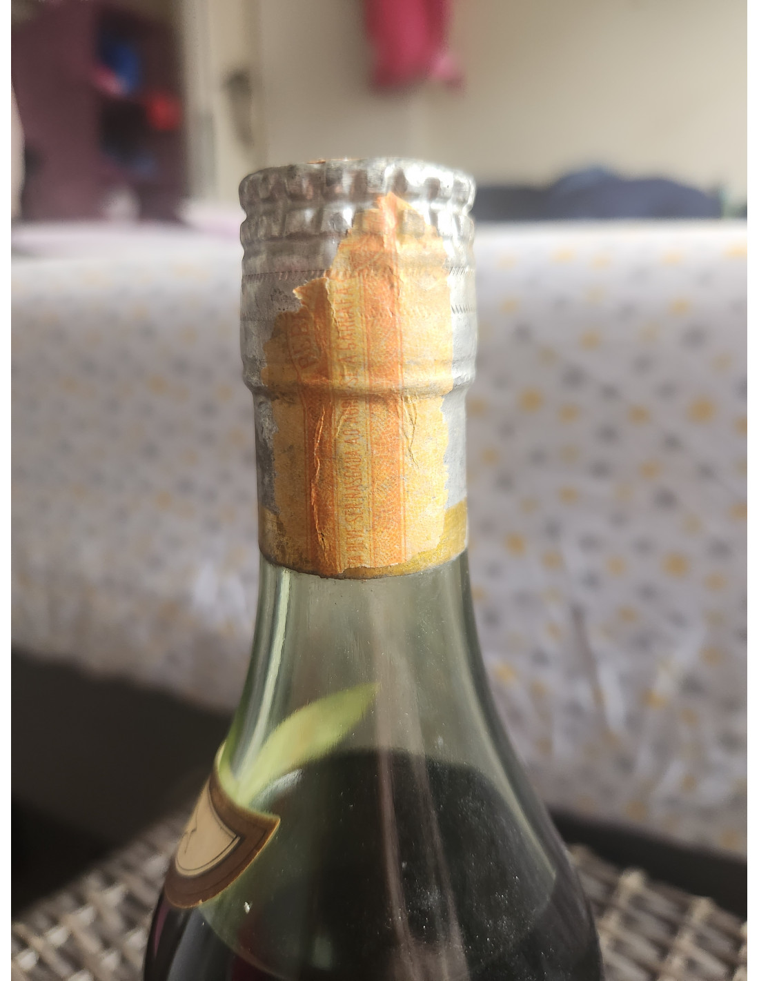 Neck/Capsule: Silver corrugated metal screw cap with a worn gold-colored band beneath it.