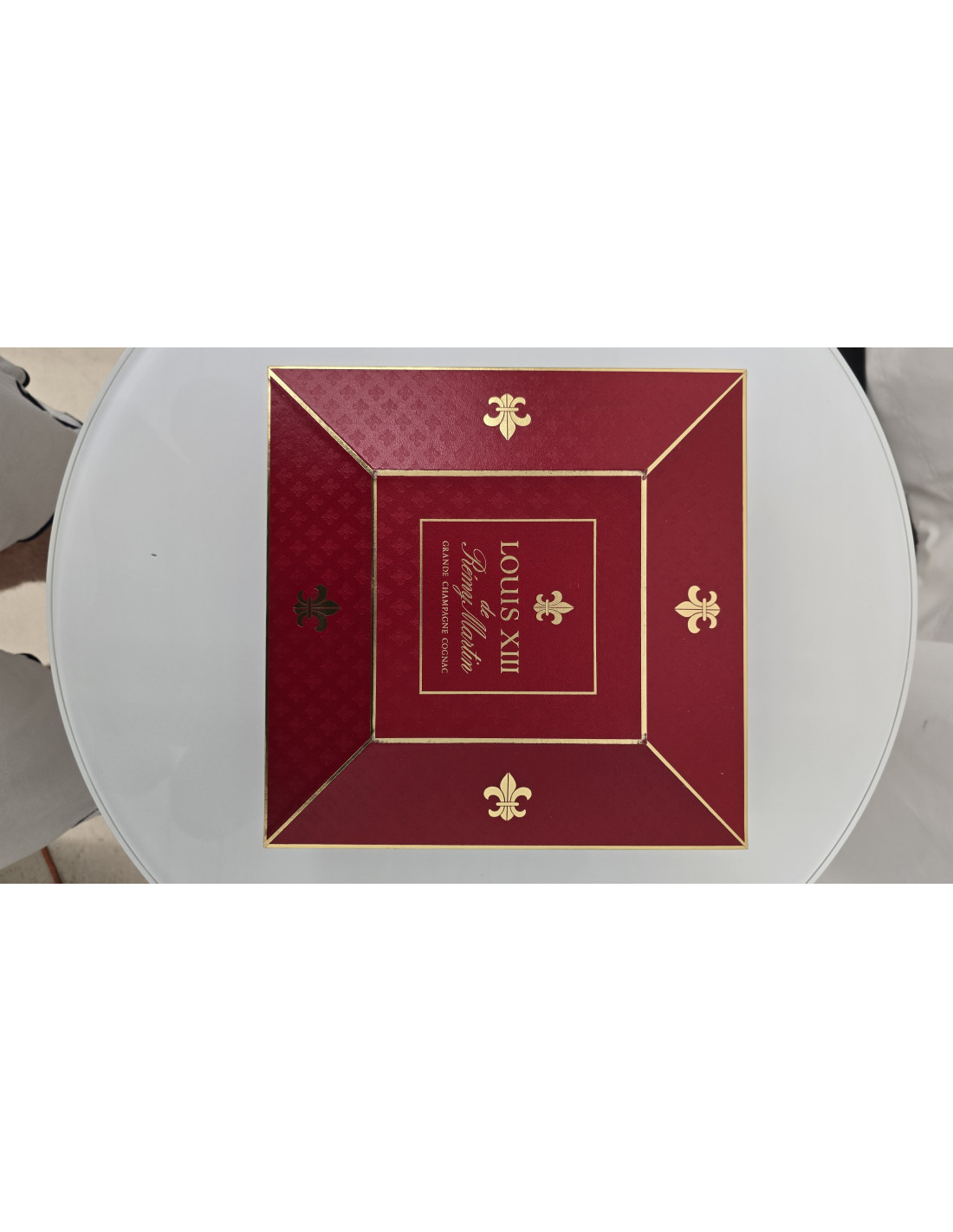 The decanter is mouth-blown Baccarat crystal, decorated with raised fleur-de-lys medallions and distinctive spiked edges. A matte gold collar surrounds the neck, embossed with the Louis XIII name, and a matching crystal stopper completes the design. The red presentation case with golden fleur-de-lys motifs enhances its luxurious appeal and is consistent with this production era.