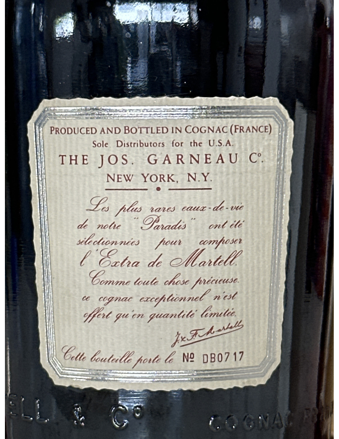 The front label reads “Martell Cognac J & F Martell Extra” and confirms production and bottling in France for the U.S. market through The Jos. Garneau Co., New York. The reverse label describes the use of rare eaux-de-vie from Martell’s “Paradis” reserves, noting the limited availability of this exceptional cognac and displaying a unique bottle number.