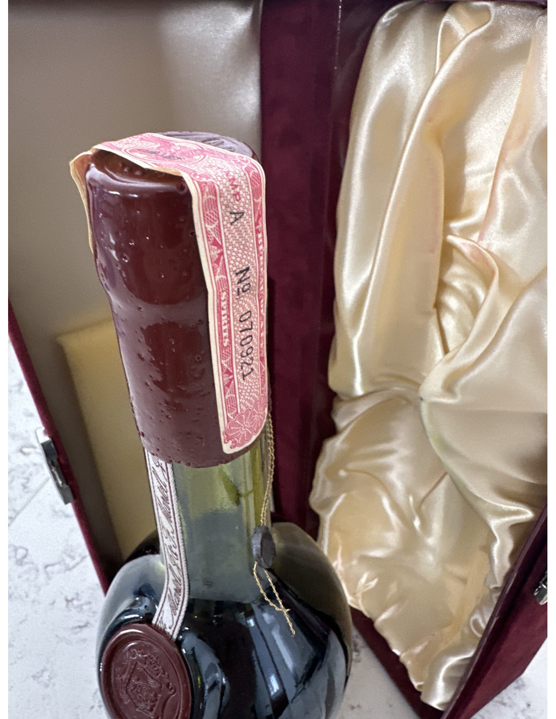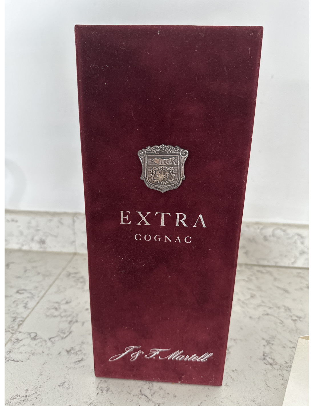 This rare vintage Martell Cognac J & F Martell Extra is a highly collectible expression from the late 1970s, bottled at 90 proof (45% ABV) in the 750 ml format. It is presented in its original red velvet case with a hinged clasp, cream-gold satin lining, and the original J & F Martell booklet. The bottle remains sealed with intact red wax and its numbered import strip, showing excellent preservation for its age.