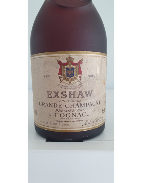 - NR1 ESTd1805 Fournisseurs Brevetes de S.A.I. le prince Napoleon EXSHAW Tres rare Grande Champagne Premier Cru du Cognac product of France- Cognac exshaw S.A.-Cognac All my labels are signed (signature) 0.70L Alc 40% Achterkant: Tres Rare Gr...