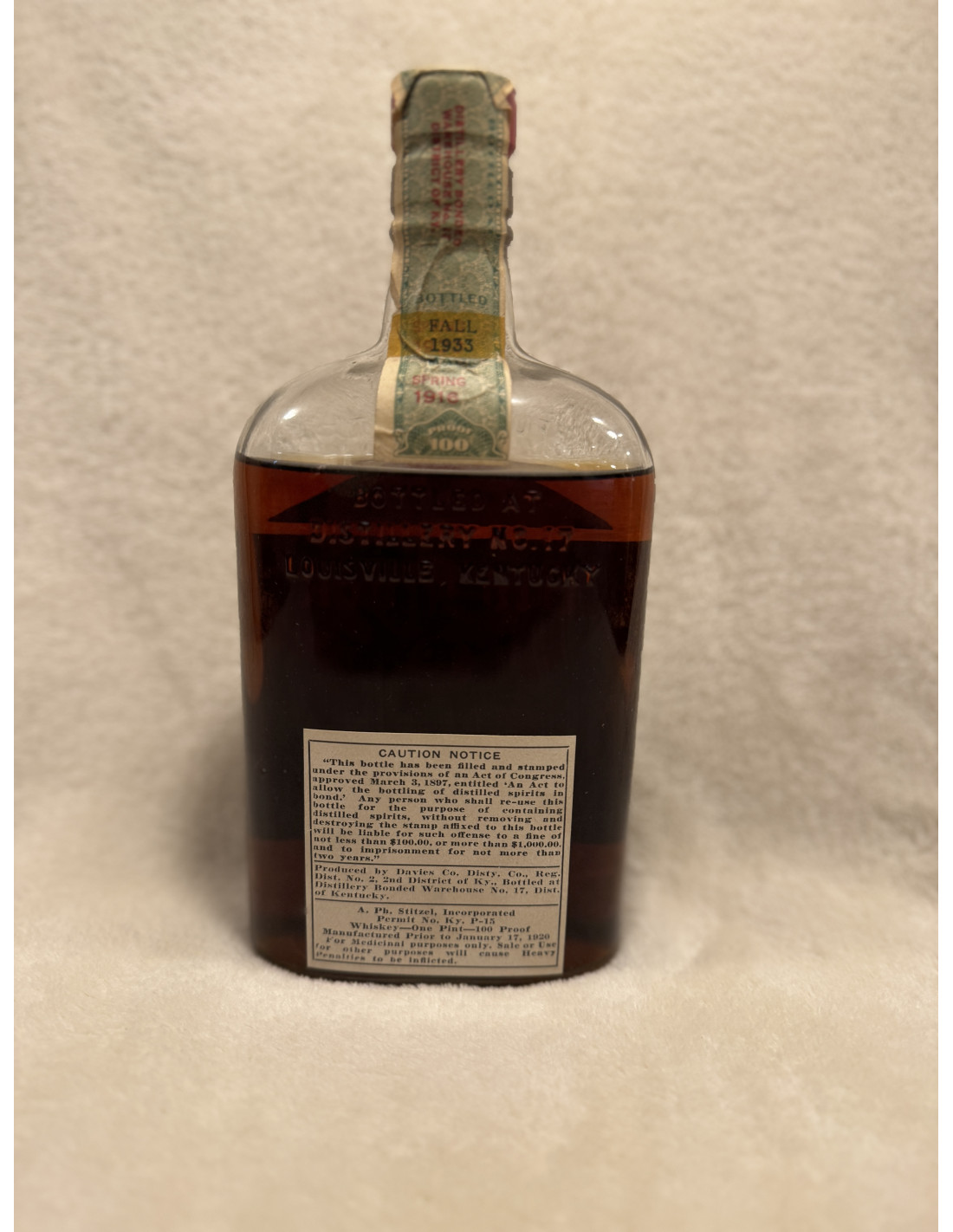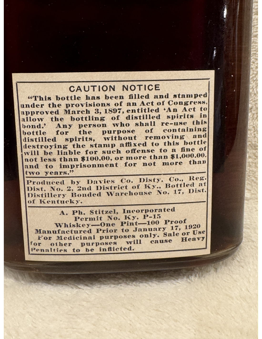 - CAUTION NOTICE - "This bottle has been filled and stamped under the provisions of an Act of Congress approved March 3, 1897, entitled 'An Act to allow the bottling of distilled spirits in bond'. Any person who shall reuse this distilled spi...