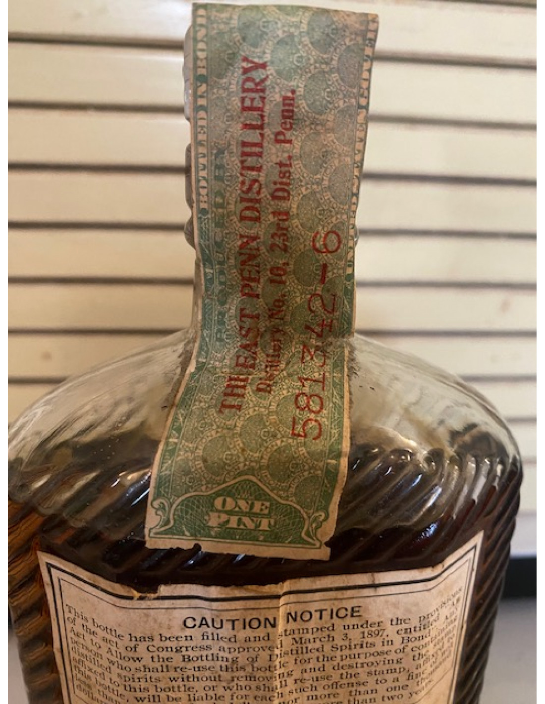 - Bottled in bond under the supervision of the United States government Produced By The East Penn Distillery, Distillery No. 10, 23rd Dist. Penn. 581342-6 One Pint Distillery Bonded Warehouse No. 27 District of MD In Bonded Warehouse 100 Proo...