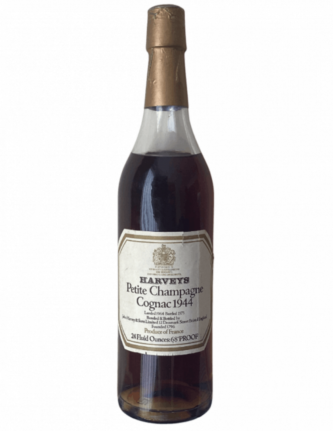 - Harveys Petite Champagne Cognac 1944. Landed 1964 bottled 1975 Bonded and bottled by John Harvey & sons Limited 12 Denmark Street, Bristol England Founded 1796 Produce of France 24 Fluid Ounces 68% Proof