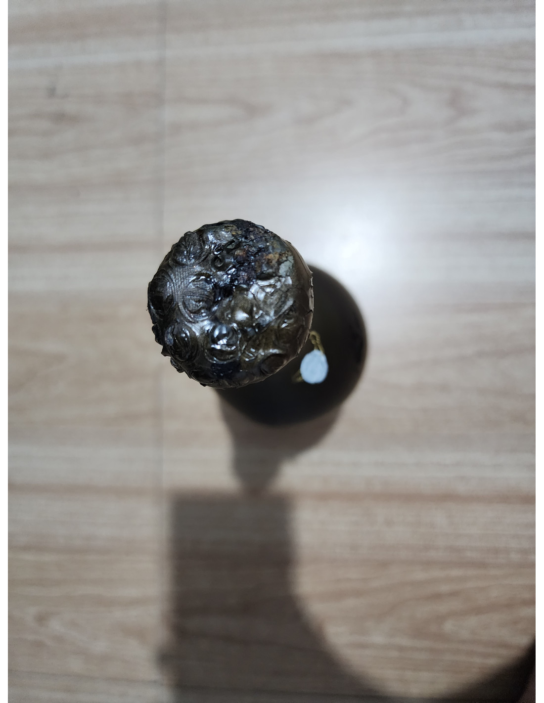 Neck/Capsule: A dark, textured, wax-like capsule covers the cork and extends down the neck, appearing somewhat distressed. A small, chained medal or tag is attached to the capsule just below the cork.