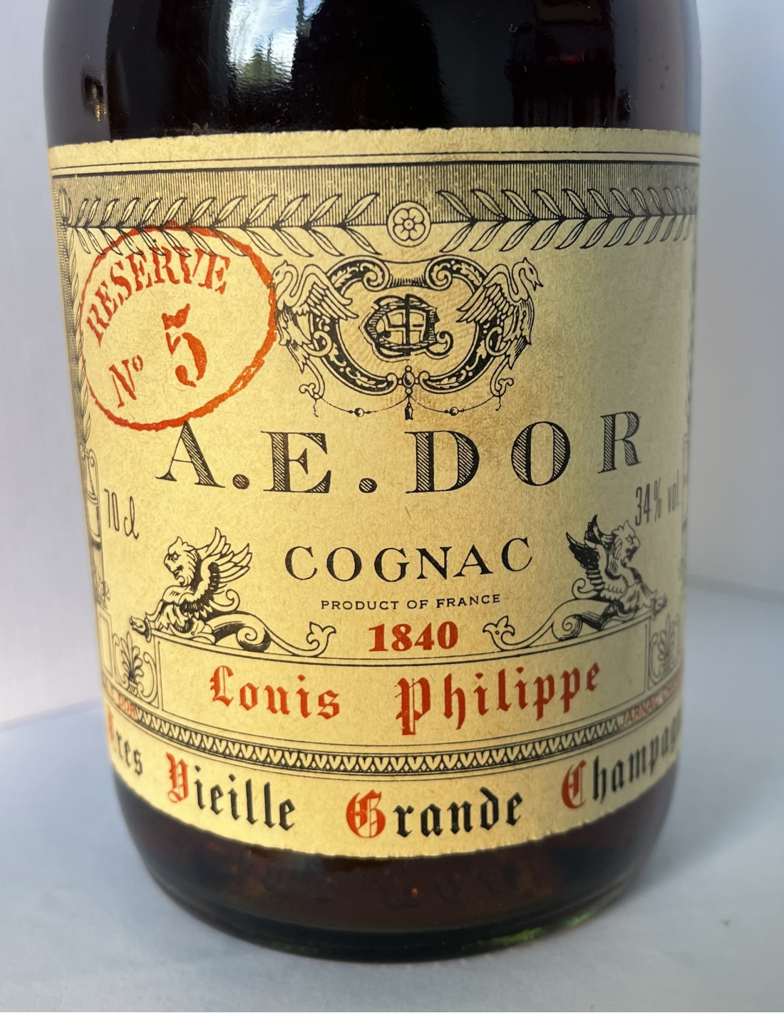- RESERVE No 5; A.E. DOR; 70 cl; 34 % vol.; COGNAC; PRODUCT OF FRANCE; Cognac; 1849; Louis Philippe; A.E.DOR; JARNAC CHARENTE, Tres Vieille Grande Champagne