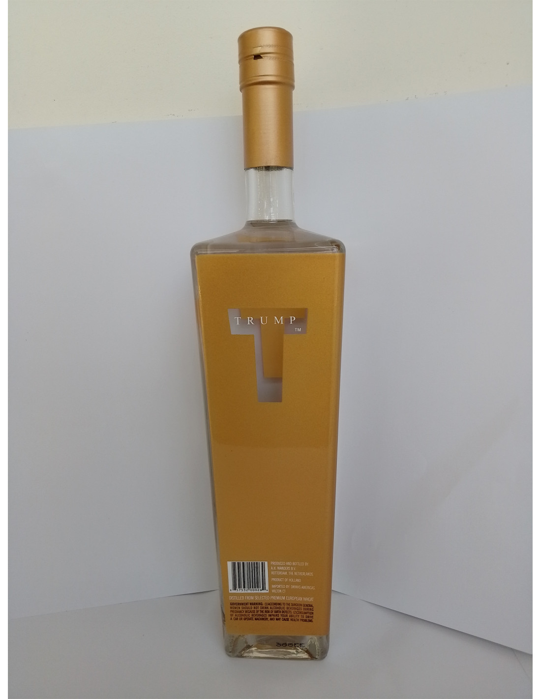 - Front Label: TRUMP, SUPER PREMIUM VODKA, T logo, 1 LITER, 40% ALC./VOL. (80 PROOF). Back Label: PRODUCED AND BOTTLED BY A.H. WANDERS B.V. ROTTERDAM, THE NETHERLANDS. PRODUCT OF HOLLAND. IMPORTED BY DRINKS AMERICAS WILTON CT. DISTILLED FROM ...