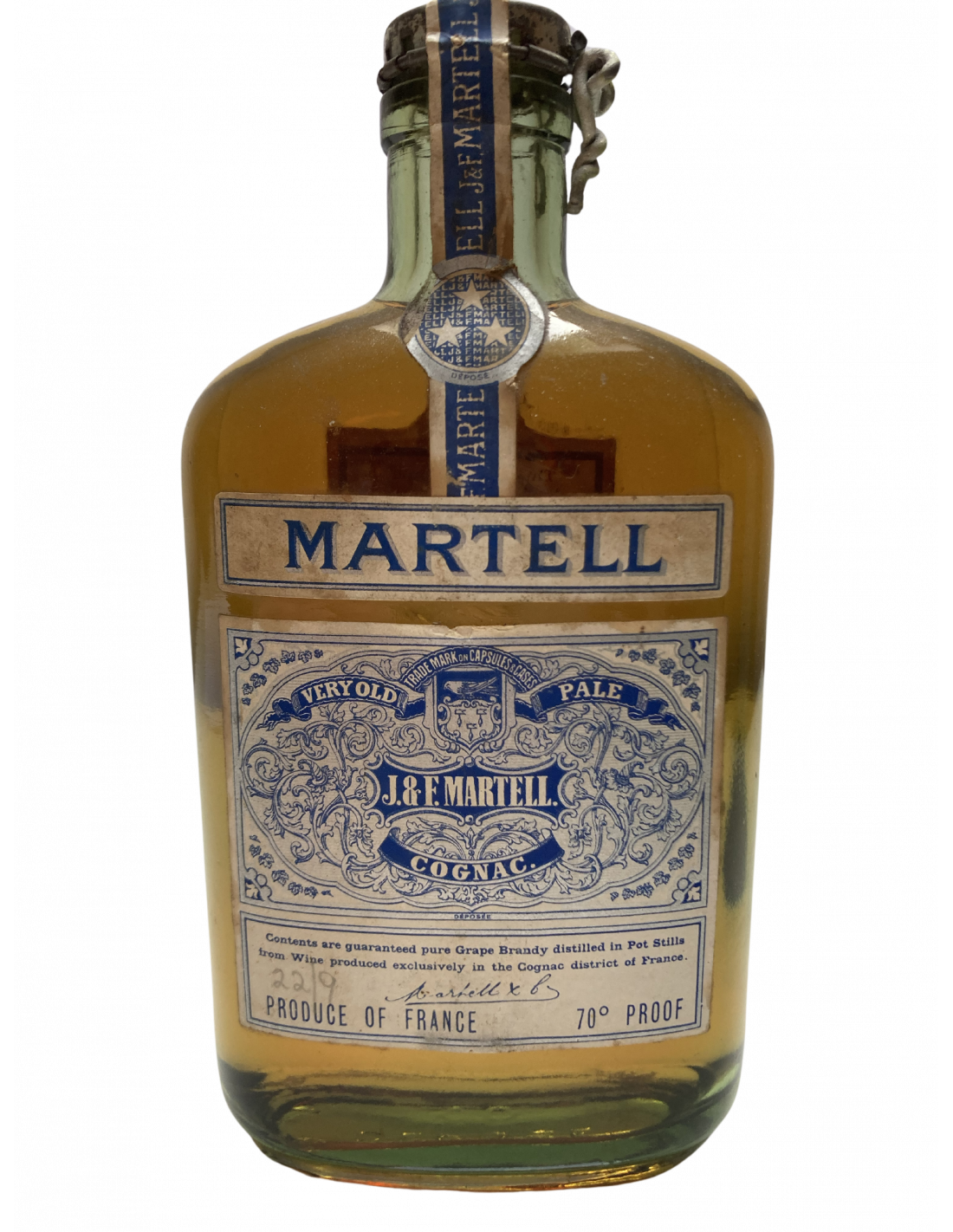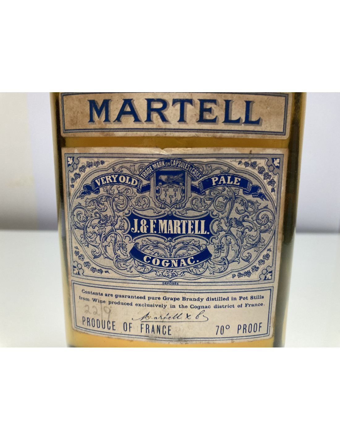 - Martell Very Old Pale J.&F.MARTELL. Cognac Contents are guaranteed pure Grape Brandy distilled in Pot Stills from Wine produced exclusively in the Cognac district of France. 22/9(written in pencil) Produce of France 70 Proof