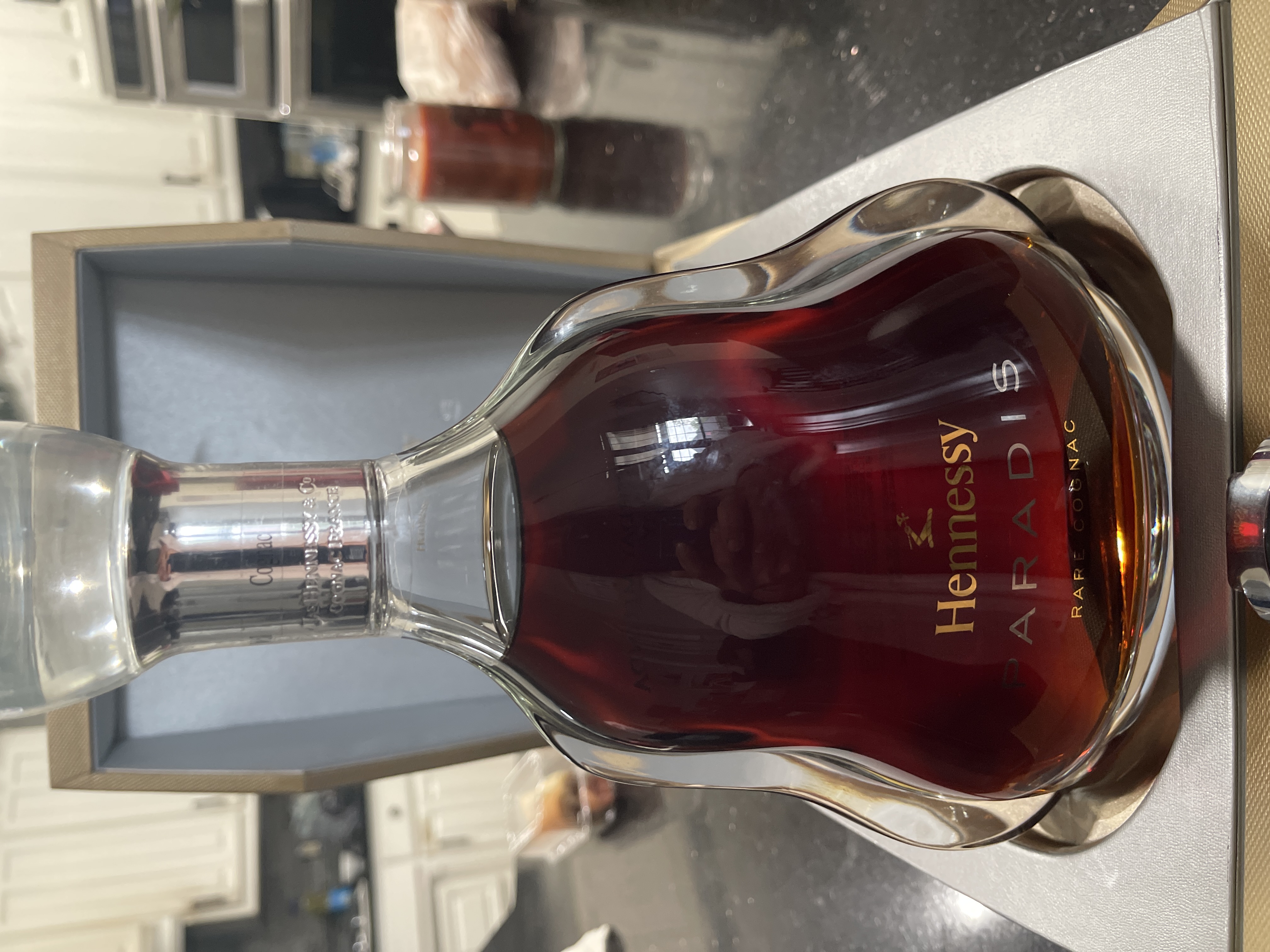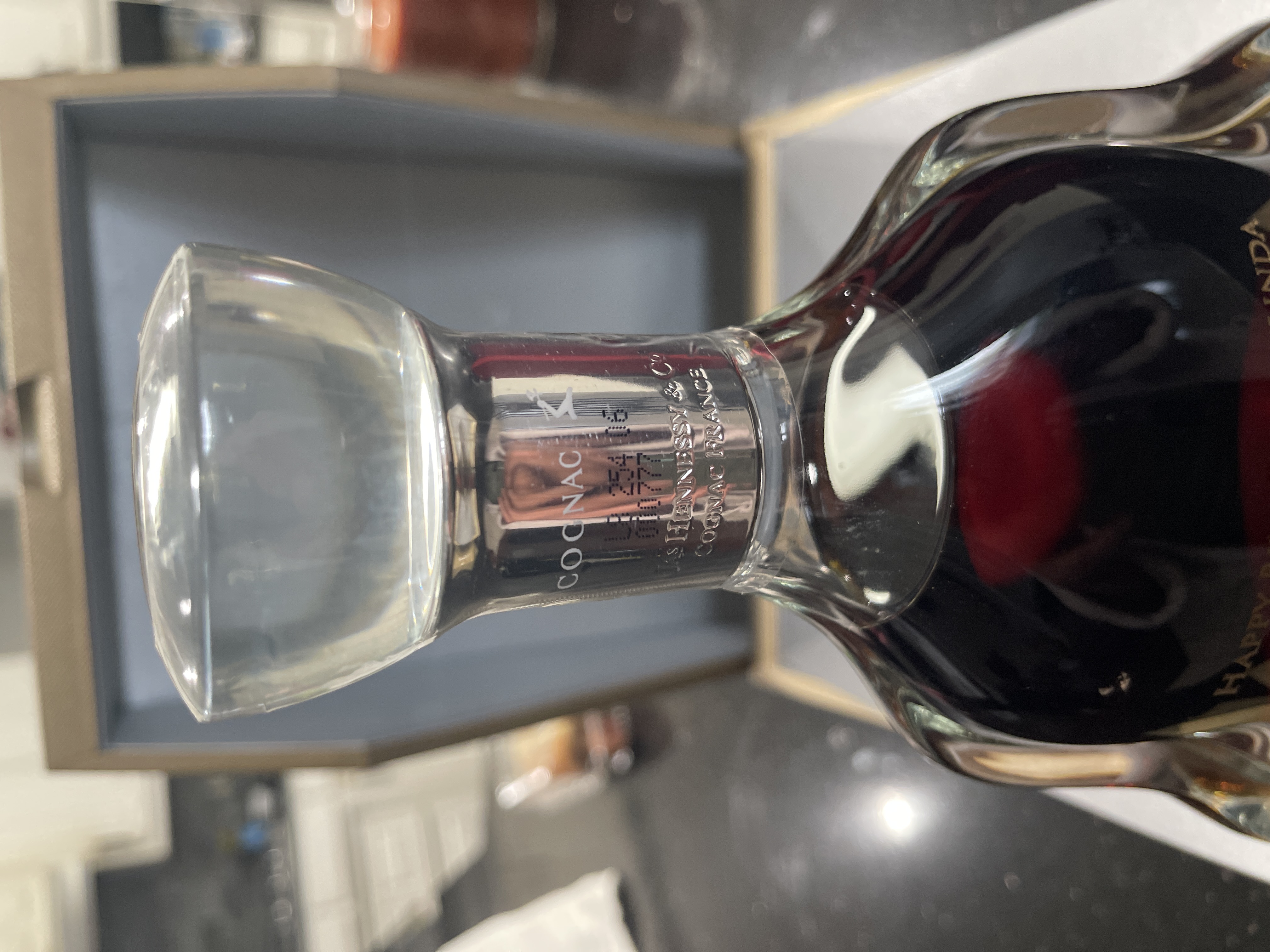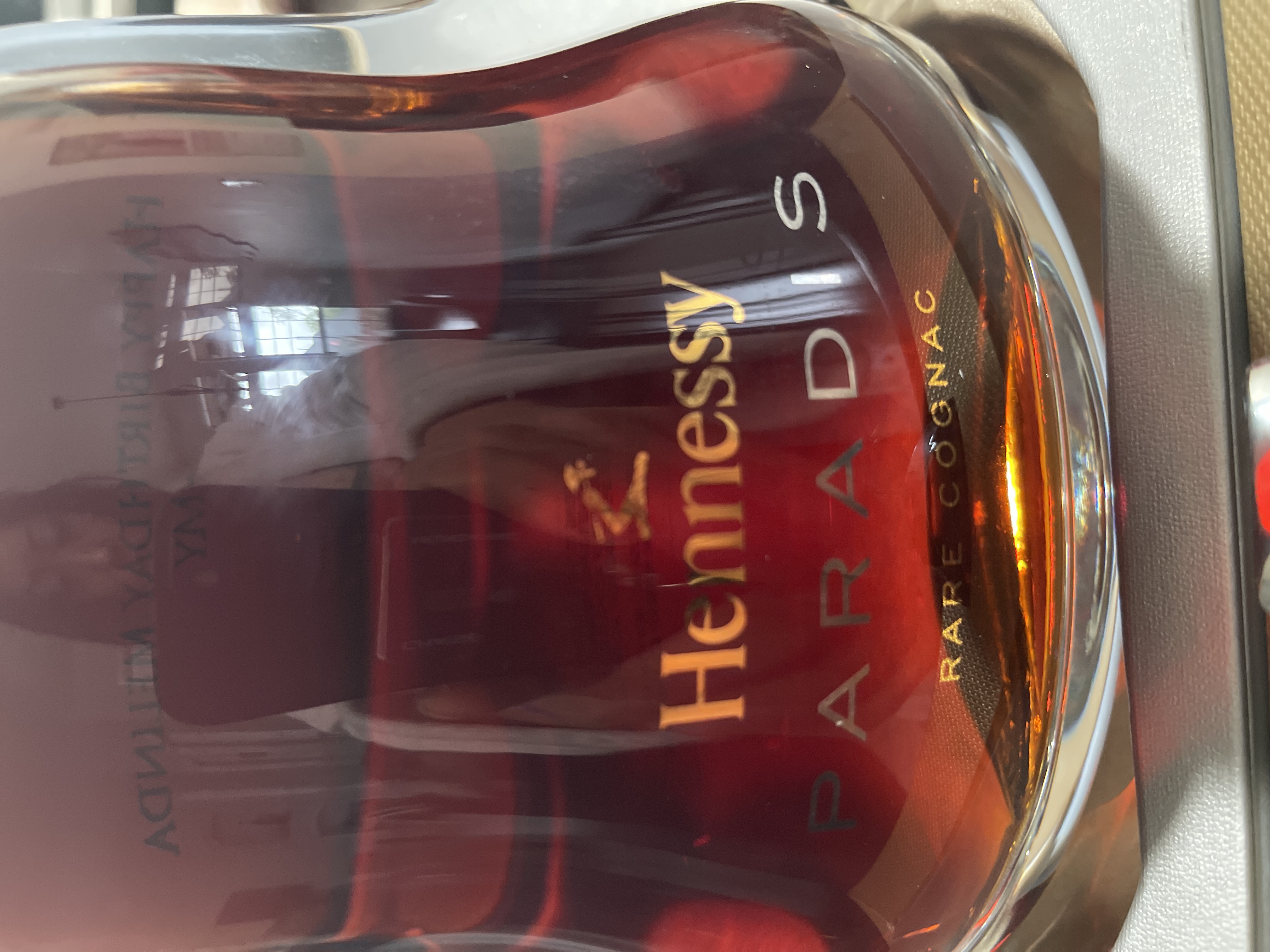 - 1) Text on label: Front of bottle (embossed/printed on glass): Hennessy PARADIS RARE COGNAC Personalized etching on glass: HAPPY BIRTHDAY MELINDA -MY Neck foil/band: COGNAC LE 23416 LOT 111777 JAS HENNESSY & C° COGNAC FRANCE Back label (small white sticker): Hennessy Paradis Grande Champagne, Petite Champagne, Borderies, Fins Bois Selected from the Hennessy Reserve, Hennessy Paradis is a delicate blend of over one hundred very old eau de vie. Matured over many years in our cellars, this rare cognac is presented in a luxurious bottle by Hennessy. Paradis embodies the harmony and finesse of a classic blend. 40% alc./vol. (80 PROOF) 750 ml PRODUCT OF FRANCE PRODUCED AND BOTTLED BY JAS HENNESSY & C° - COGNAC (FRANCE) IMPORTED BY MOËT HENNESSY USA, INC., NEW YORK, NY. DISTRIBUTED BY M. IMPORTERS PLEASE DRINK RESPONSIBLY GOVERNMENT WARNING: (text below unreadable) Inside Stopper (embossed): JAS HENNESSY & C° COGNAC (with Fillioux axe emblem) Box (front): Hennessy PARADIS RARE COGNAC 2) Visual elements: Graphics: The Fillioux axe emblem appears on the upper label (above "Hennessy" on the bottle), faintly embossed on the neck foil, and embossed inside the glass stopper. It also appears on the front of the box. A metallic silver band encircles the neck of the bottle below the stopper. Font Styles: "Hennessy" is in a stylized script/cursive font with a golden color. "PARADIS" is in large, sans-serif, block letters, appearing silver/grey. "RARE COGNAC" is in smaller, sans-serif, block letters, golden in color. The text on the neck foil, back label, and the personalized etching are primarily in sans-serif block letters. 3) Fill level estimate: well above shoulder into neck: great