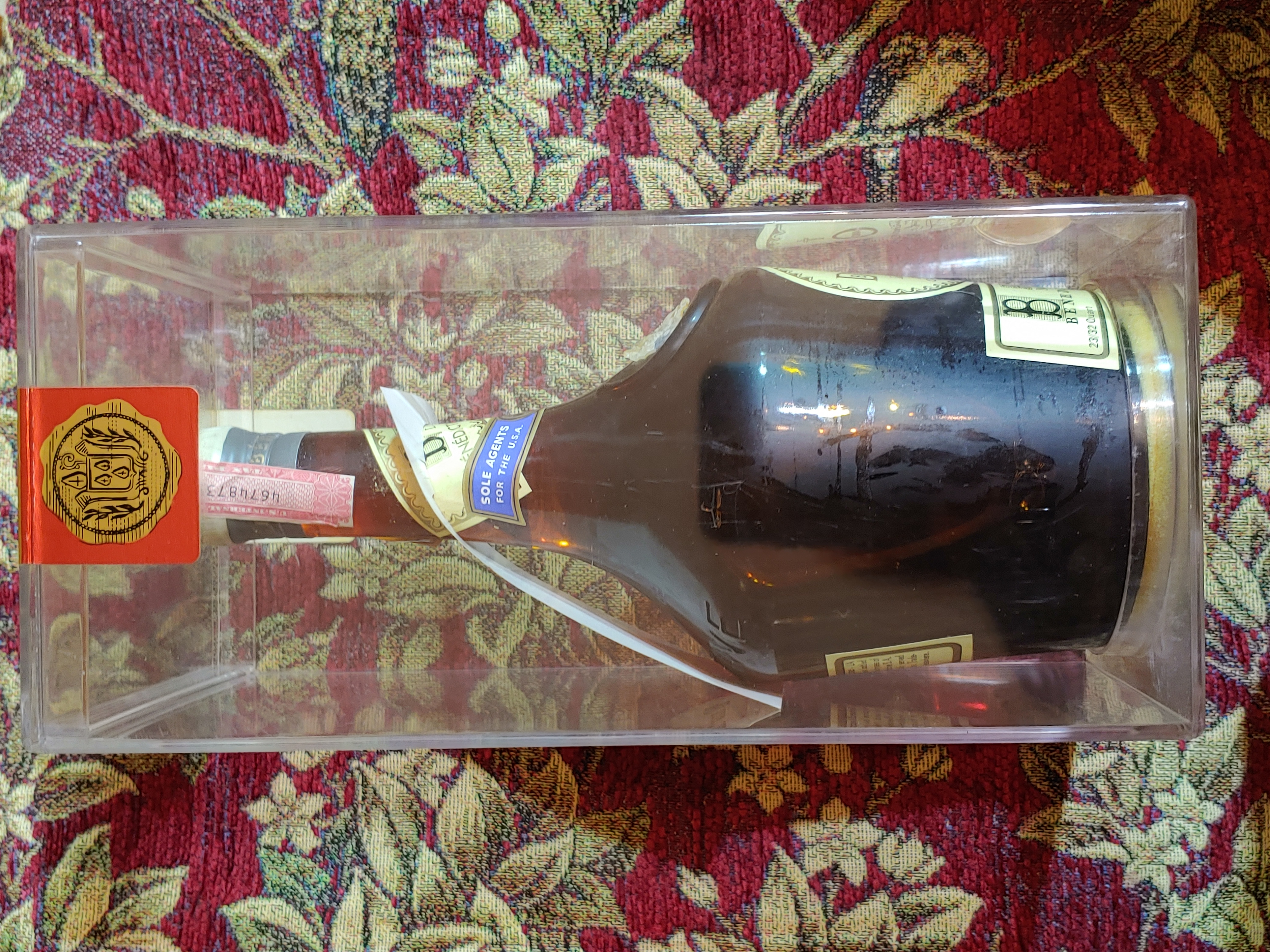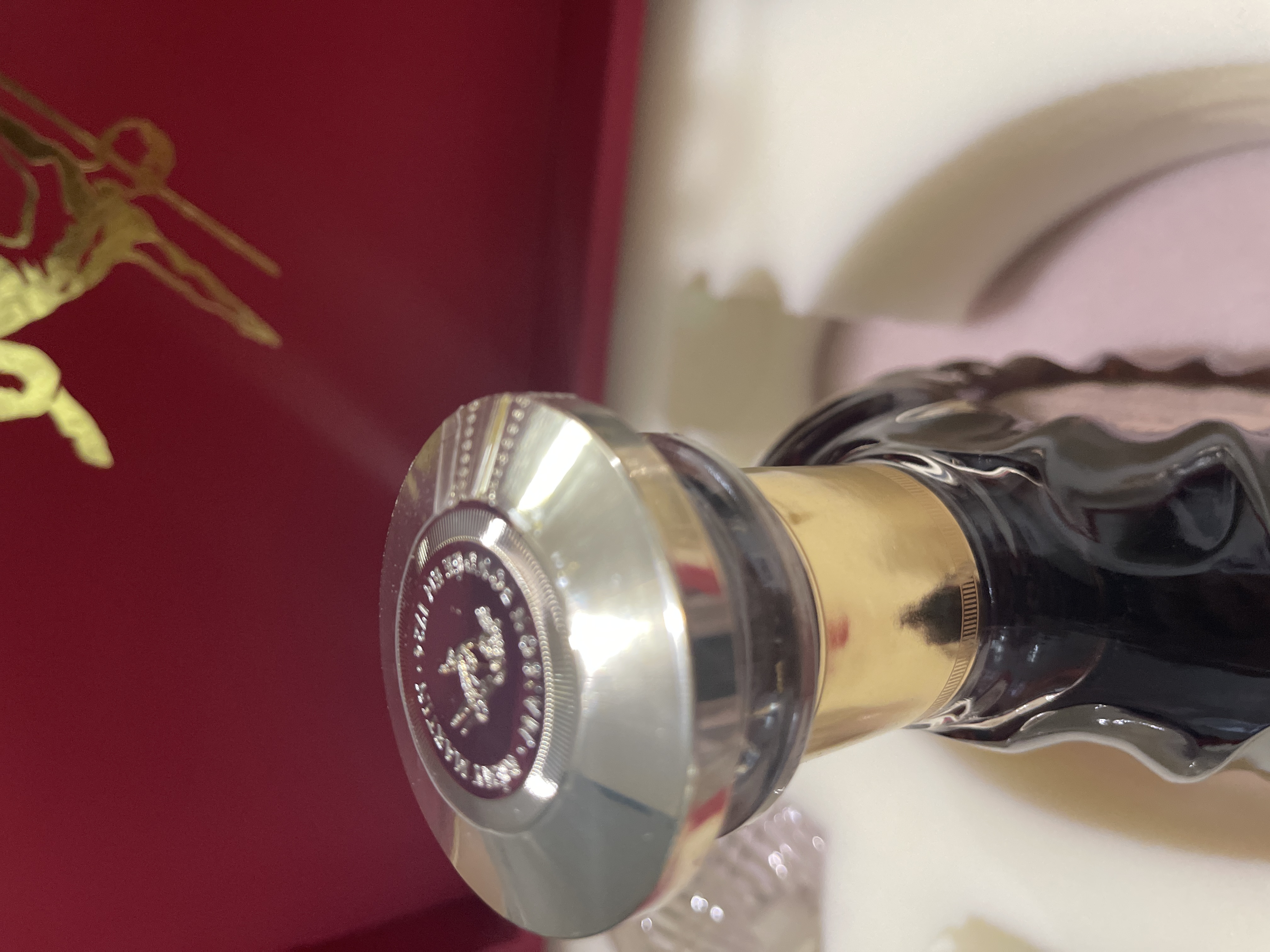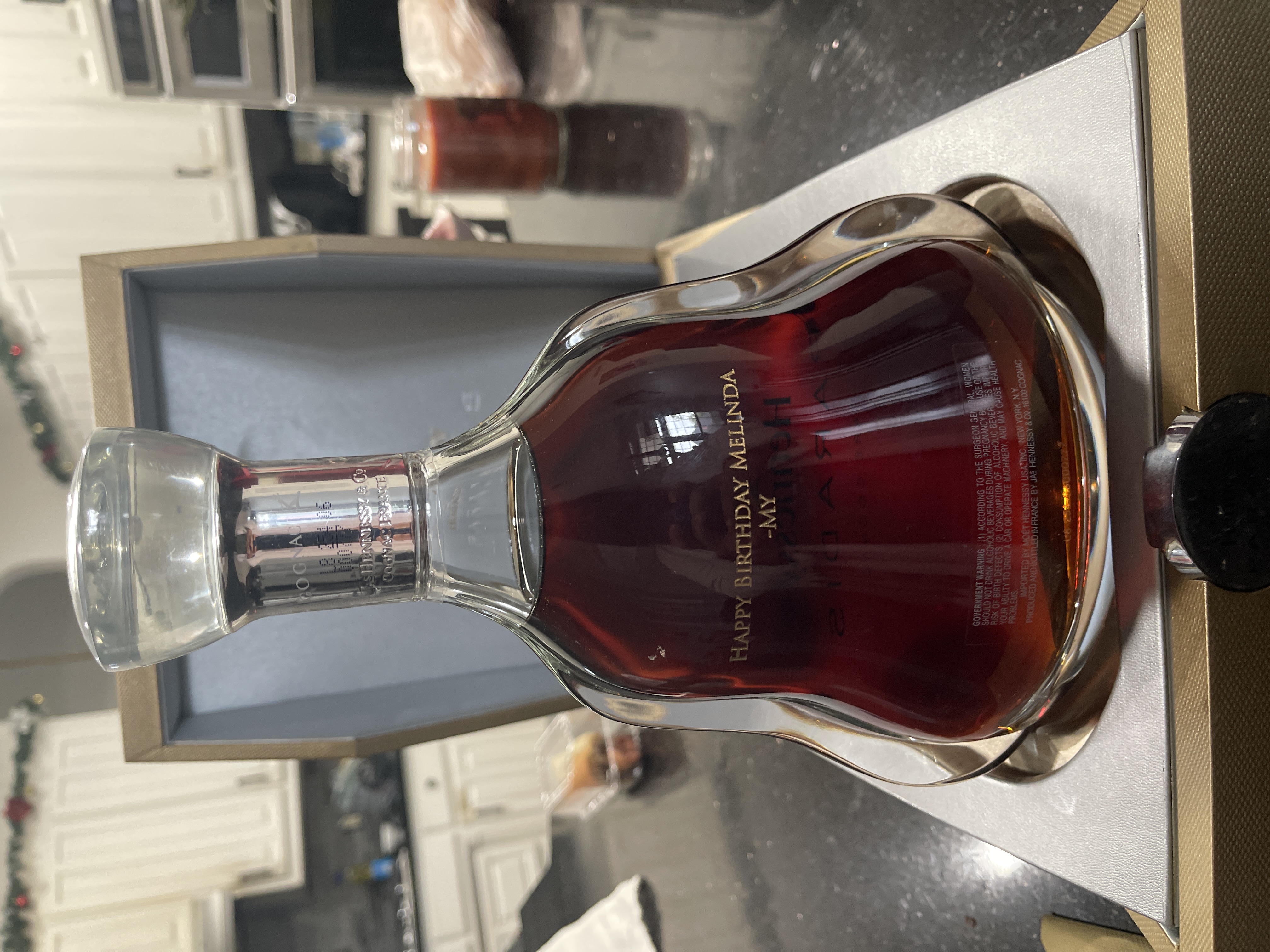 - 1) Text on label: Front of bottle (embossed/printed on glass): Hennessy PARADIS RARE COGNAC Personalized etching on glass: HAPPY BIRTHDAY MELINDA -MY Neck foil/band: COGNAC LE 23416 LOT 111777 JAS HENNESSY & C° COGNAC FRANCE Back label (small white sticker): Hennessy Paradis Grande Champagne, Petite Champagne, Borderies, Fins Bois Selected from the Hennessy Reserve, Hennessy Paradis is a delicate blend of over one hundred very old eau de vie. Matured over many years in our cellars, this rare cognac is presented in a luxurious bottle by Hennessy. Paradis embodies the harmony and finesse of a classic blend. 40% alc./vol. (80 PROOF) 750 ml PRODUCT OF FRANCE PRODUCED AND BOTTLED BY JAS HENNESSY & C° - COGNAC (FRANCE) IMPORTED BY MOËT HENNESSY USA, INC., NEW YORK, NY. DISTRIBUTED BY M. IMPORTERS PLEASE DRINK RESPONSIBLY GOVERNMENT WARNING: (text below unreadable) Inside Stopper (embossed): JAS HENNESSY & C° COGNAC (with Fillioux axe emblem) Box (front): Hennessy PARADIS RARE COGNAC 2) Visual elements: Graphics: The Fillioux axe emblem appears on the upper label (above "Hennessy" on the bottle), faintly embossed on the neck foil, and embossed inside the glass stopper. It also appears on the front of the box. A metallic silver band encircles the neck of the bottle below the stopper. Font Styles: "Hennessy" is in a stylized script/cursive font with a golden color. "PARADIS" is in large, sans-serif, block letters, appearing silver/grey. "RARE COGNAC" is in smaller, sans-serif, block letters, golden in color. The text on the neck foil, back label, and the personalized etching are primarily in sans-serif block letters. 3) Fill level estimate: well above shoulder into neck: great