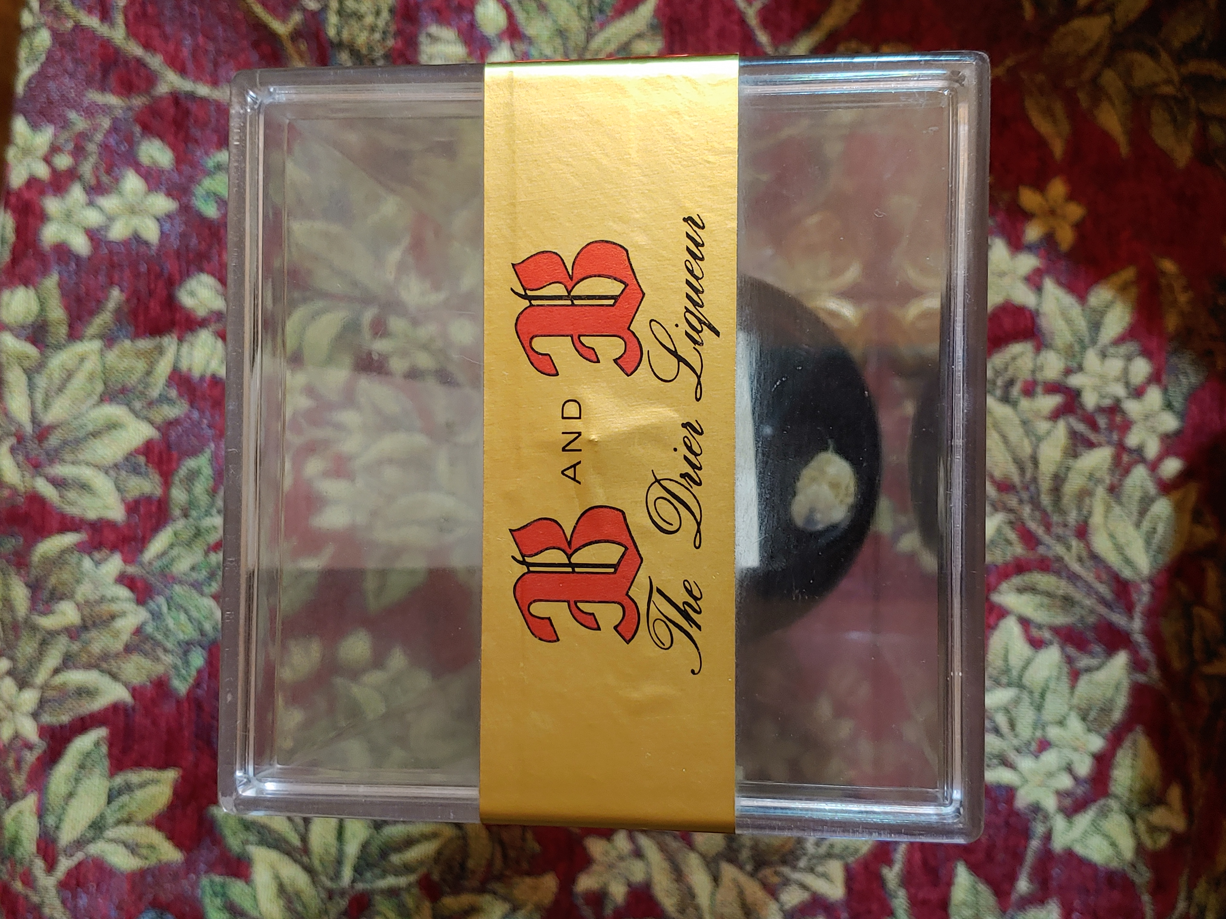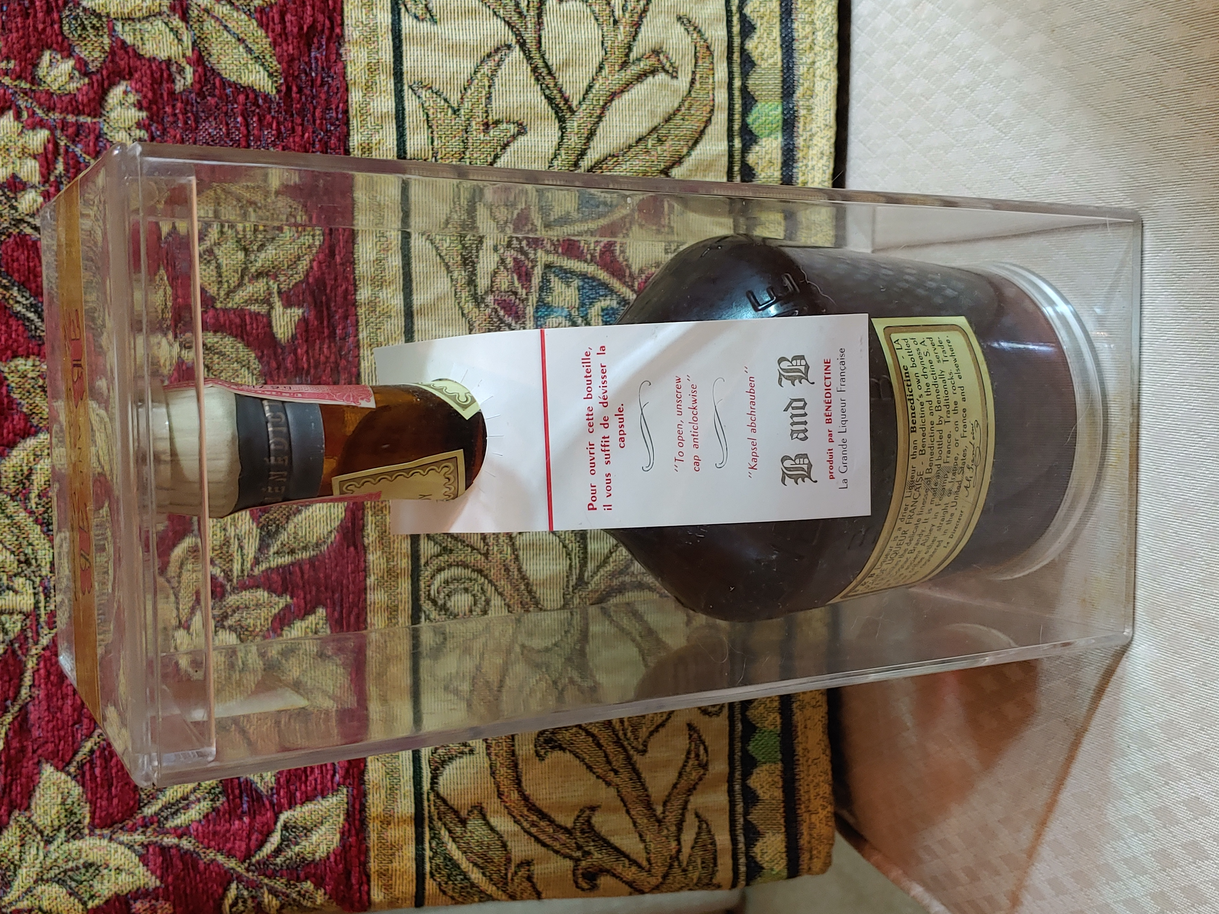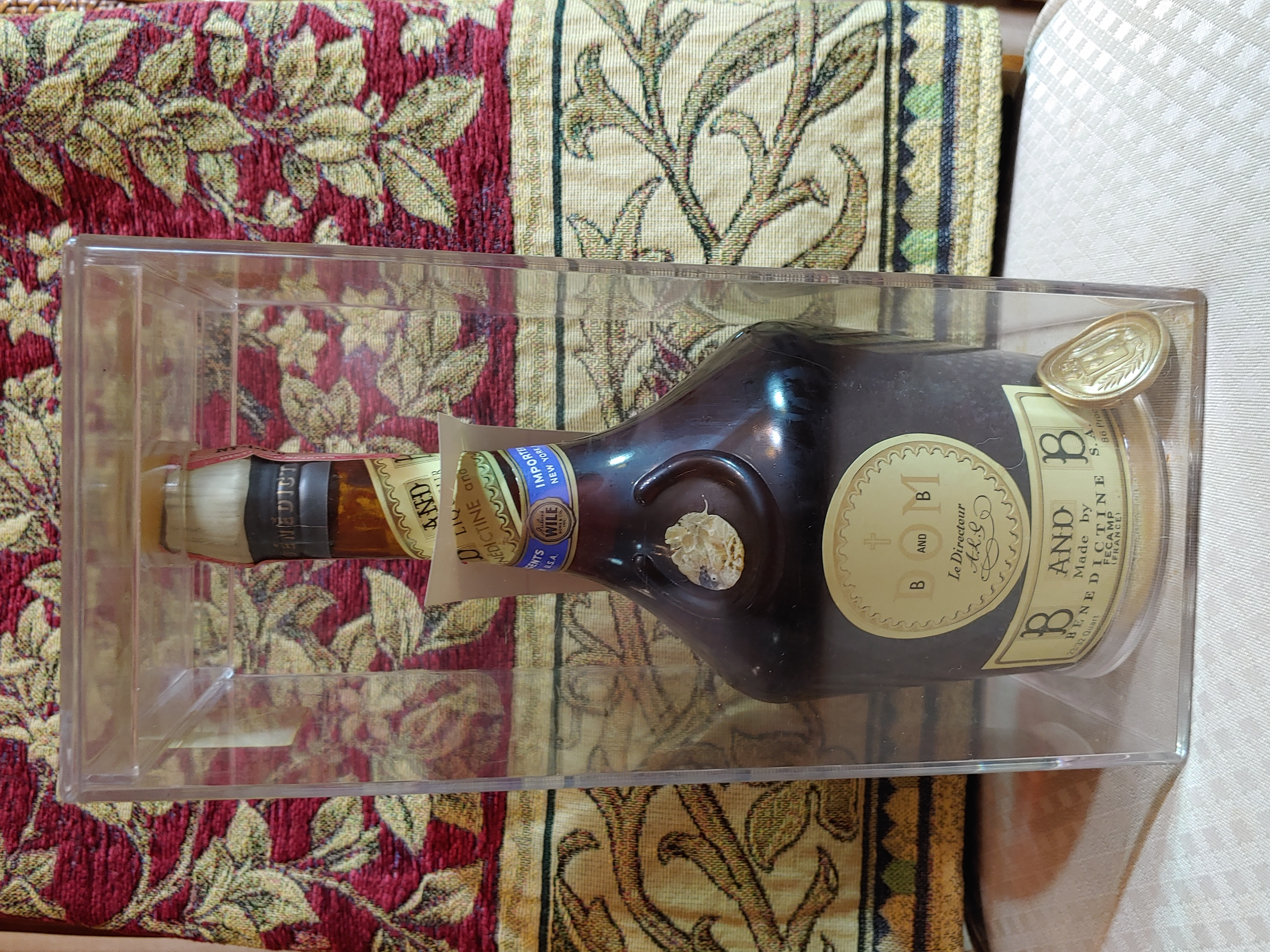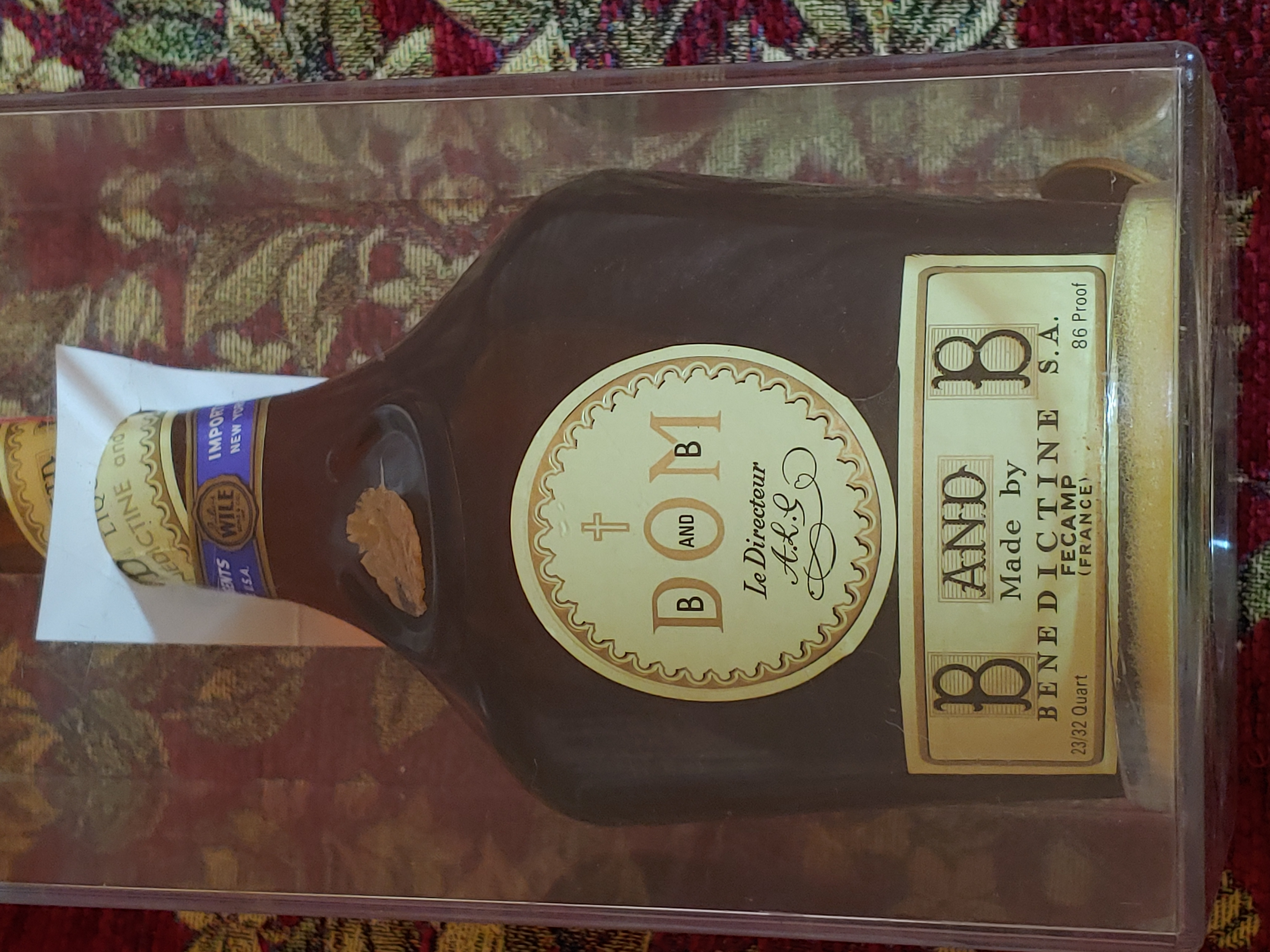 - 1) Text on label: Main Labels (Front): D.O.M B AND B Le Directeur A. Lé. [signature] B AND B S.A. BENEDICTINE Made by FÉCAMP (FRANCE) 86 Proof 23/32 Quart Neck Label (Blue & White Strip): WILE IMPORTERS SINCE 1877 SOLE AGENTS FOR THE U.S.A. Hang Tag (White, around neck): Pour ouvrir cette bouteille il vous suffit d'enlever la capsule. "To open, unscrew cap anticlockwise." "Kapsel abschrauben." B and B Produit par BÉNÉDICTINE La Grande Liqueur Française Back Label (partially visible): PRODUCED BY S.A. BENEDICTINE FECAMP (FRANCE) PRODUCT OF FRANCE Top of Box Label (Gold): B AND B The Drier Liqueur Red Tax Band: U.S. INTERNAL REVENUE TAX PAID SERIES 112 4674873 Gold Wax Seal (on bottle shoulder): B [embossed] 2) Visual elements: The bottle is a distinctive dark brown glass, flattened flask-like shape. Main labels: The mid-label is circular with a scalloped edge, featuring a prominent cross symbol above "D.O.M." and a stylized signature. It partially overlaps with a rectangular lower front label. Both main labels are beige/gold with decorative borders. Neck label: A small blue and white strip is wrapped around the neck. Hang tag: A white, folded paper tag hangs from the neck, providing multi-lingual opening instructions and product information. Wax seal: A gold circular wax seal, embossed with a "B", is affixed to the bottle's shoulder. Tax band: A red U.S. Internal Revenue Tax Paid strip is wrapped over the cork/capsule and part of the neck. Box label: A gold strip on the top of the plastic presentation box features a repeating red "B AND B" monogram. Font styles: The main "B AND B" text uses a highly stylized, decorative serif font. "D.O.M" is in a serif font. "Le Directeur," the signature, and "The Drier Liqueur" on the box are in a cursive/script style. Other smaller texts (e.g., "BENEDICTINE," "86 Proof," "WILE") are generally in clear sans-serif or simple serif fonts, while the tax band uses a block/sans-serif style. 3) Fill level estimate: well above shoulder into neck: great