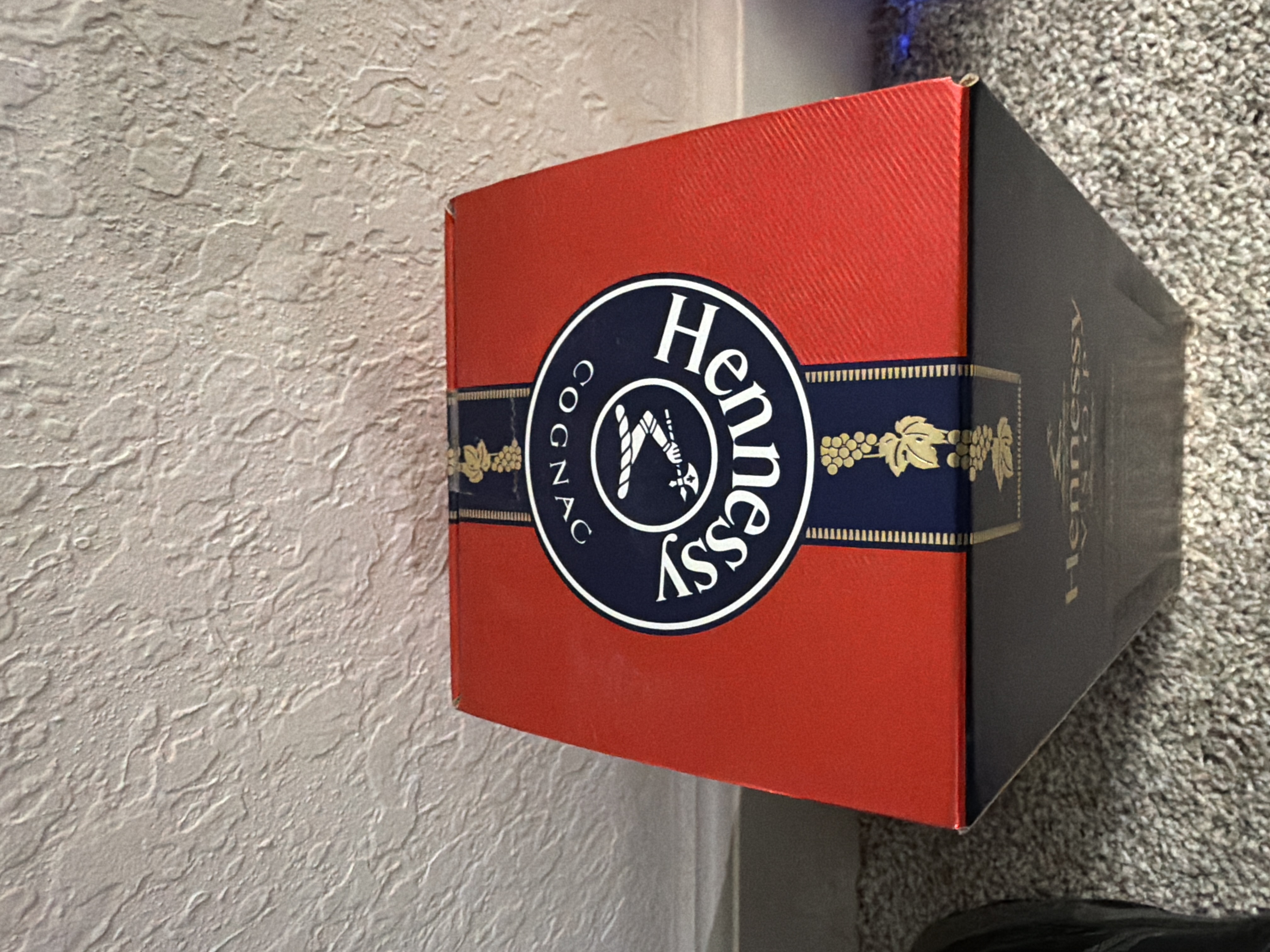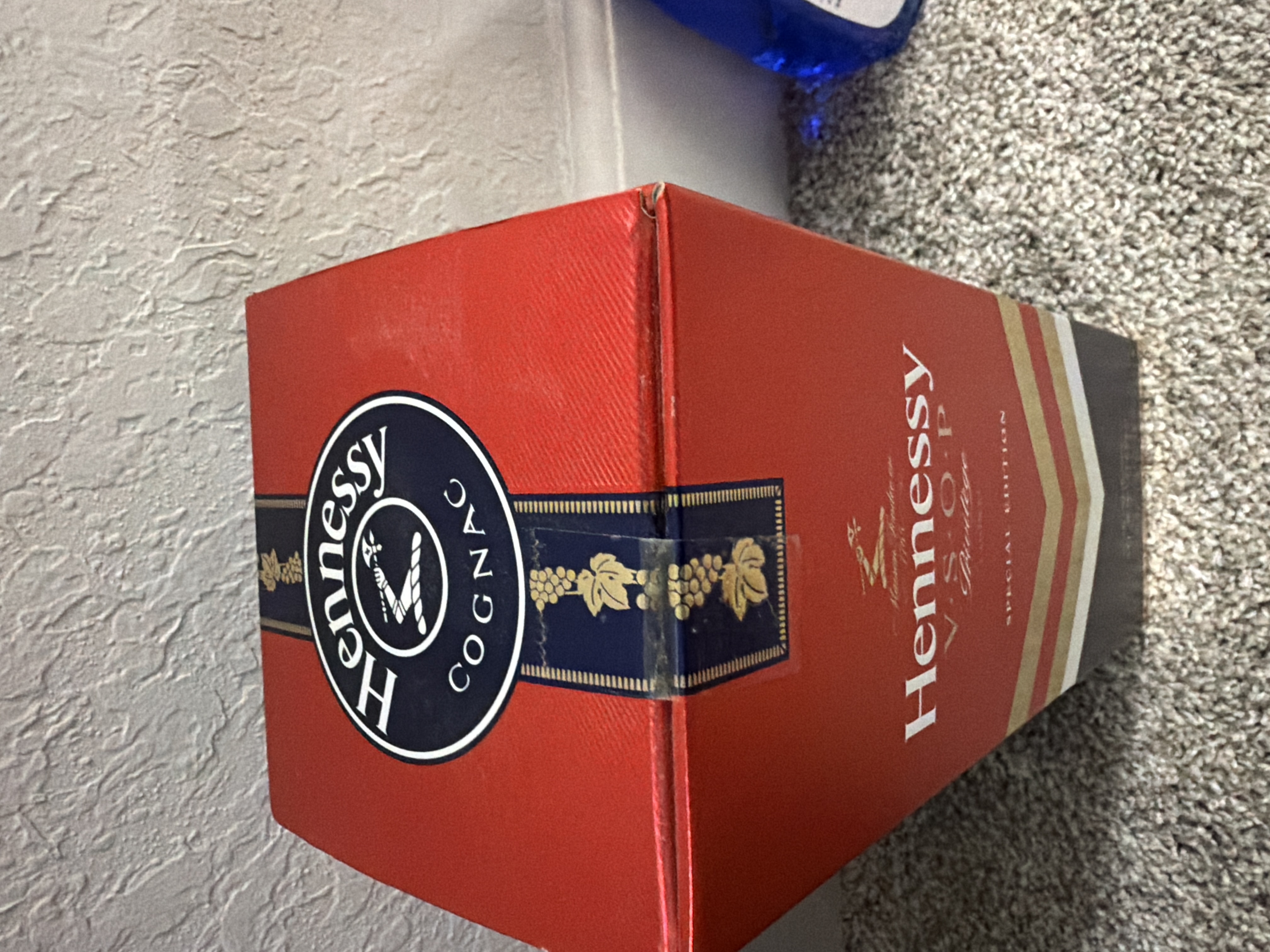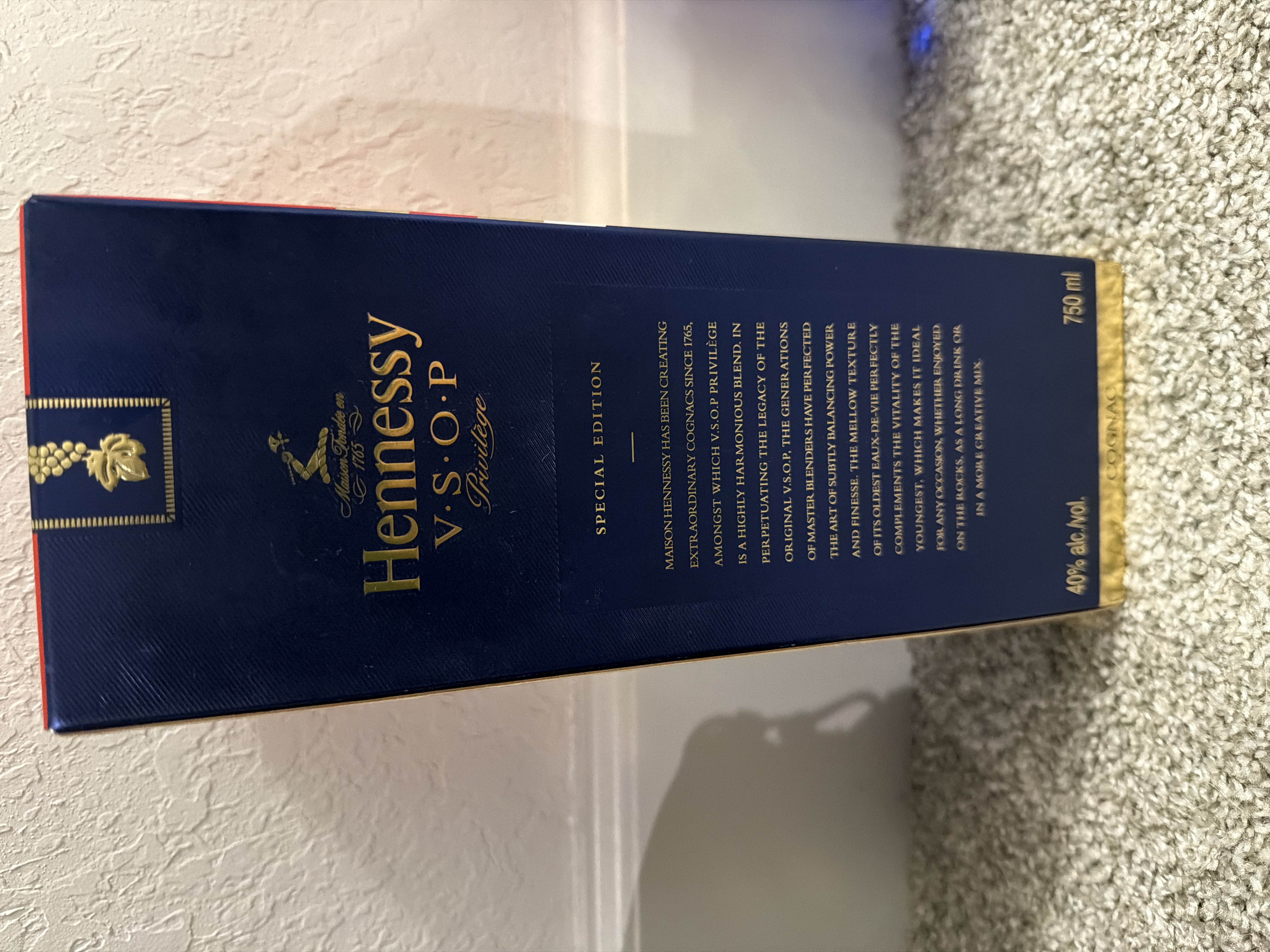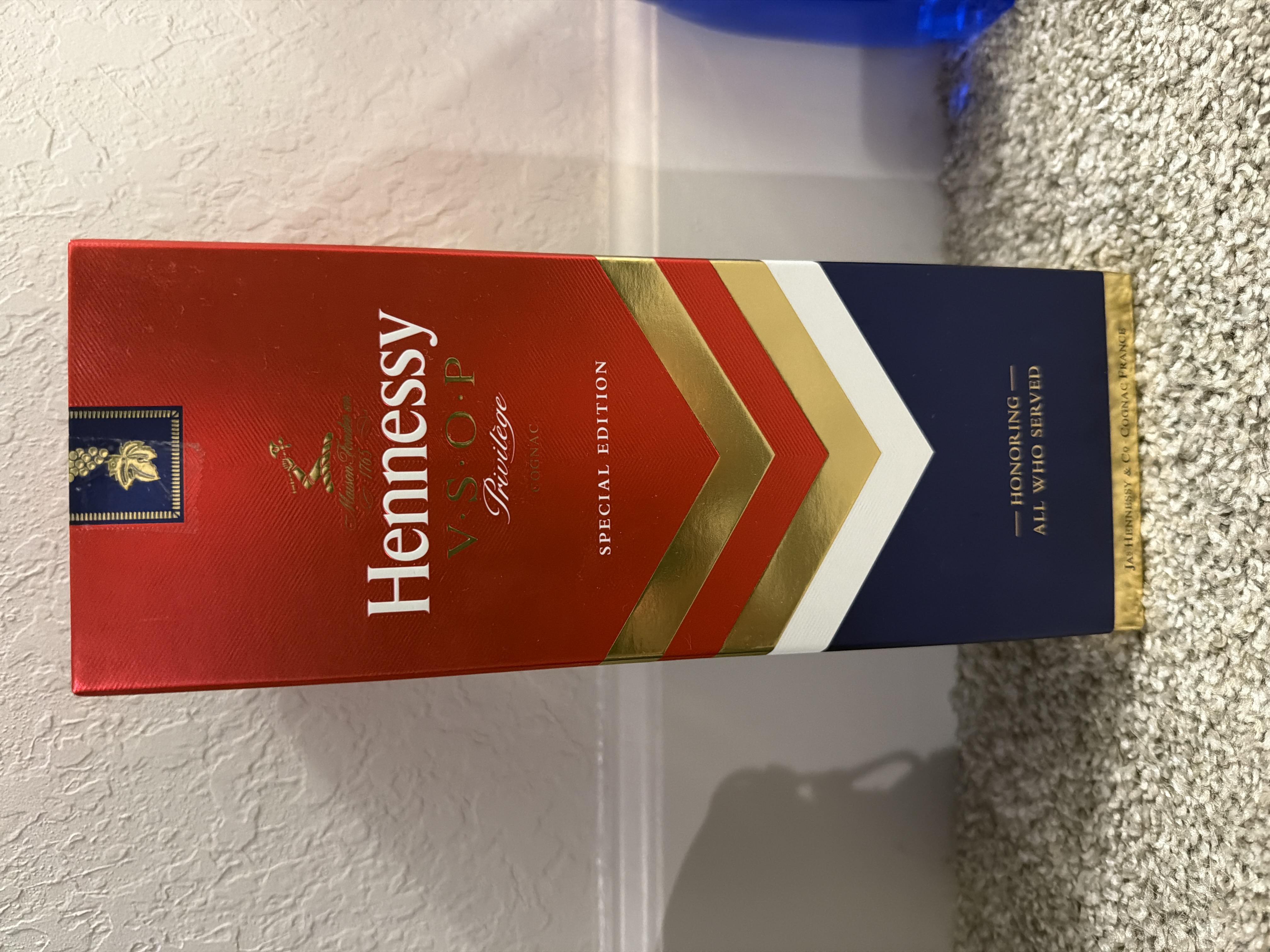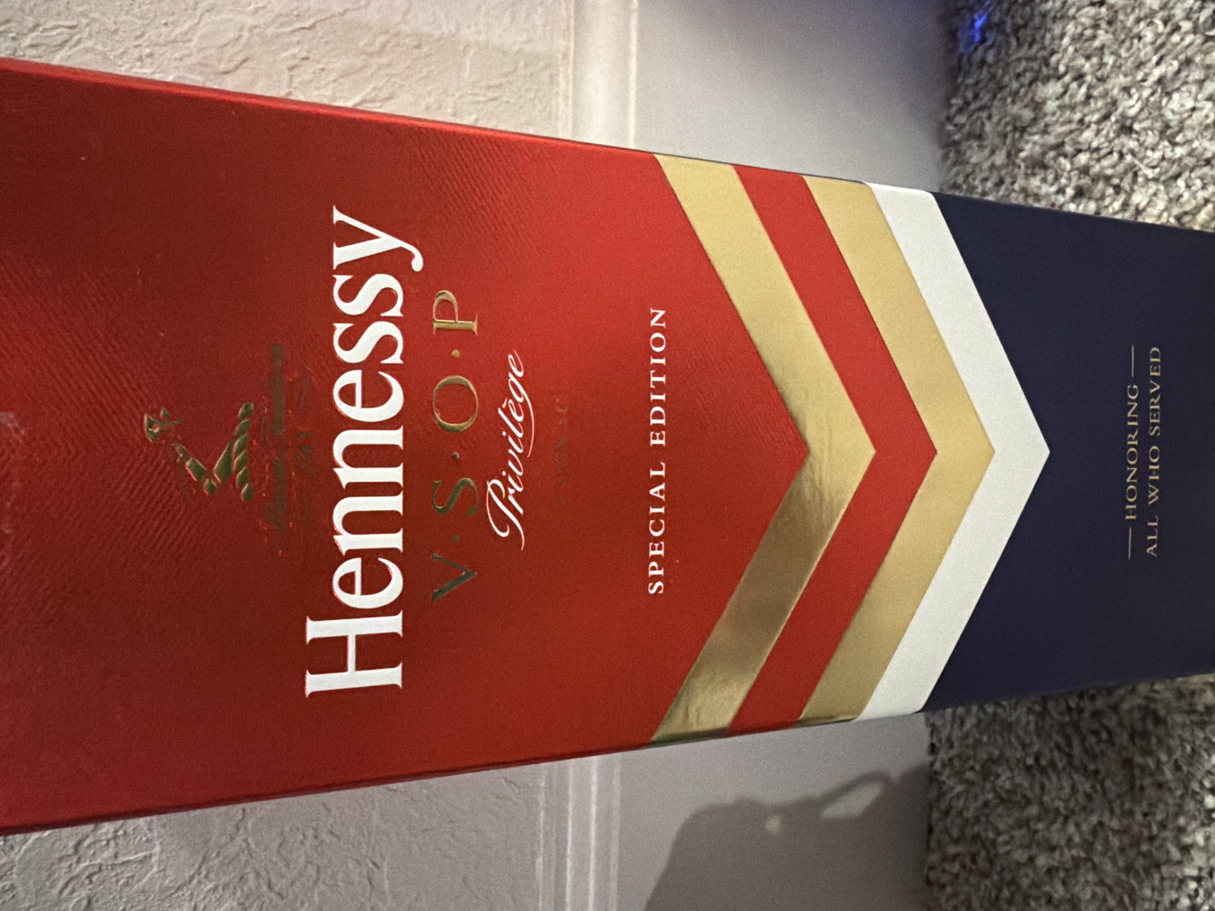 - 1) Text on label: Front Panel: Maison Fondée en 1765 Hennessy V•S•O•P Privilege COGNAC SPECIAL EDITION — HONORING — ALL WHO SERVED JAS. HENNESSY & Co. COGNAC FRANCE Back Panel: Maison Fondée en 1765 Hennessy V•S•O•P Privilege COGNAC SPECIAL EDITION MAISON HENNESSY HAS BEEN CREATING EXTRAORDINARY COGNACS SINCE 1765, AMONGST WHICH V.S.O.P PRIVILÈGE IS A RICHLY HARMONIOUS BLEND. IN PERPETUATING THE LEGACY OF THE ORIGINAL V.S.O.P, THE GENERATIONS OF MASTER BLENDERS HAVE PERFECTED THE ART OF SUBTLY BALANCING POWER AND FINESSE. THE MELLOW TEXTURE OF PRIVILÈGE EAU-DE-VIE PERFECTLY COMPLEMENTS THE VITALITY OF THE YOUNGEST, WHICH MAKES IT IDEAL FOR ANY OCCASION, WHETHER ENJOYED ON THE ROCKS, AS A LONG DRINK OR IN A MORE CREATIVE MIX. 40% alc./vol. 750 ml Top of Box: Hennessy COGNAC Side of Box: V•S•O•P 2) Visual elements: Upper front/back panel: Features a gold grape cluster emblem at the very top, and below it, a stylized gold Bras Armé (an arm holding an axe) emblem, accompanied by "Maison Fondée en 1765". Mid to lower front/side panel: A striking red, gold, and white chevron/stripe pattern. Top of box: A circular navy blue label with the white Bras Armé emblem in its center, encircled by "Hennessy" and "COGNAC". A dark blue strip label with a repeating gold grape cluster and leaf pattern extends from the top, wrapping over the front and back edges. Apparent font style(s): "Hennessy" and the descriptive text on the back are serif. "V•S•O•P", "COGNAC", "SPECIAL EDITION", "HONORING ALL WHO SERVED", "JAS. HENNESSY & Co. COGNAC FRANCE", "40% alc./vol.", and "750 ml" are sans-serif. "Privilege" is in a cursive/script font. 3) Fill level estimate: Not applicable, as the image displays a product gift box, not the bottle itself.
