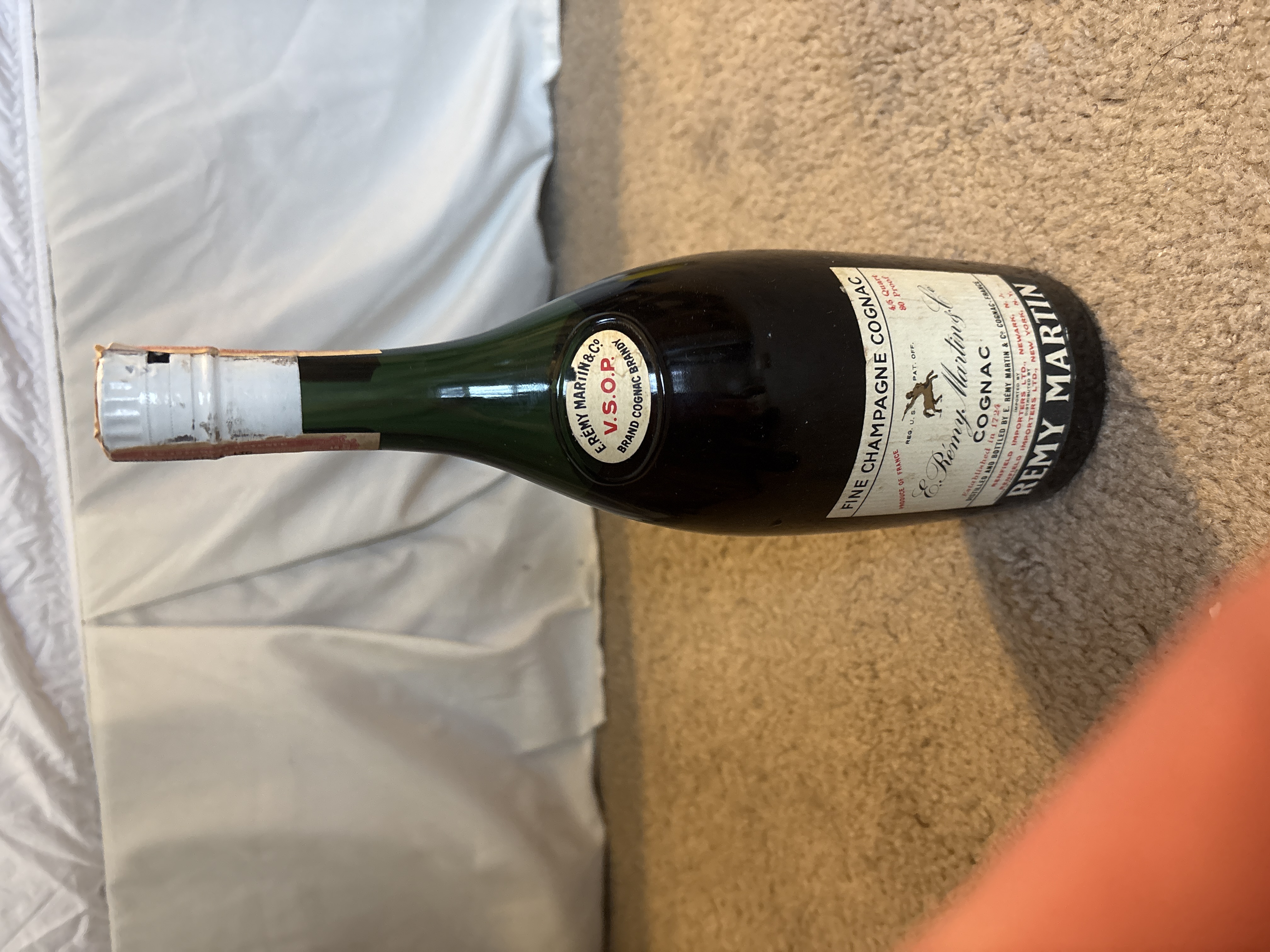 - 1) Text on label: FINE CHAMPAGNE COGNAC E. Remy Martin & Co COGNAC PRODUCT OF FRANCE 70 proof SOLE U. S. A. DISTRIBUTORS: RENFIELD IMPORTERS, LTD. NEWARK, N. J. NEW YORK, N. Y. IMPORTED BY E. RÉMY MARTIN & CO., COGNAC, FRANCE DISTILLED AND BOTTLED BY E. RÉMY MARTIN & CO., COGNAC, FRANCE RÉMY MARTIN E. REMY MARTIN & Co V.S.O.P. FINE CHAMPAGNE COGNAC REMY MARTIN MAP REPRESENTING VARIOUS CRUS and ROYAL RESIDENCY U.S. INTERNAL REVENUE SERIES 111 45269261 2) Visual elements: Mid label: Features the iconic Rémy Martin centaur emblem (half-man, half-horse holding a spear). Font styles include bold sans-serif (e.g., "FINE CHAMPAGNE COGNAC"), elegant cursive/script (e.g., "E. Remy Martin & Co"), and bold serif (e.g., "COGNAC", "RÉMY MARTIN"). Neck label: An oval medallion with block/serif-like font for "V.S.O.P." and sans-serif for other text. Back label: Contains a colored topographical map of the Cognac region with highlighted areas and a depiction of a royal residency. The main title is in a serif font. Neck/Capsule: A red-orange U.S. Internal Revenue tax strip, with a repeating pattern and a central seal-like stamp on top, wraps around a white capsule with red/gold details. 3) Fill level estimate: well above shoulder into neck: great