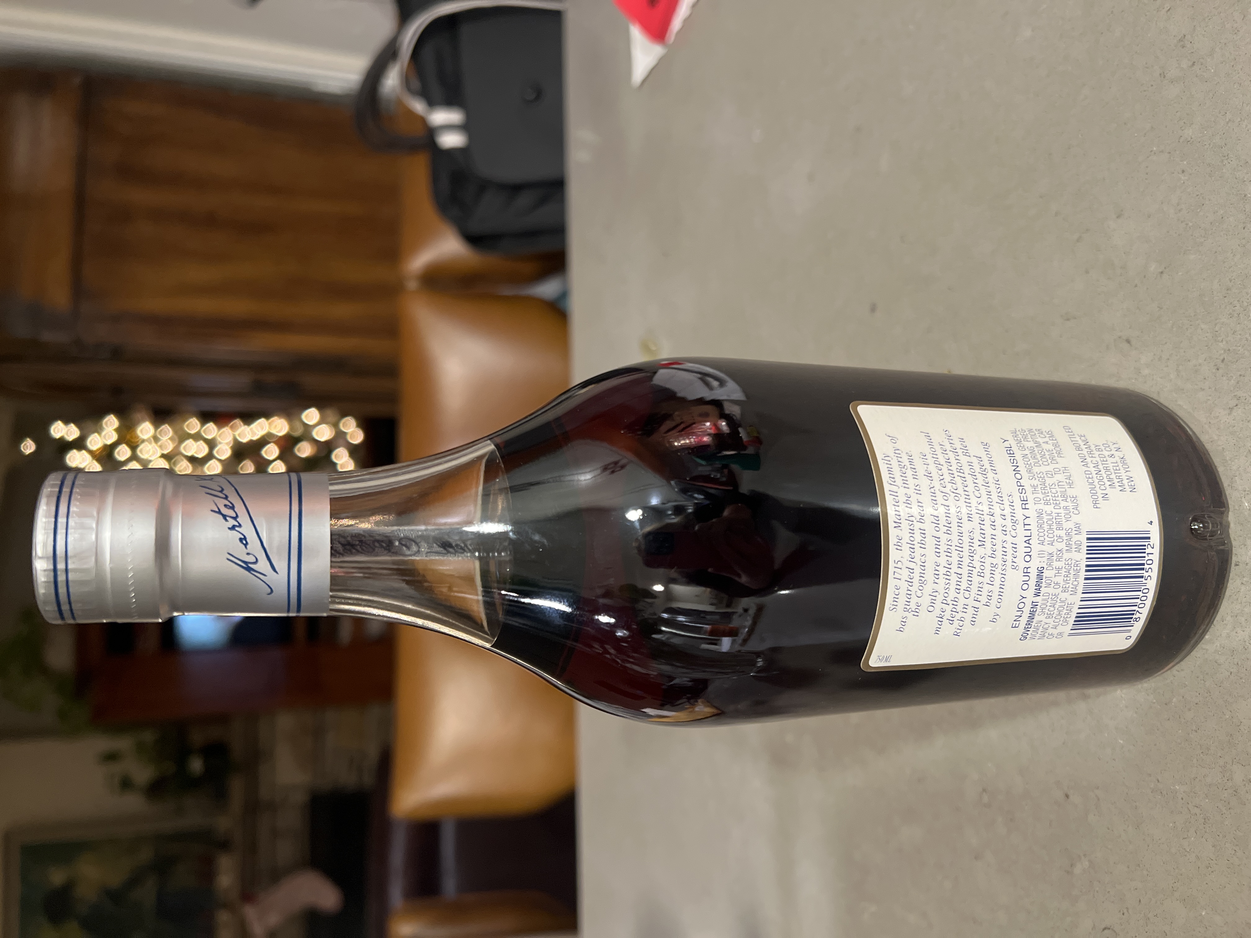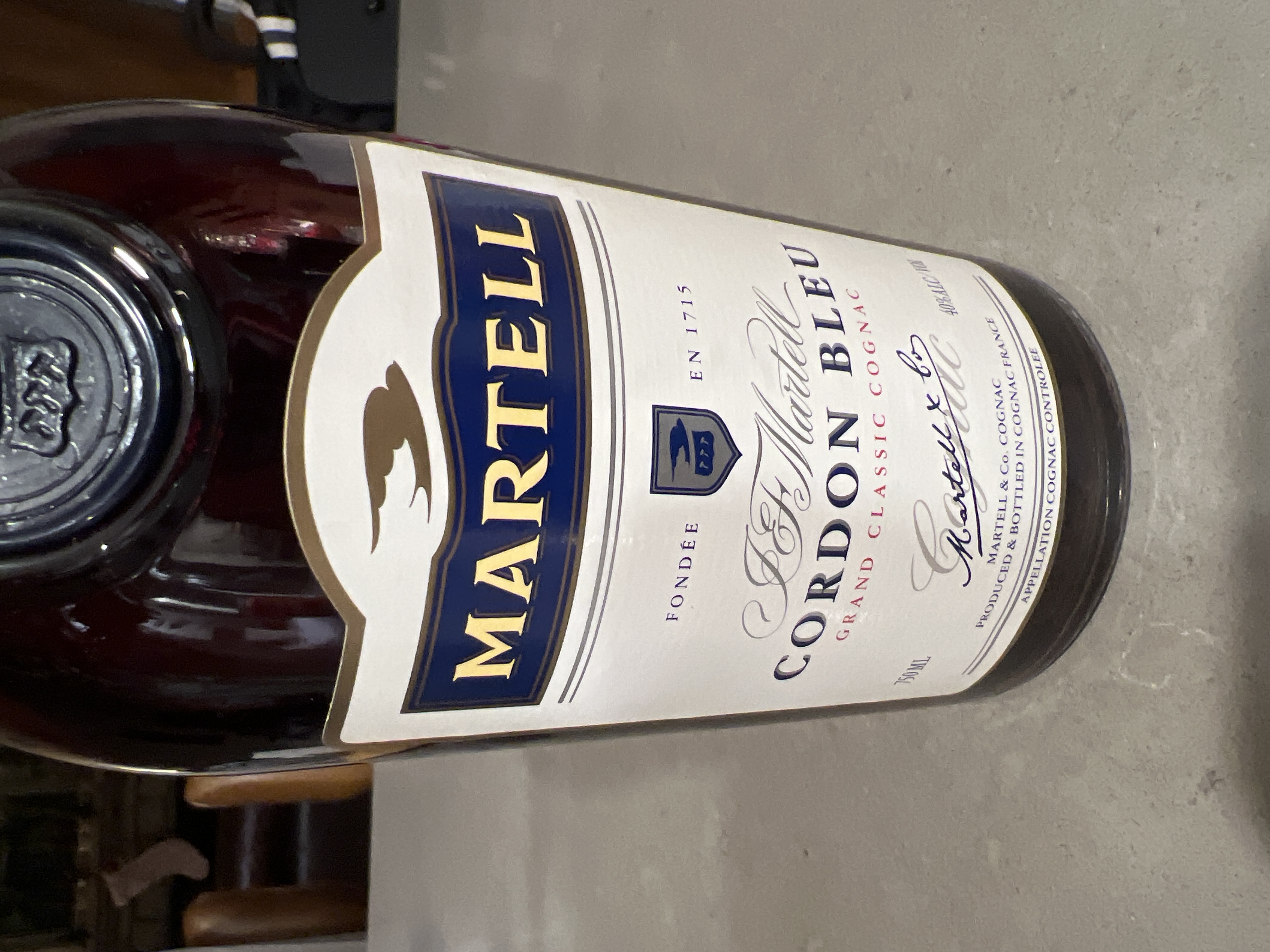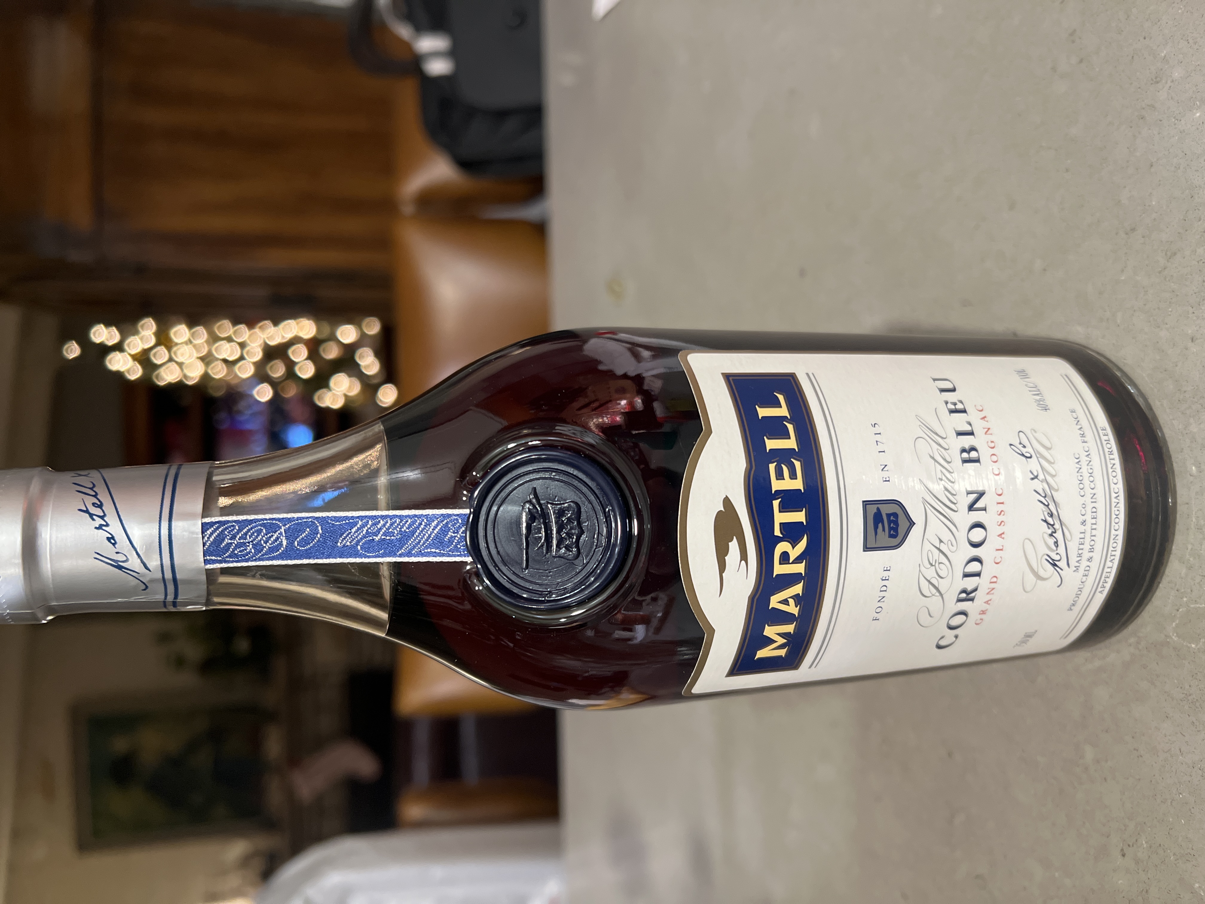 - 1) Text on label: Front Label: MARTTELL FONDÉE EN 1715 I. F. Martell CORDON BLEU GRAND CLASSIC COGNAC Martell & Co COGNAC 40% alc./vol. 750 ml PRODUCED & BOTTLED IN COGNAC FRANCE APPELLATION COGNAC CONTRÔLÉE Neck Label (Strip): Martell Cordon Bleu Back Label: The Martell House was founded in 1715 by Jean Martell, who applied all his expertise and passion to the creation of cognacs that are still enjoyed today. For the Martell Cordon Bleu, this savoir-faire is expressed through a unique style of small pot still distillation, a delicate selection of eaux-de-vie, and a long maturation exclusively in fine- grained oak barrels. All contribute to its exceptional smoothness and aromatic richness, a true Martell signature. FOR YOUR QUALITY RESPONSIBILITY GOVERNMENT WARNING: (1) According to the Surgeon General, women should not drink alcoholic beverages during pregnancy because of the risk of birth defects. (2) Consumption of alcoholic beverages impairs your ability to drive a car or operate machinery, and may cause health problems. IMPORTED BY MARTELL & Co. E. & J. GALLO WINERY, MODESTO, CA Product of France L 2219714770 2) Visual elements Neck Capsule: Silver foil capsule with vertical ridges, featuring a blue horizontal band (strip label) with "Martell Cordon Bleu" in cursive script. A thin blue line encircles the capsule top and bottom. Top of Capsule: A blue bird emblem (swallow) with three small square shields above it, printed on the silver top. Embossed Seal (Upper Shoulder): A dark blue wax-like seal with an embossed crest depicting a bird (swallow) and possibly other elements, centrally placed on the bottle's shoulder. Front Label: A distinctive shaped label with a white background. It features a gold-colored stylized bird (swallow) graphic on the left side of the main "MARTTELL" text. A small shield emblem (coat of arms) showing a swallow above three stylized figures/barrels appears below "FONDÉE EN 1715". Font Styles: The front label uses large sans-serif block letters for "MARTTELL", a decorative script/cursive font for "I. F. Martell" and "CORDON BLEU", and smaller serif fonts for other details like "FONDÉE EN 1715" and "GRAND CLASSIC COGNAC". The neck label uses a cursive/script font. The back label primarily uses a small serif font, with bold sans-serif for warnings. 3) Fill level estimate: well above shoulder into neck: great Reason: The liquid level is high in the neck, with no visible air gap.