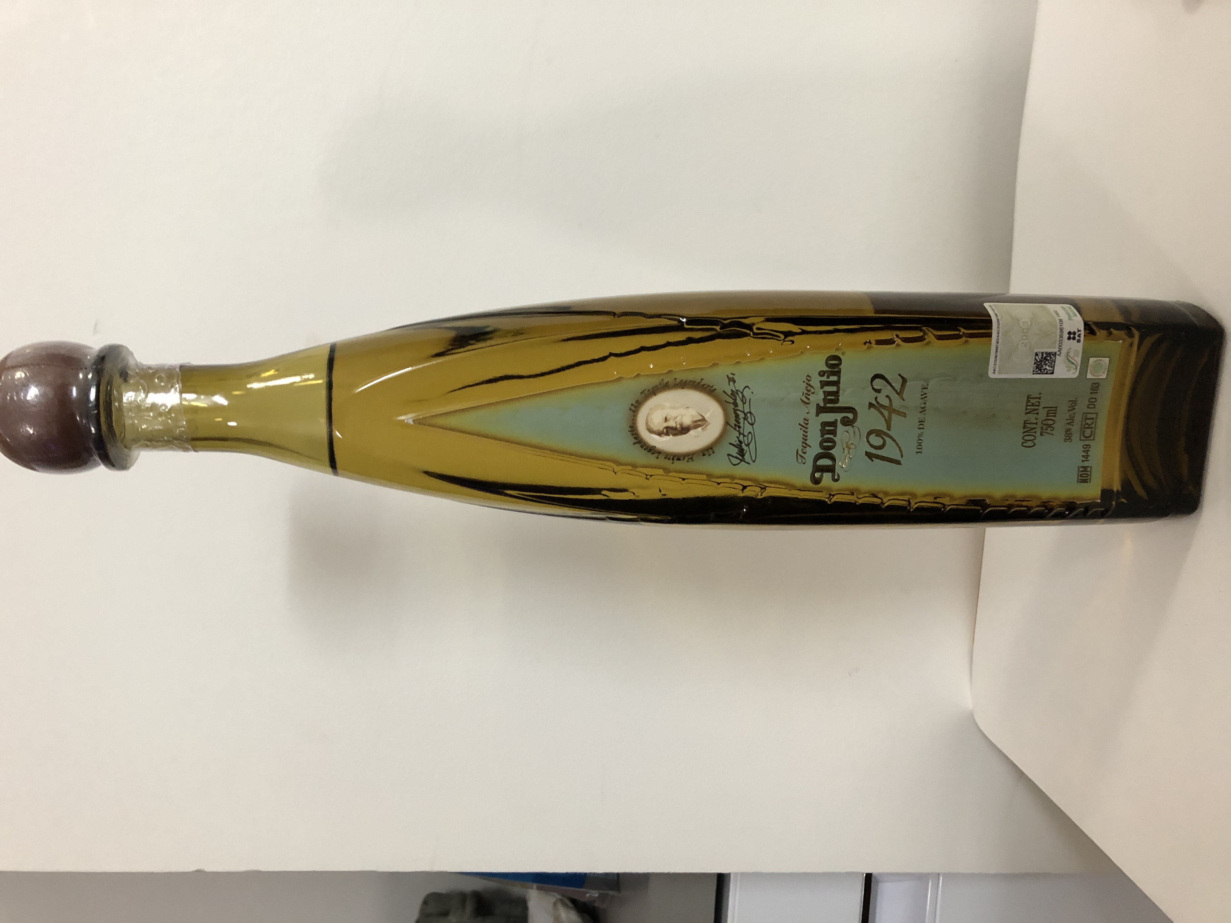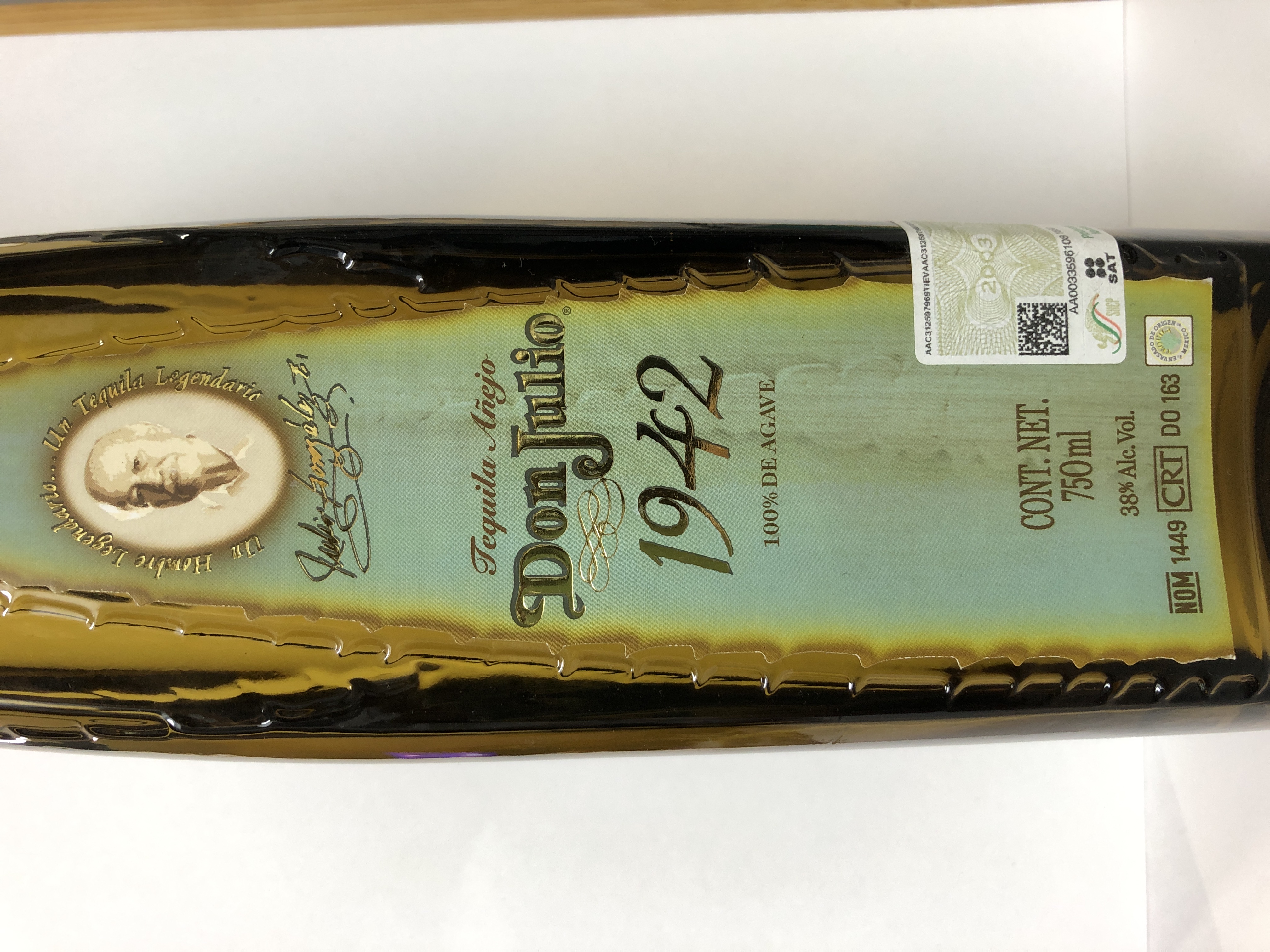 - 1) Text on label: Front Label (Mid Label) El Tequila Legendario de D. Julio González Tequila Añejo Don Julio® 1942 100% DE AGAVE CONT. NET. 750ml 38% Alc. Vol. NOM 1449 CRT DO 153 PRODUCTO DE MÉXICO Back Label EL ABUSO EN EL CONSUMO DE ESTE PRODUCTO ES NOCIVO PARA LA SALUD 0119829 5 010314 000494 HECHO EN MÉXICO ELABORADO POR: TEQUILA DON JULIO, S.A. DE C.V. SM 21 NO. 15, COL. ATOTONILCO EL ALTO, C.P. 47750, JALISCO, MÉXICO. PARA MAYOR INFORMACIÓN LLAME SIN COSTO: 01-800-200-2446 RFC. TDJ910221A39 IMPORTADO Y DISTRIBUIDO POR: DIAGEO MÉXICO, S.A. DE C.V. Av. Paseo de los Tamarindos No. 90 Torre II Pisos 17 y 18, Col. Bosques de las Lomas, C.P. 05120, Cuajimalpa de Morelos, Ciudad de México, México. RFC. DME950123M95 2) Visual elements (concise): Cork/Capsule: A dark brown, rounded wooden stopper covered by a clear plastic tamper-evident seal is present at the neck. Mid label: Features a portrait of Don Julio González within an oval frame on the left. The main label has an irregular, torn-paper-like gold border around a light blue-green background. A Mexican tax band/hologram with "SAT" and a QR code is visible on the upper right side. Back label: A rectangular white label contains a barcode and various legal and producer information. Font styles: A mix of elegant cursive/script (for "El Tequila Legendario de D. Julio González"), serif (for "Tequila Añejo"), a prominent decorative/art-deco style with serif elements (for "Don Julio"), bold decorative numbers (for "1942"), and various sans-serif fonts for smaller informational text. 3) Fill level estimate: well above shoulder into neck: great Reason: Liquid extends high into the slender neck, with a standard small air gap beneath the cork.