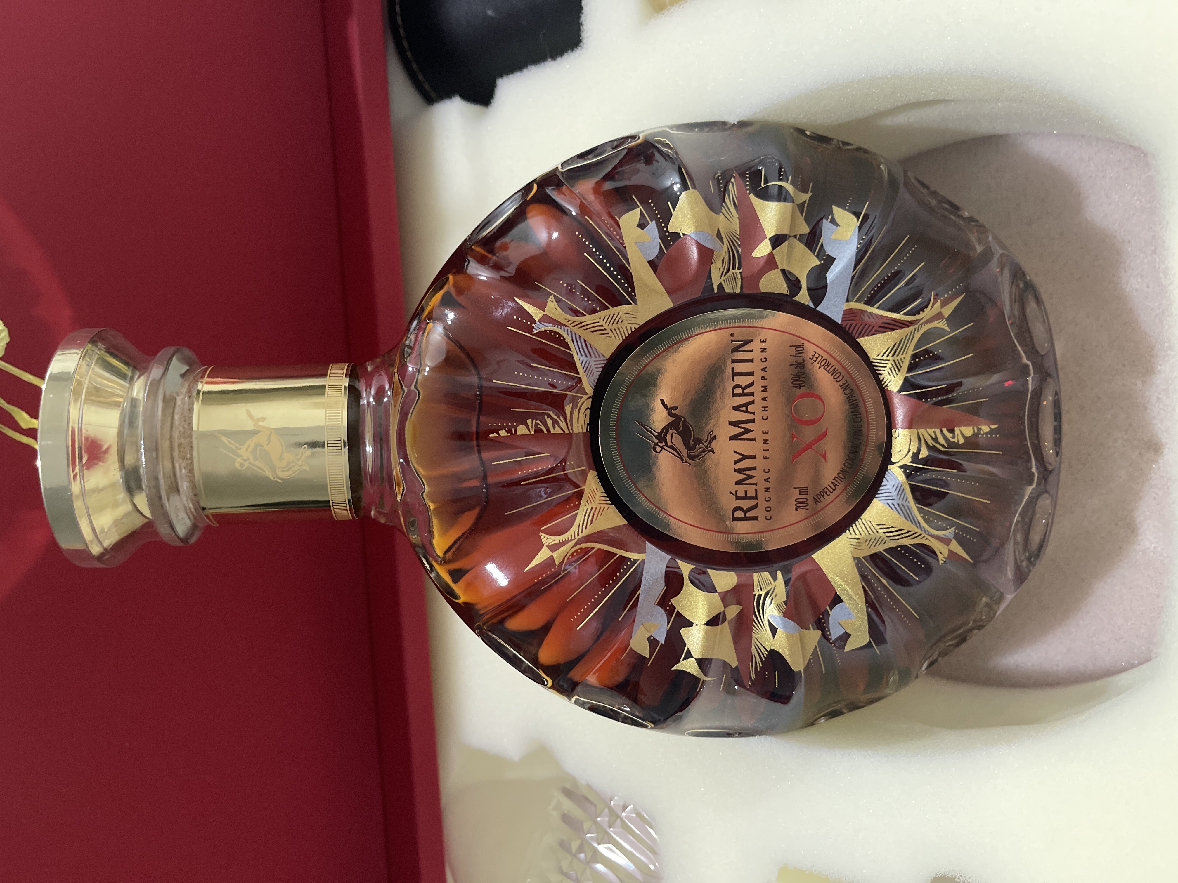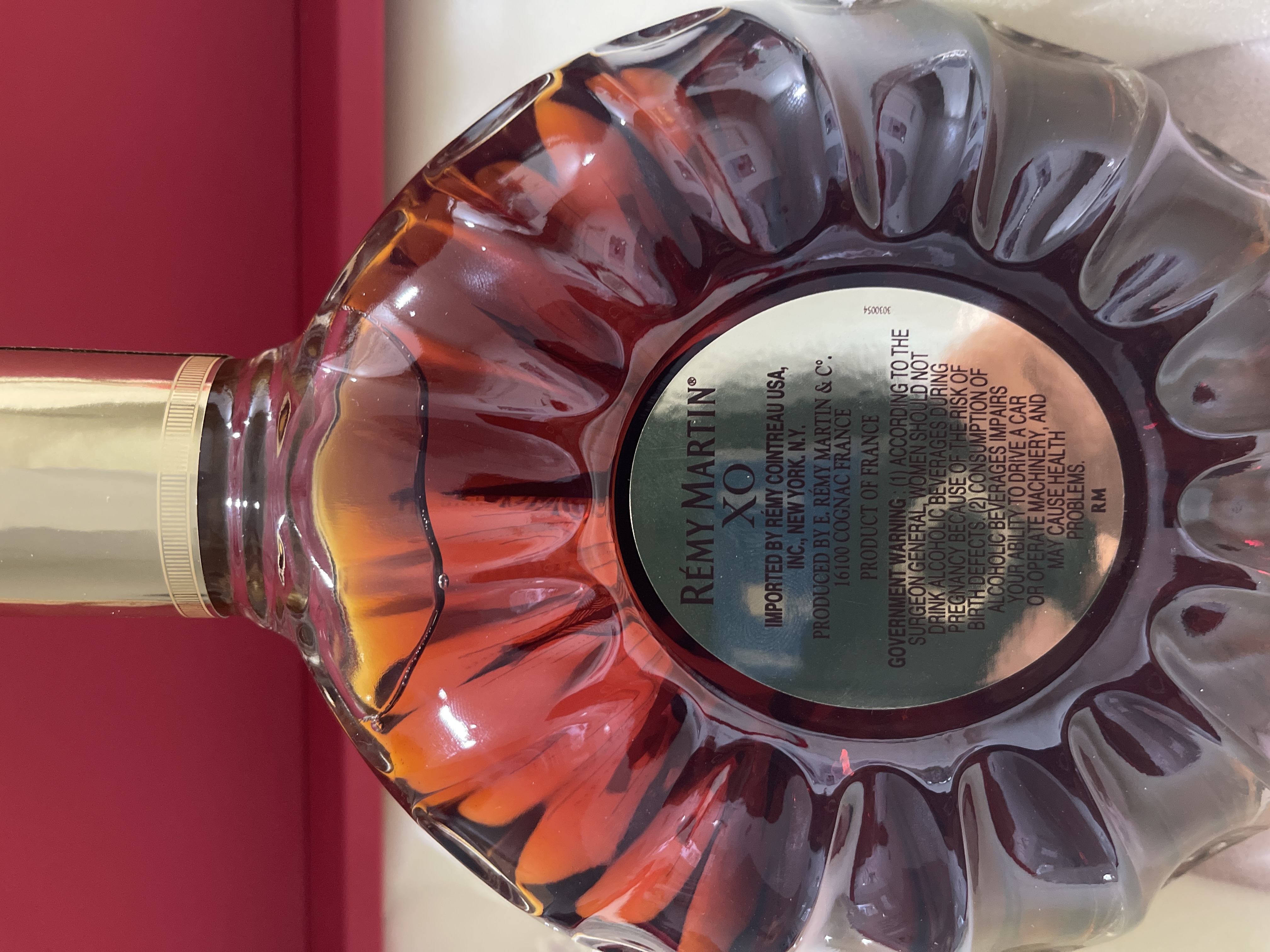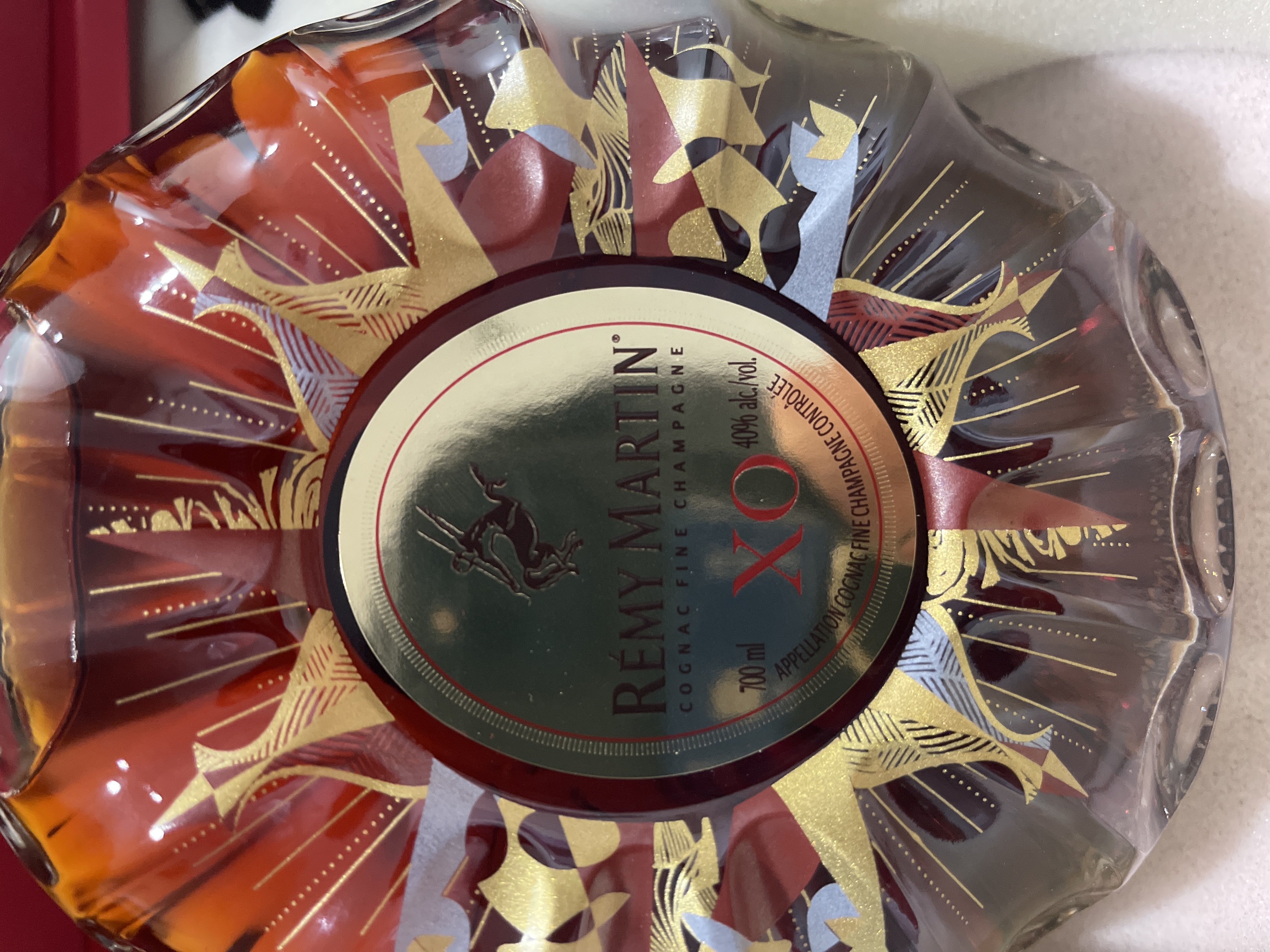 - 1) Text on label: Front Label (Mid label): RÉMY MARTIN® COGNAC FINE CHAMPAGNE 700 ml XO 40% alc./vol. APPELLATION COGNAC FINE CHAMPAGNE CONTRÔLÉE Back Label (Mid label): IMPORTED BY REMY COINTREAU USA, INC., NEW YORK, N.Y. PRODUCT OF FRANCE. PRODUCED BY E. RÉMY MARTIN & C°. COGNAC. FRANCE. GOVERNMENT WARNING: (1) ACCORDING TO THE SURGEON GENERAL, WOMEN SHOULD NOT DRINK ALCOHOLIC BEVERAGES DURING PREGNANCY BECAUSE OF THE RISK OF OF BIRTH DEFECTS. (2) CONSUMPTION OF ALCOHOLIC BEVERAGES IMPAIRS YOUR ABILITY TO DRIVE A CAR OR OPERATE MACHINERY, AND MAY CAUSE HEALTH PROBLEMS. RM 2) Visual elements: The bottle has a distinctive scalloped/fluted glass body resembling a sunburst. A gold-toned capsule covers the cork and neck, featuring a centaur emblem on the neck. The top of the stopper has an embossed centaur emblem surrounded by text. The main front label (mid label) is a circular gold metallic design centered with a darker bronze circle containing a gold centaur (Sagittarius) emblem. This is surrounded by an intricate radiating pattern of gold, red, and silver-grey geometric and stylized leaf elements. The back label (mid label) is a circular dark metallic label with white text. The outer presentation box is red with a gold centaur emblem and brand name. The brand name "RÉMY MARTIN" uses a stylized serif font, while other descriptive text and warnings are in sans-serif. The "XO" is a large, bold sans-serif. 3) Fill level estimate: well above shoulder into neck: great