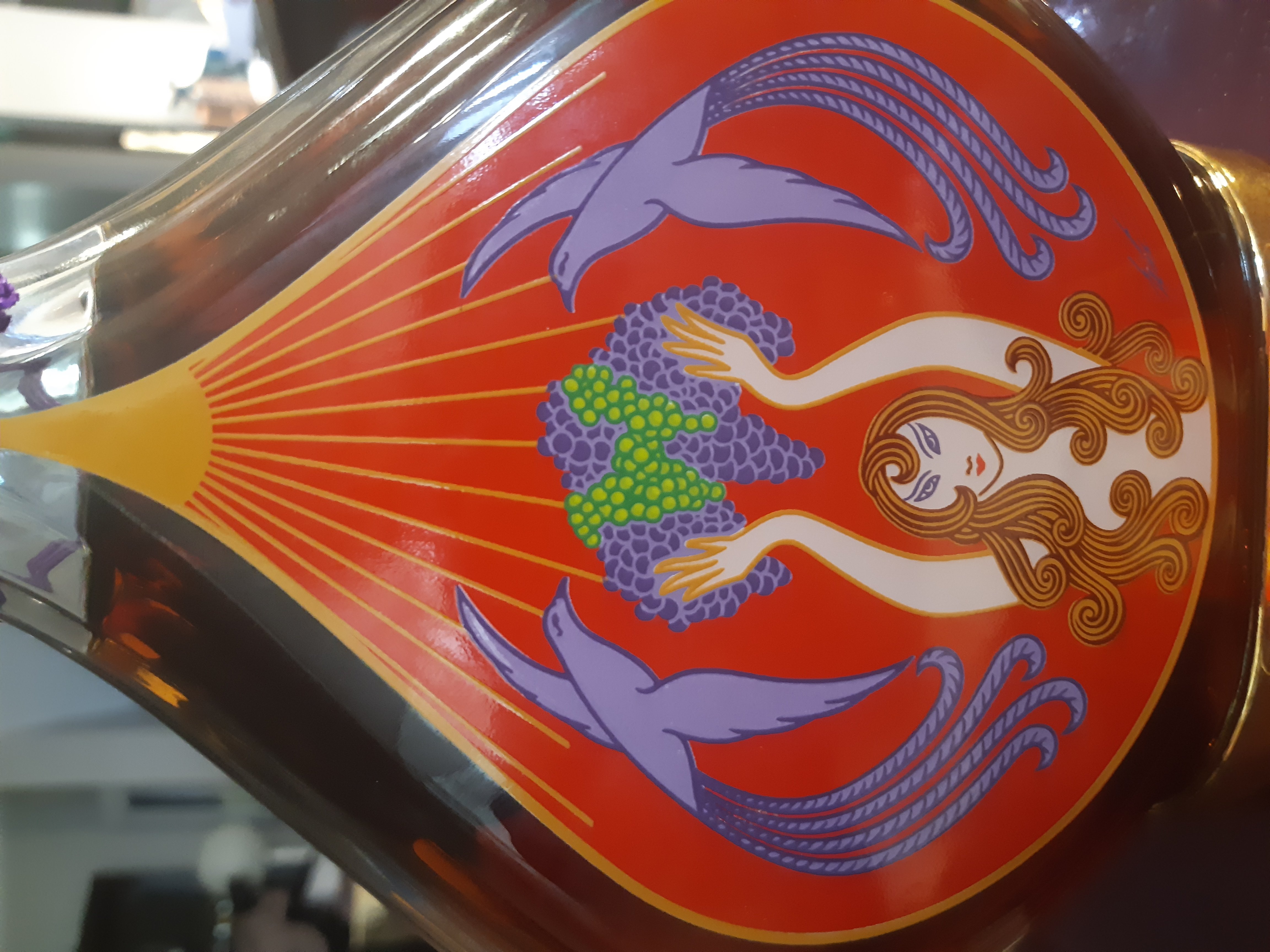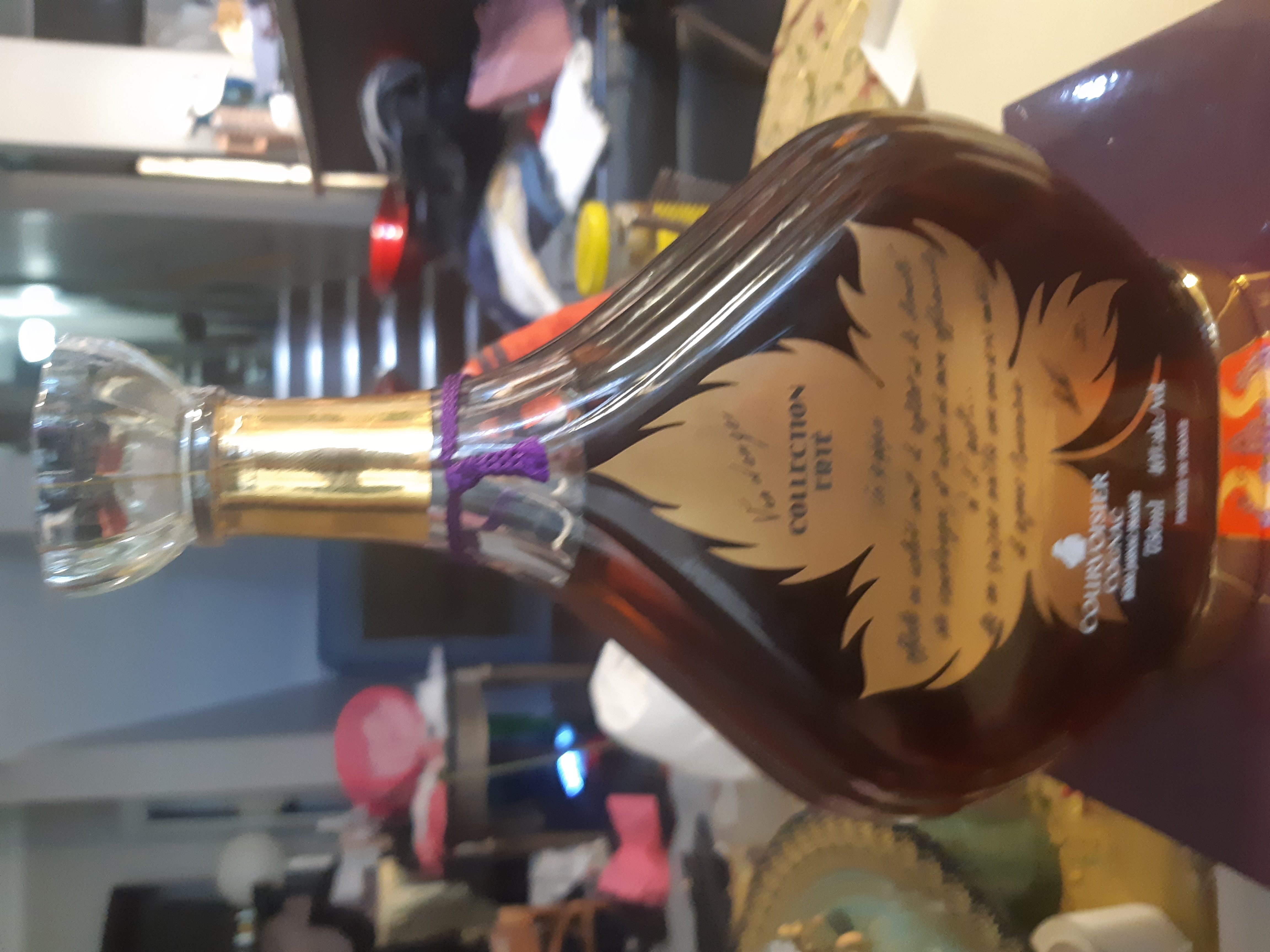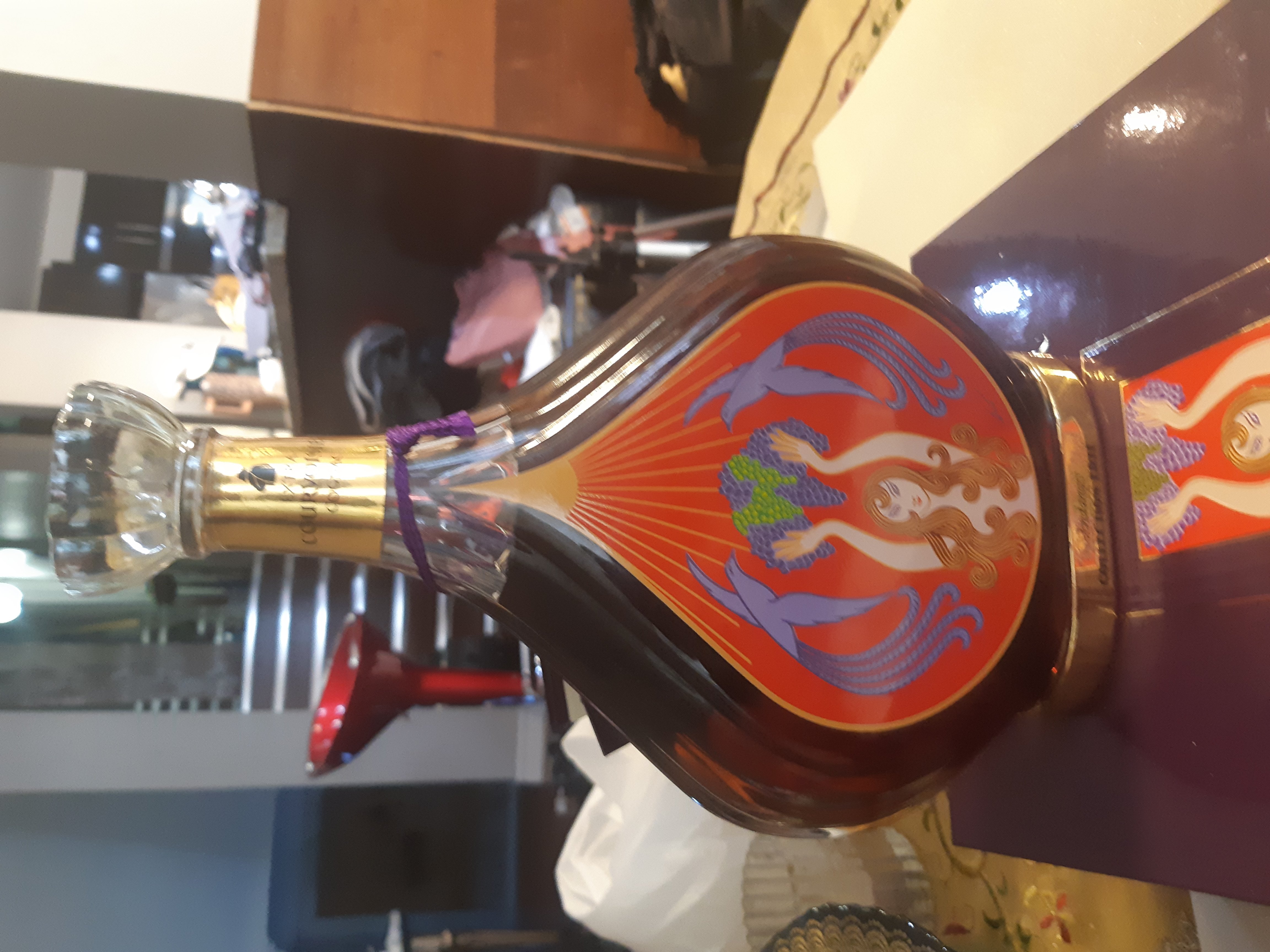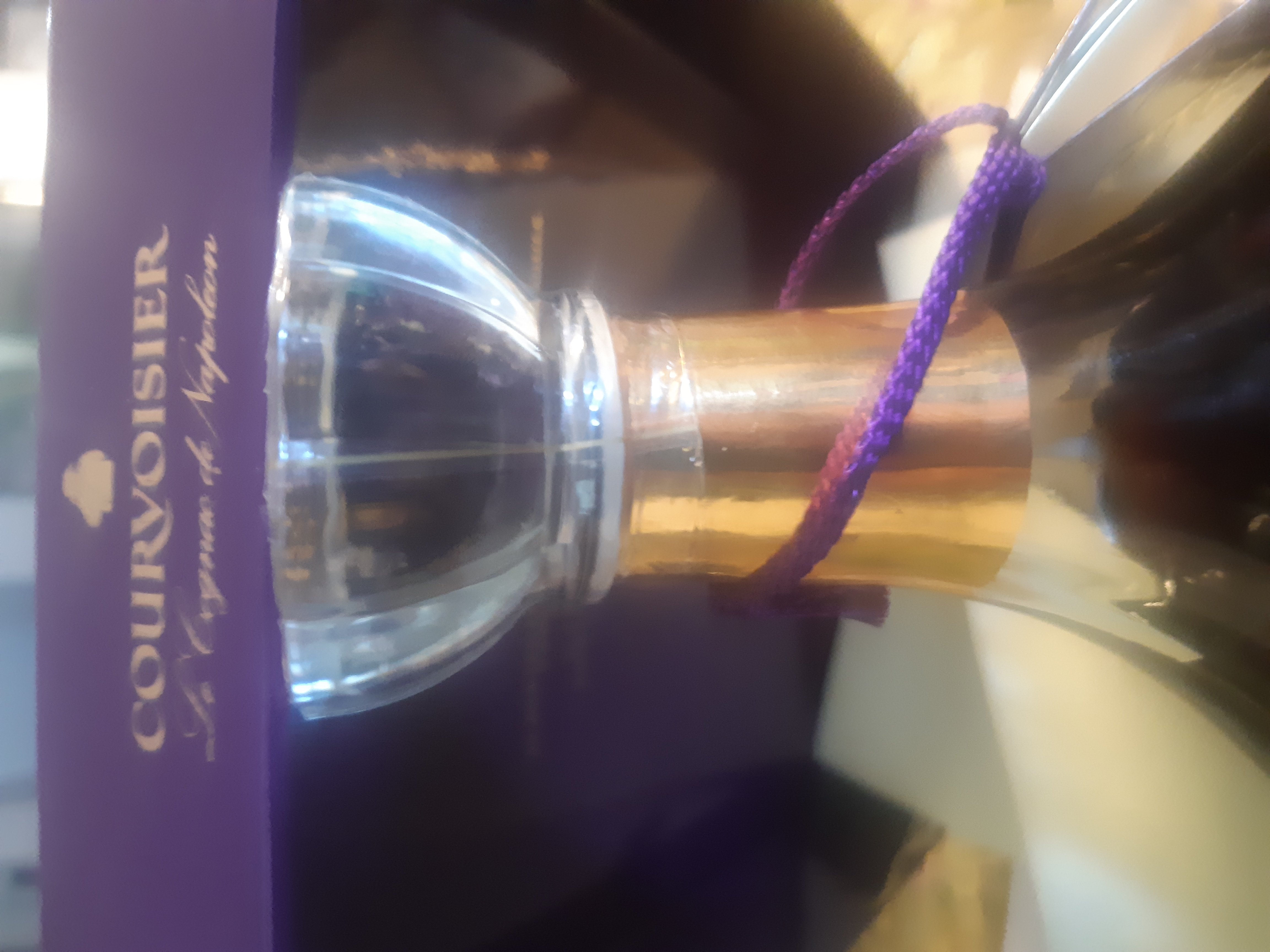 - 1) Text on label: On bottle (neck/back label): COURVOISIER Vignobles COLLECTION 2011 Ce Cognac d'exception a été élaboré avec le plus grand soin à partir de 95% de crus provenant de la région Grande Champagne. Il a été élevé en fûts de chêne français pendant un minimum de 12 ans. Nous esperons qu'il vous apportera un plaisir rare. COURVOISIER FRANCE COGNAC 700ml 40% Alc/Vol PRODUCE OF FRANCE MADE IN FRANCE On bottle (base): Vignobles Collection 2011 On box (front): EXTRA COURVOISIER COGNAC Vignobles COLLECTION 2011 2) Visual elements: Cork/Capsule: The bottle features a clear, ornate, multifaceted glass stopper on top of a golden foil-wrapped neck. A purple braided cord is tied around the neck, just below the golden foil. Bottle Front Label (mid label): A large, vibrant red, sunburst-shaped label depicts radiating yellow lines at the top. Below this, a stylized image of a bare-chested woman with flowing golden hair holds up a cluster of purple grapes, flanked by two ornate purple/blue birds with long, delicate tail feathers. No text is visible directly on this label. Bottle Back Label (mid label): A gold maple leaf-shaped label. Text for "Vignobles" and "COLLECTION 2011" uses a decorative serif font. The descriptive paragraph uses a smaller, elegant cursive/script font. "COURVOISIER" at the bottom is in a large serif font, while other details (country, type, volume, ABV) are in a sans-serif font. Bottle Base (lower label): A golden metallic band encircles the base of the bottle, bearing the text "Vignobles Collection 2011" in a decorative serif font. Box Front: A dark purple box features the Courvoisier Napoleon silhouette logo in gold at the top. "EXTRA COURVOISIER COGNAC" is prominently displayed in gold, with "COURVOISIER" in a serif font and "EXTRA COGNAC" in sans-serif/block letters. A central rectangular frame encloses a colorful graphic identical to the bottle's front label. "Vignobles COLLECTION 2011" appears below the framed graphic in a decorative serif font. A gold signature is visible at the bottom right. 3) Fill level estimate: well above shoulder into neck: great