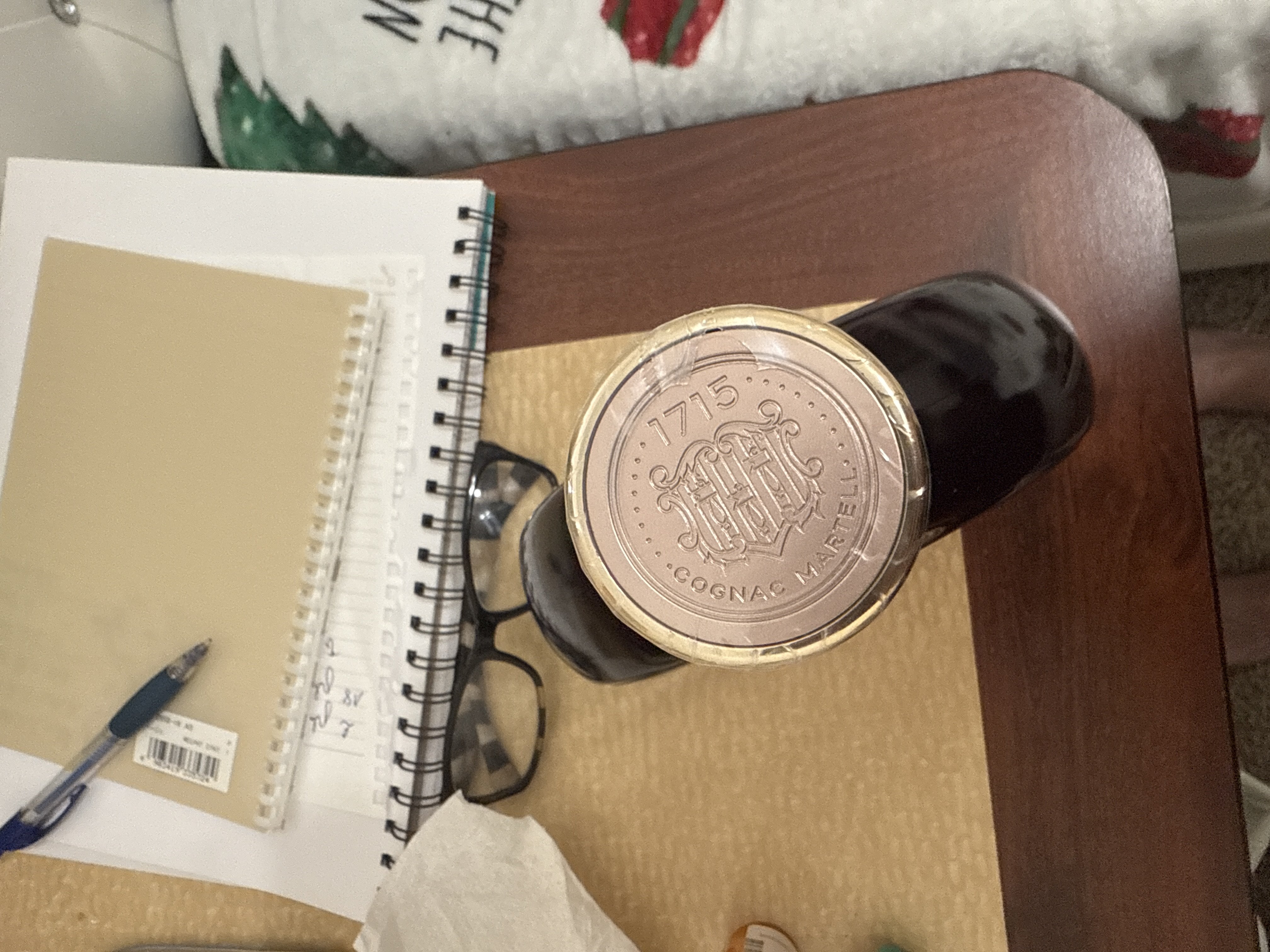 - 1) Text on label: On the Bottle - Front Label (Blue): MARTEL COGNAC FONDÉE EN 1715 XO EXTRA FINE COGNAC (embossed on glass, below the label) On the Bottle - Neck Capsule: EST. 1715 FINE COGNAC On the Bottle - Top of Capsule: COGNAC MARTEL 1715 On the Bottle - Back Label: ENJOY OUR QUALITY COGNAC MUST BE 21+ TO PURCHASE GOVERNMENT WARNING: (1) According to the Surgeon General, women should not drink alcoholic beverages during pregnancy because of the risk of birth defects. (2) Consumption of alcoholic beverages impairs your ability to drive a car or operate machinery, and may cause health problems. 750 mL ITEM # PRODUCT OF FRANCE MARTELL XO EXTRA FINE COGNAC 40% ALC/VOL IMPORTED BY PERNOD RICARD USA, LLC, NEW YORK, NY IA.SC.ME.VT.15¢ CA CRV www.martell.com CALIFORNIA REDEMPTION VALUE On the Box - Front: MARTELL COGNAC FONDÉE EN 1715 XO EXTRA FINE COGNAC 750 mL _Jean Martell_ PRODUCED AND BOTTLED IN FRANCE MARTELL & CO 16100 COGNAC FRANCE 40% ALC./VOL. 2) Visual elements: Emblem (Bird): A stylized swallow/swift appears above "MARTELL" on the front label, neck capsule, and box. Emblem (Double M): A decorative monogram of two intertwined 'M's, possibly with a crest, is embossed on the mid-neck capsule, the top of the cork/capsule, and on the box. Bottle Shape: Distinctive wide, flattened, arc-shaped body with vertical fluting/ribs on the sides. Capsule/Cork: Gold-colored, horizontally ribbed cap with a rose-gold/copper neck capsule featuring vertical lines/texture. Glass Embossing: "EXTRA FINE COGNAC" is embossed on the front glass below the main label. A large "XO" is also embossed on the front glass. A large stylized bird/wing pattern is embossed on the back of the bottle. Box Design: Rose gold/copper color with a brushed metallic texture, featuring black borders on the top and bottom edges. Font styles: "MARTELL" is a bold sans-serif; "COGNAC" and "EXTRA FINE COGNAC" are simple sans-serif; "FONDÉE EN 1715" uses a small serif font; "XO" is a large, elegant decorative serif font; "_Jean Martell_" is a cursive/script font; small print uses a fine sans-serif font. 3) Fill level estimate: above shoulder: good Reason: The liquid level is at the very top of the bottle's shoulder, at the base of the neck, with no visible air gap.