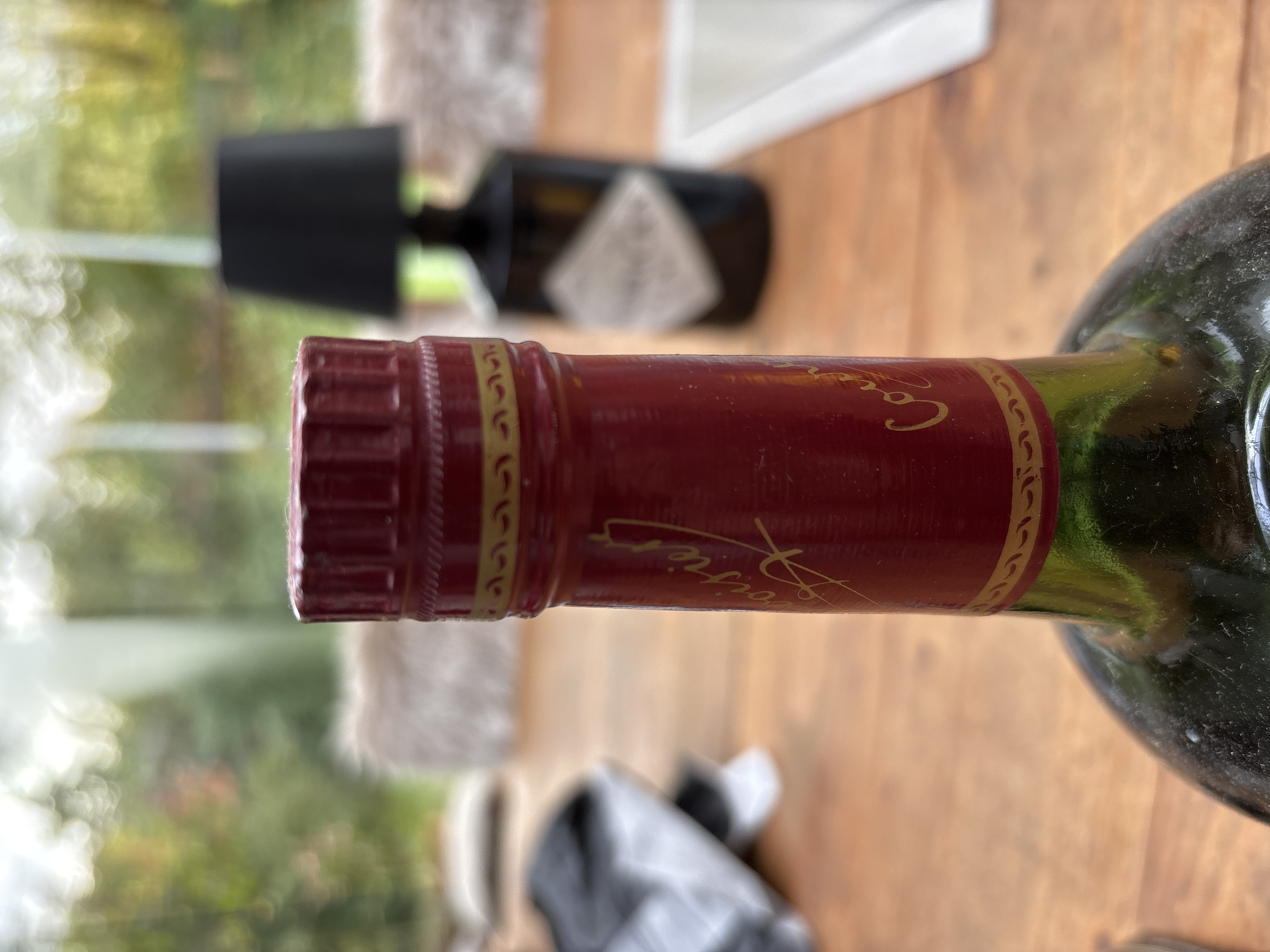 - 1) Text on label: Main front label: COURVOISIER Luxe COGNAC 40% VOL. e 70cl IMPORTE PAR INTERBRANDS NEDERLAND NIEUW VENNEP Main back/side label: Luxe COGNAC 3 049197 100091 Circular neck label: COURVOISIER Luxe COGNAC Capsule/Foil on neck (script repeats): Courvoisier Cognac Capsule top (circular text): COURVOISIER COGNAC Bottle embossing (at base): COGNAC FRANCE Accompanying cardboard piece: WORDT LID VAN CLUB DE COURVOISIER ZIE BINNENZIJDE 2) Visual elements: Main label: Cream-colored paper with a decorative gold border. Features a gold emblem of a hatted figure (Napoleon-style silhouette) on both sides of the upper label and centrally on the neck capsule. Three gold stars appear below "COURVOISIER" on the main label. Neck label: Small circular, red with white text and a white hatted figure emblem, and three white stars. Capsule/Foil: Deep red foil with two thin gold horizontal lines and "Courvoisier Cognac" in gold script repeating around the neck. Capsule top: Red cap with "COURVOISIER" and "COGNAC" in white block letters, encircling a white hatted figure emblem. Bottle: "COGNAC FRANCE" is embossed into the glass at the bottom of the bottle. Accompanying cardboard piece: Black and gold design with a gold oval featuring the hatted figure emblem. Font styles: "COURVOISIER" uses a prominent red, decorative serif font. "Luxe" is a small, elegant script font. "COGNAC" is a bold, sans-serif block font. Other textual information (e.g., volume, importer) uses a clear sans-serif font. 3) Fill level estimate: well above shoulder into neck: great