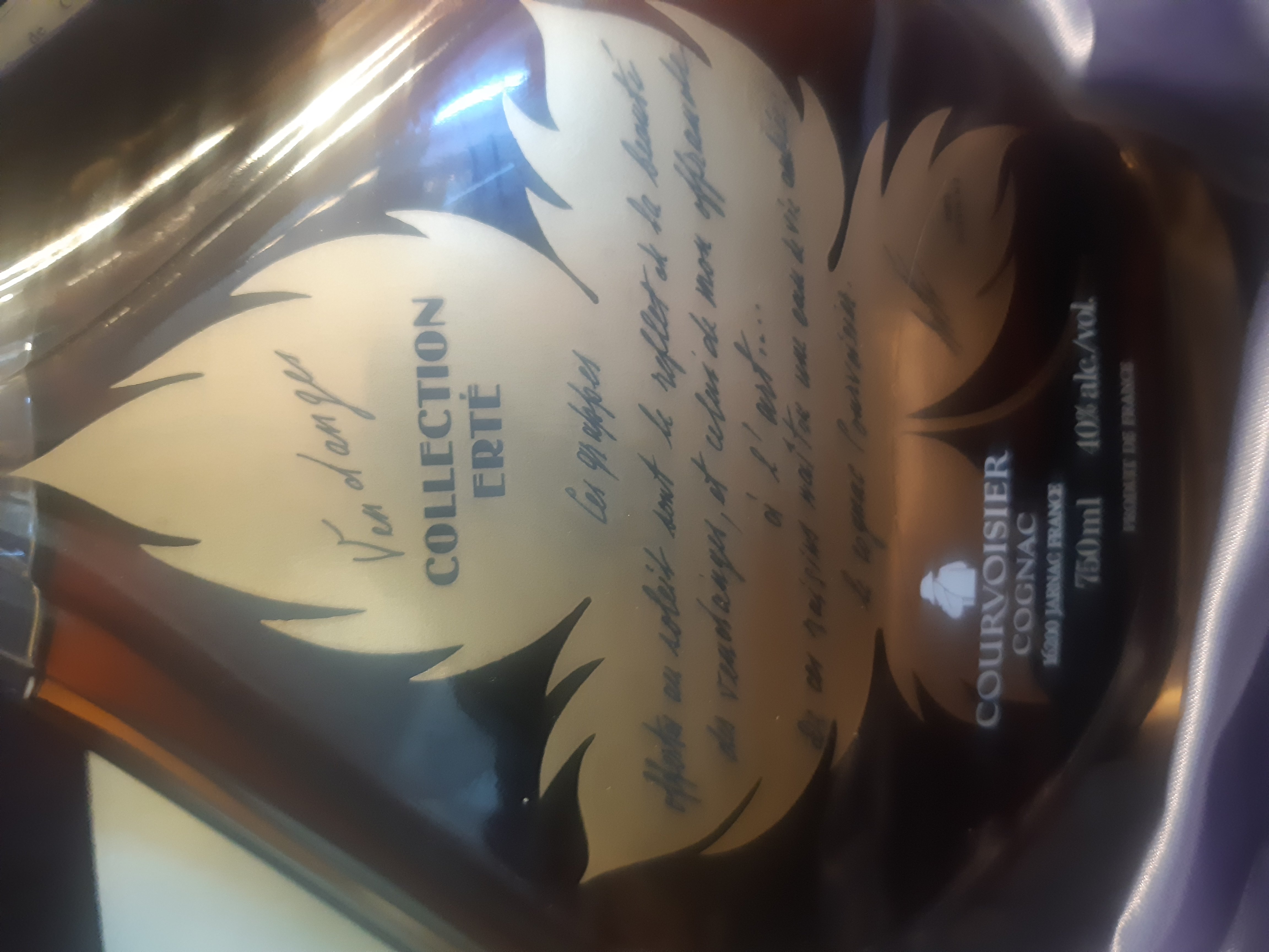- 1) Text on label: Neck label (partially visible, gold rectangle): EXTRA COURVOISIER Back label (gold leaf shape): Vendanges COLLECTION ERTÉ Les grappes offertes au soleil sont le reflet de la beauté des vendanges, et celui de mon offrande à l'est ... de ces raisins naîtra une eau-de-vie exquise, le cognac Courvoisier. COURVOISIER COGNAC JARNAC FRANCE 750ml 40% alc./vol. PRODUIT DE FRANCE Bottle base (gold band): COLLECTION 2011 Box/Packaging (top): COURVOISIER Le Cognac de Napoléon 2) Visual elements Bottle shape: Distinctive, wide, flattened teardrop/pear-shaped clear glass bottle. Cork/Capsule: The closure is a large, ornate, clear faceted glass stopper, secured by a metallic band around the neck opening. A golden foil/sleeve covers the neck below the stopper. Neck: A purple braided cord is tied around the golden neck sleeve. Front label (mid label): A large, colorful teardrop-shaped illustration on an orange background. It depicts a stylized woman with uplifted hands holding a cluster of grapes, flanked by two purple bird-like figures with stylized wings. Yellow rays emanate from the top of the grapes. Back label (mid label): A large, prominent gold-colored grape leaf shape, serving as the label. A small black silhouette of a figure (likely Napoleon) appears above the main brand name. Bottle base: A metallic gold-colored band wraps around the bottom of the bottle. Packaging: A purple box top is visible, featuring the brand name. Font style(s): Serif for main "COURVOISIER" branding; sans-serif for most informational text (e.g., "COLLECTION ERTÉ", "750ml"); cursive/script for "Vendanges", the poetic French text, and "Le Cognac de Napoléon". 3) Fill level estimate: Well above shoulder