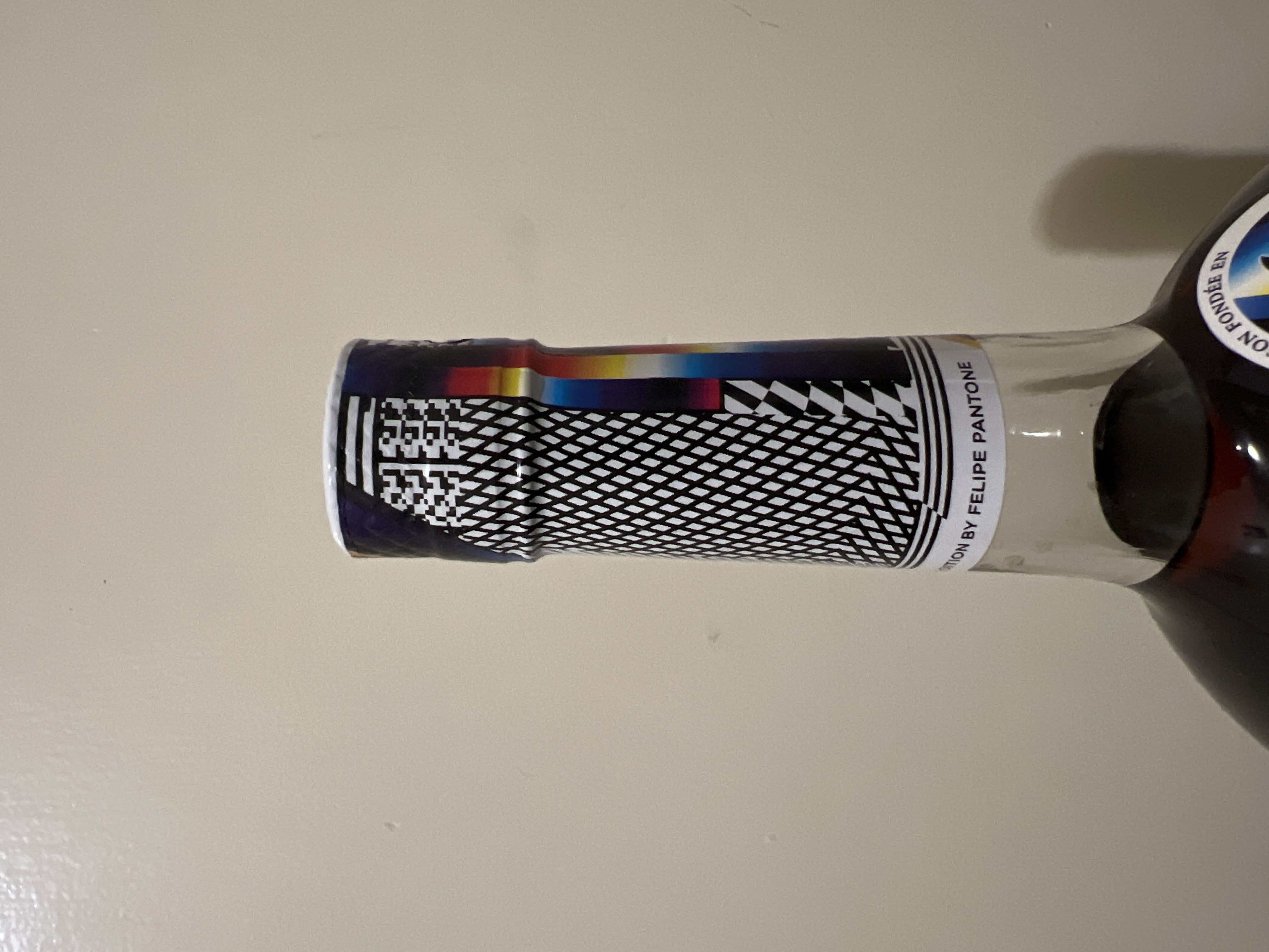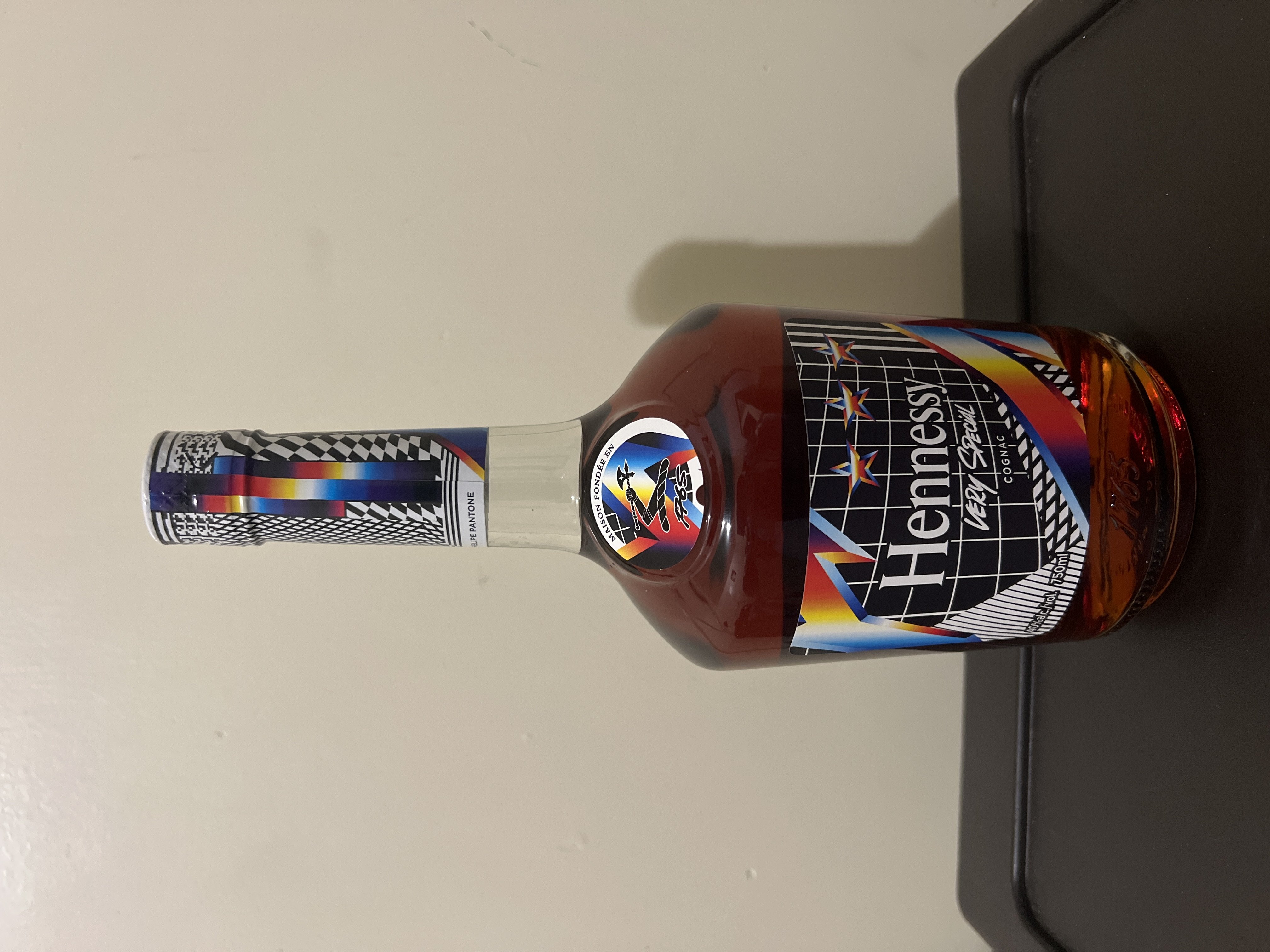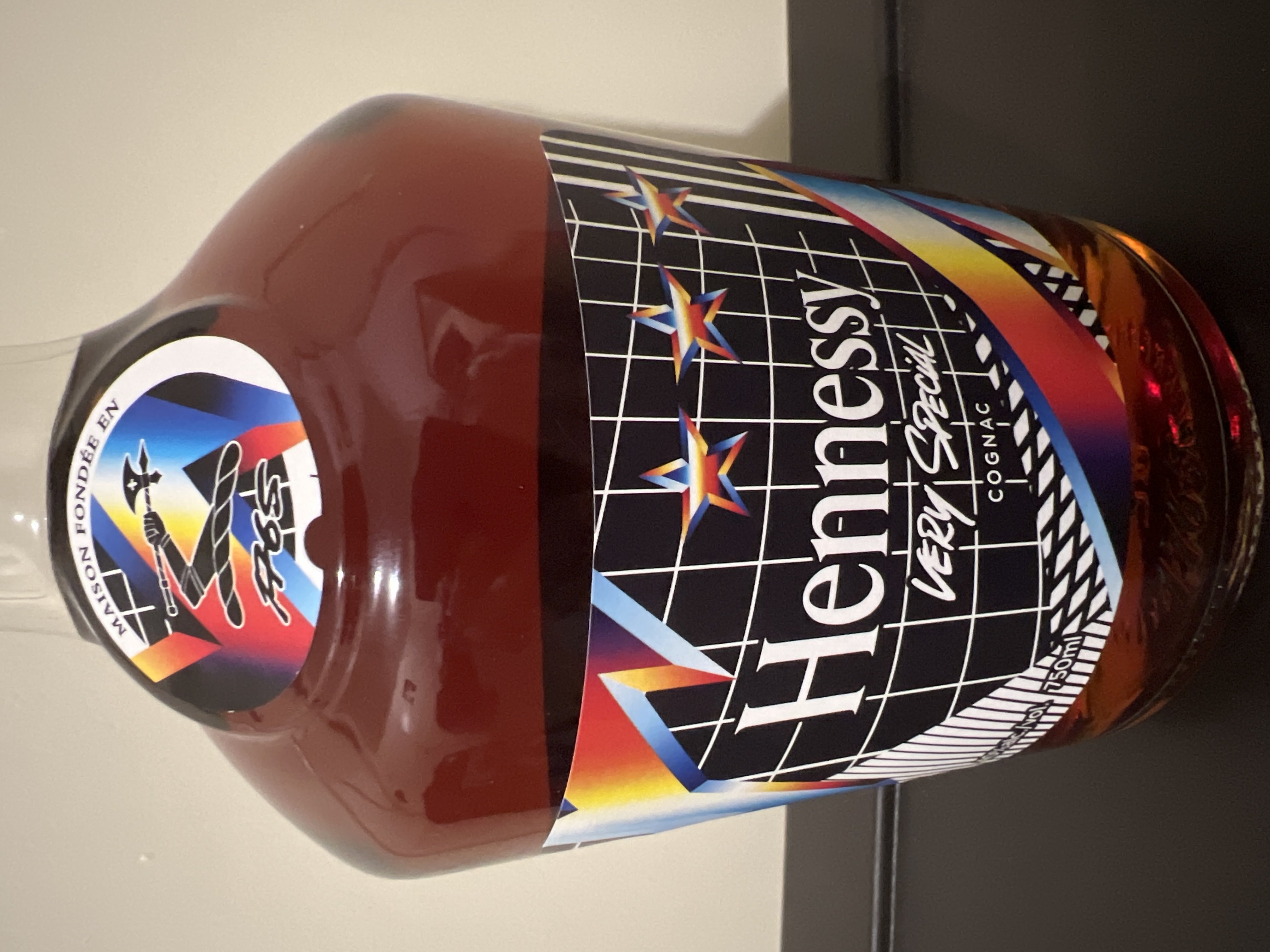 - 1) Text on label: Neck capsule: EDITION BY FELIPE PANTONE Top of cap: Hennessy F. PantonE COGNAC Upper circular neck label: MAISON FONDÉE EN 1765 Main front label: Hennessy VERY Special COGNAC 750ml 40% Alc./Vol. Back label: LIMITED EDITION Nº 219887 « REMIXING THE PRESENT » F. PantonE WWW.HENNESSY.COM IMPORTED BY MOET HENNESSY USA, INC. NEW YORK, N.Y. PRODUCED AND BOTTLED IN FRANCE BY JAS HENNESSY & Cº, 16100 COGNAC GOVERNMENT WARNING: (1) ACCORDING TO THE SURGEON GENERAL, WOMEN SHOULD NOT DRINK ALCOHOLIC BEVERAGES DURING PREGNANCY BECAUSE OF THE RISK OF BIRTH DEFECTS. (2) CONSUMPTION OF ALCOHOLIC BEVERAGES IMPAIRS YOUR ABILITY TO DRIVE A CAR OR OPERATE MACHINERY, AND MAY CAUSE HEALTH PROBLEMS. L9 105 11026289 2) Visual elements: Neck/capsule: Features an abstract, dynamic pattern resembling glitch art or digital interference, with black and white checkerboard/pixelated sections and vertical bands of vibrant rainbow colors (blue, purple, pink, orange, yellow). Cap: White with black text: "Hennessy" (serif-like script), "F. PantonE" (cursive signature), and "COGNAC" (all-caps sans-serif). Upper neck label: Circular, with an abstract black emblem (resembling a stylized weapon or object) set against a background of blues, reds, and yellows. Text "MAISON FONDÉE EN" appears in a block/sans-serif font, and "1765" in a serif font. Mid/Lower front label: The main label features a black background overlaid with a white grid pattern, creating a digital aesthetic. Dynamic, sharp-edged stripes in rainbow colors (blue, red, yellow, orange) diagonally cross the label. Three prominent orange-red stars with white outlines are on the right side. The "Hennessy" logotype is a classic serif font, "VERY Special" is in a stylized cursive/script font, and "COGNAC", "750ml", and "40% Alc./Vol." are in sans-serif fonts. Back label: Continues the black background with white grid pattern and colorful stripes from the front label. Most text is in a sans-serif font, except for the "F. PantonE" signature which is cursive/script. Box: Displays the same core graphic design elements as the bottle, featuring the black background, white grid, dynamic rainbow stripes, and checkerboard/pixelated patterns. 3) Fill level estimate: well above shoulder into neck: great