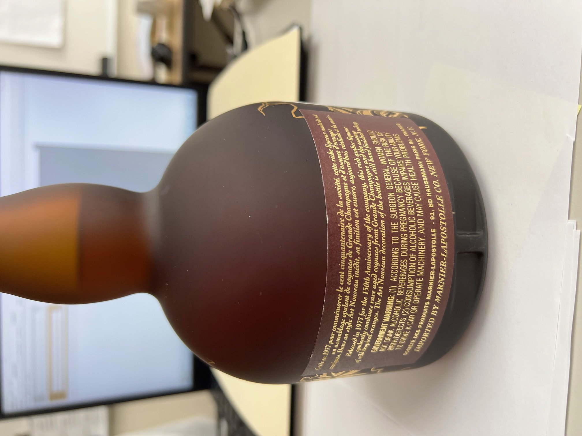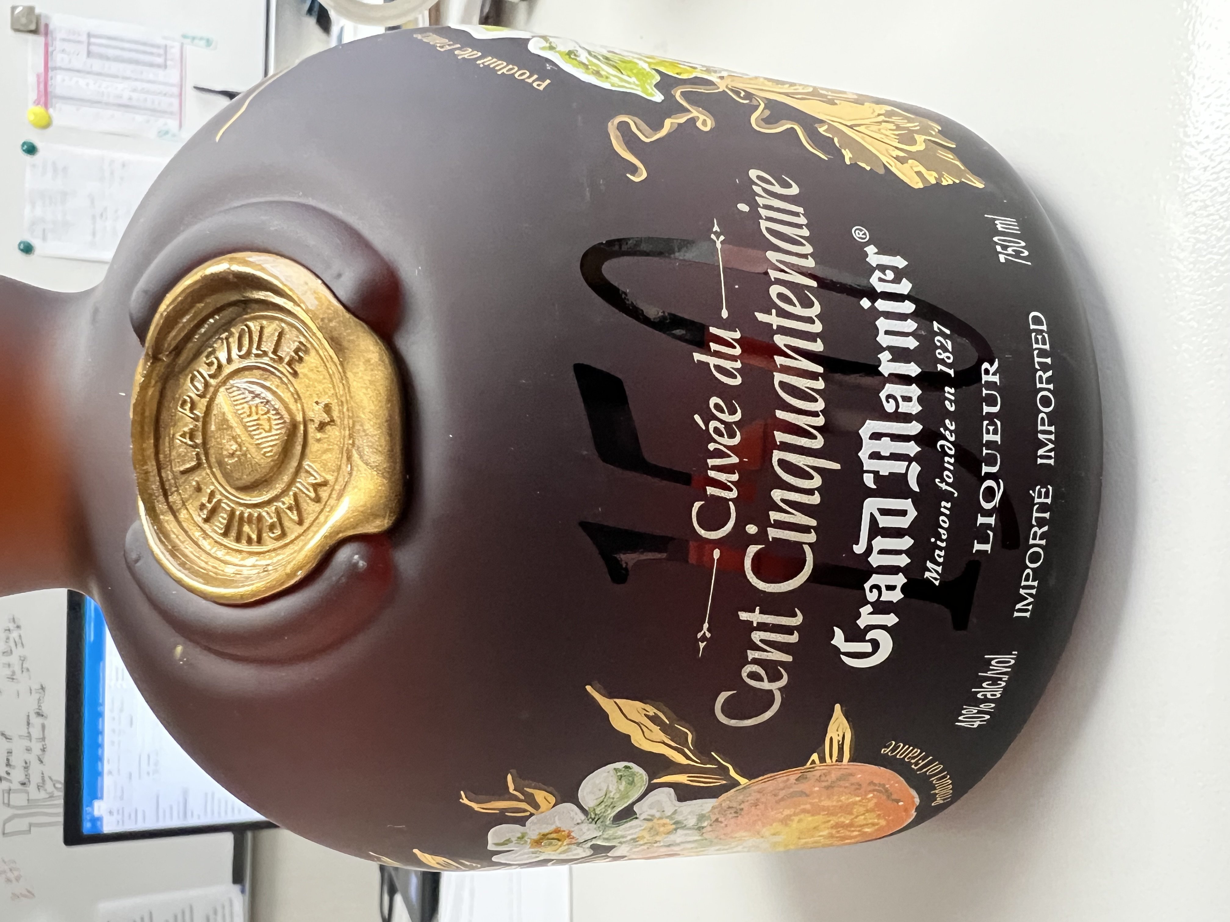 - HAND PAINTED BOTTLE AND LETTERING SAYING CUVEE DU CENT CIQUANTENAIRE - GRAND MARNIER - MAISON FONDEE EN 1827 - LIQUEUR - 40% ALC/VOL - IMPORTE IMPORTED 750 ML - PRODUCT OF FRANCE, THEN THERE IS PAPER LABEL ON THE BACK TELLING THE HISTORY, A WAX STAMP ON THE BOTTLE AND PERFECT CAP AND CAP LABEL. THERE IS ALSO A SERIAL NUMBER PAPER LABEL ON THE BOTTOM OF THE BOX 88110 93401 WITH PRODUCT OF FRANCE IMPORTED BY MARNIER LAPOSTOLLE CO. NEW YORK, NY AND A GOLD NUMBER IMPRINTED ON THE BOTTOM OF THE BOX 3920283001. BOX IS IN EXCELLENT CONDITION. BOTTLE SIZE 750 ML