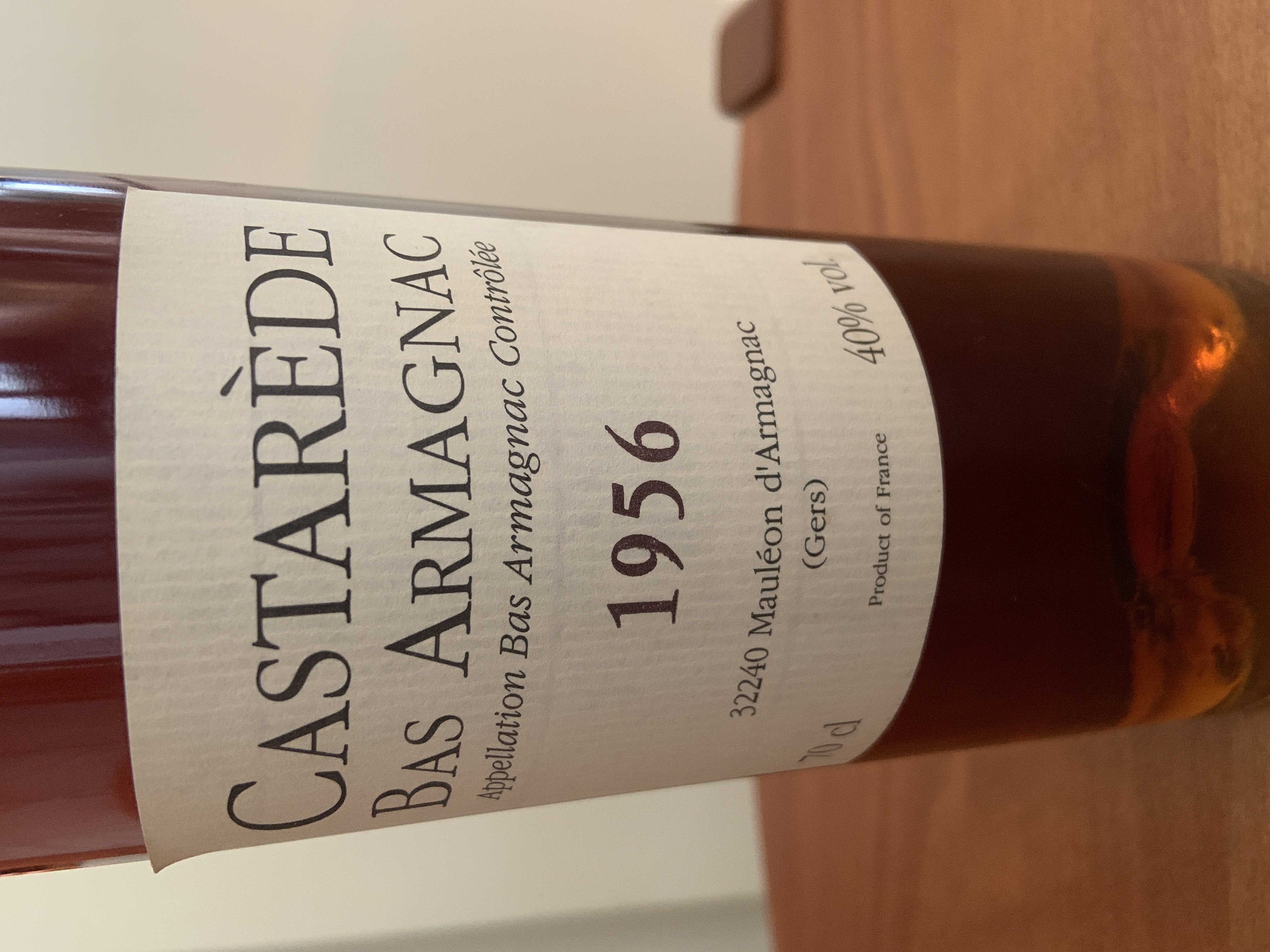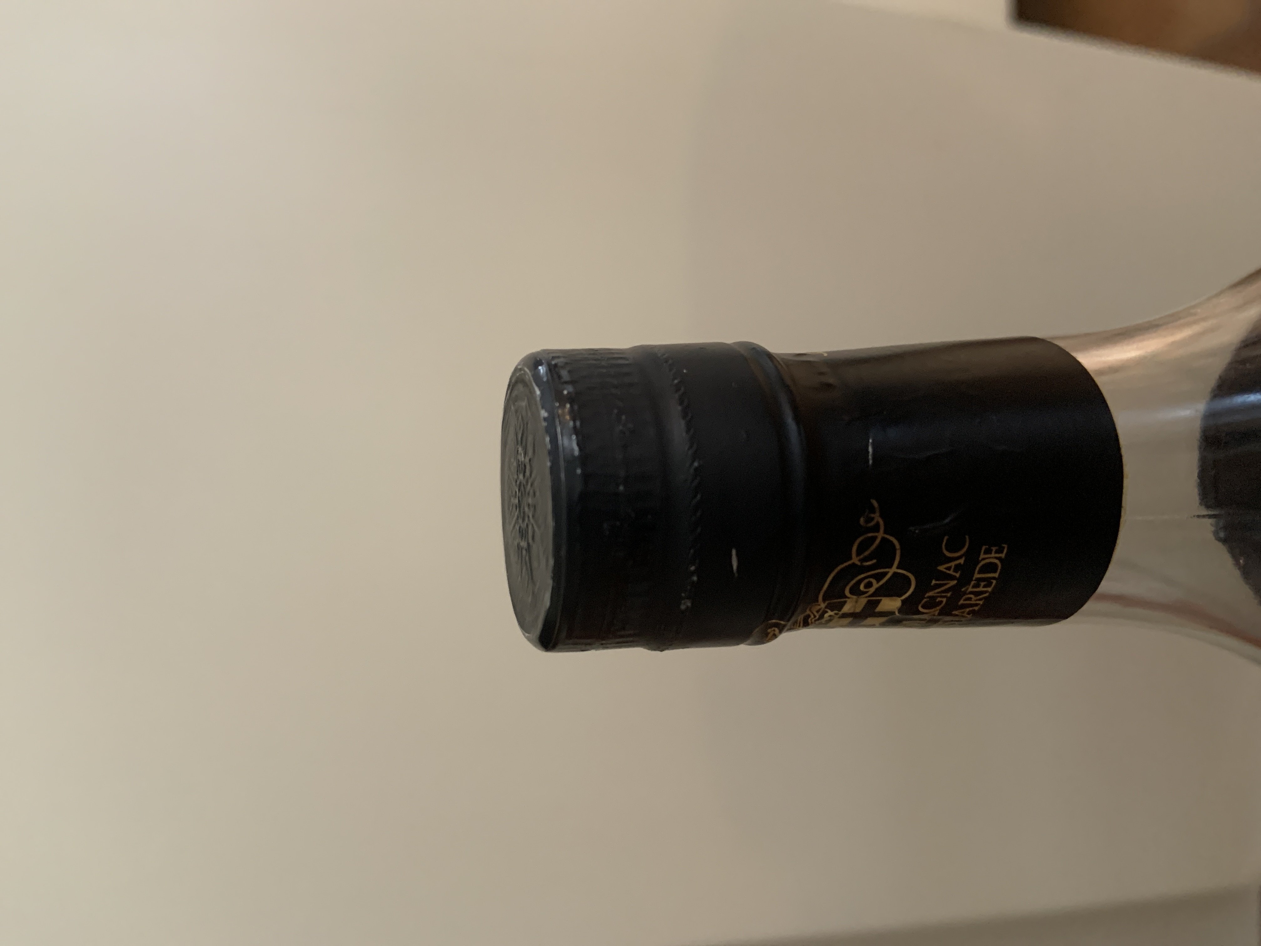- 1) Text on label: Front Label: CASTARÈDE BAS ARMAGNAC Appellation Bas Armagnac Contrôlée 1956 32240 Mauléon d'Armagnac (Gers) 70 cl 40% vol. Product of France Back Label: Notre Maison est la plus ancienne Maison d'Armagnac en France. Notre famille vous apporte la garantie et la traçabilité de nos millésimes que nous collectionnons depuis 1832. Conservés et vieillis en fût de chêne, nos Armagnacs ont été mis en bouteille le 5 Déc. 2022 et sont expertisés sous le lot nº 562.03N WWW.ARMAGNAC-CASTARED E. FR Neck/Capsule: ARMAGNAC CASTARÈDE 2) Visual elements: Neck/Capsule: A black capsule covers the cork and upper neck. It features a gold emblem (a shield with a cross, topped by a helmet and plumes, surrounded by scrollwork) on the upper neck. Below the emblem, the words "ARMAGNAC CASTARÈDE" are printed in gold, all-caps sans-serif text. The very top of the capsule has an embossed, intricate, stylized floral or geometric pattern. Front Label: This is an off-white, rectangular label with slightly rounded corners. The main family name "CASTARÈDE" and the vintage "1956" are in a large, bold serif font. "BAS ARMAGNAC" is in a bold sans-serif font, while other details like "Appellation Bas Armagnac Contrôlée", address, volume, and alcohol percentage are in a smaller, regular sans-serif font. Back Label: This is an off-white, smaller rectangular label with slightly rounded corners. All text on this label, including the descriptive paragraphs and website, uses a consistent serif font. 3) Fill level estimate: well above shoulder into neck: great