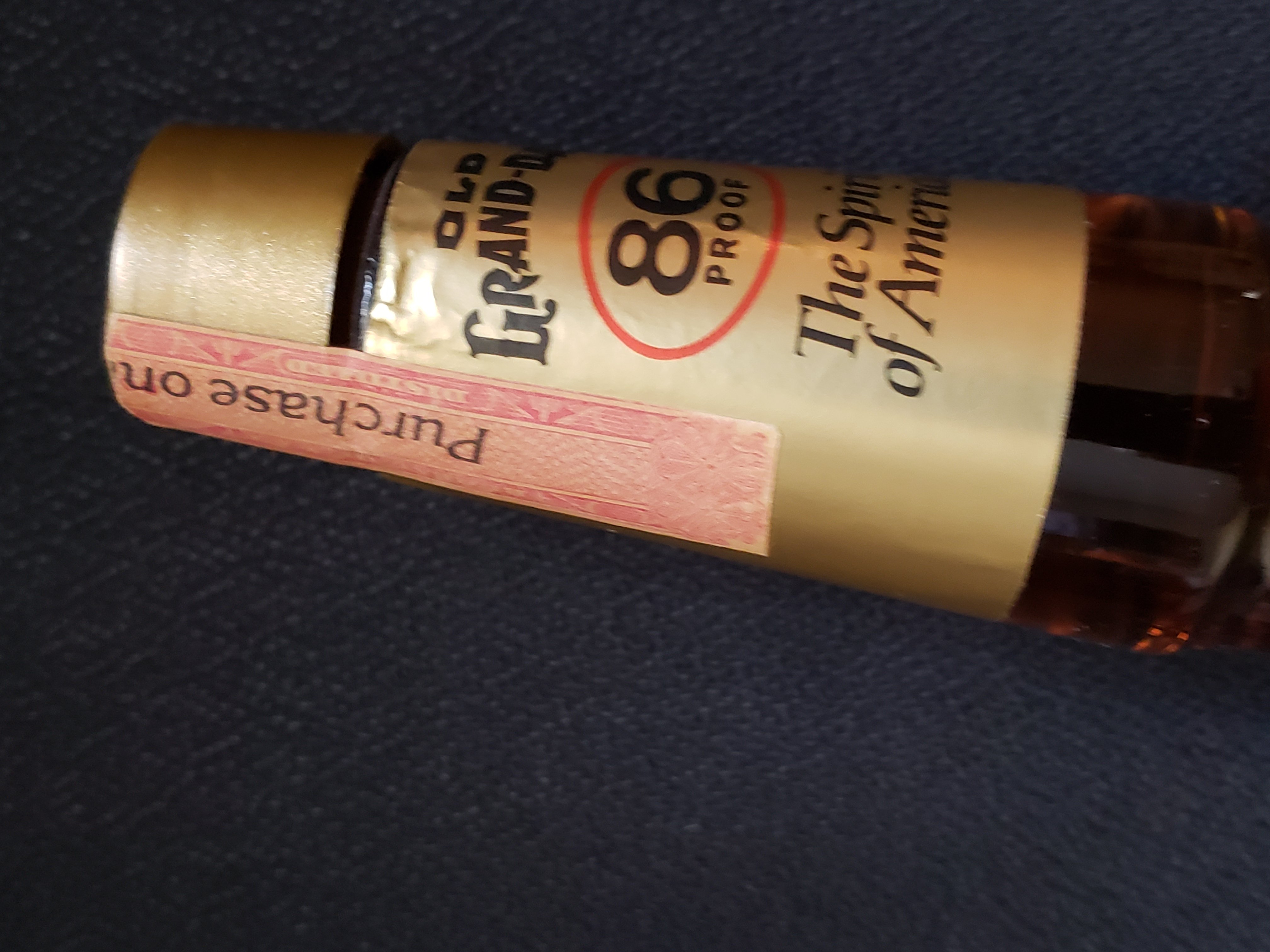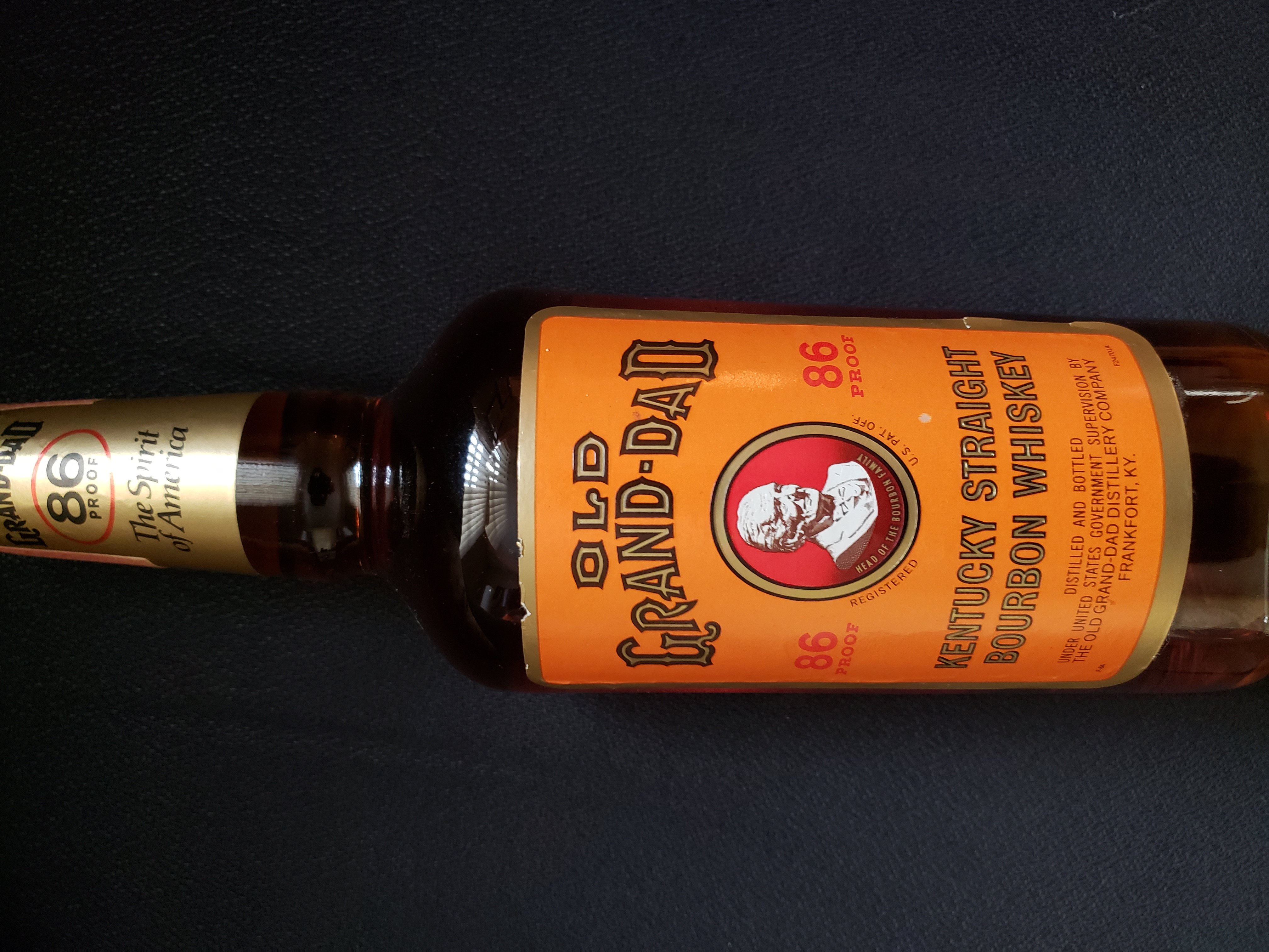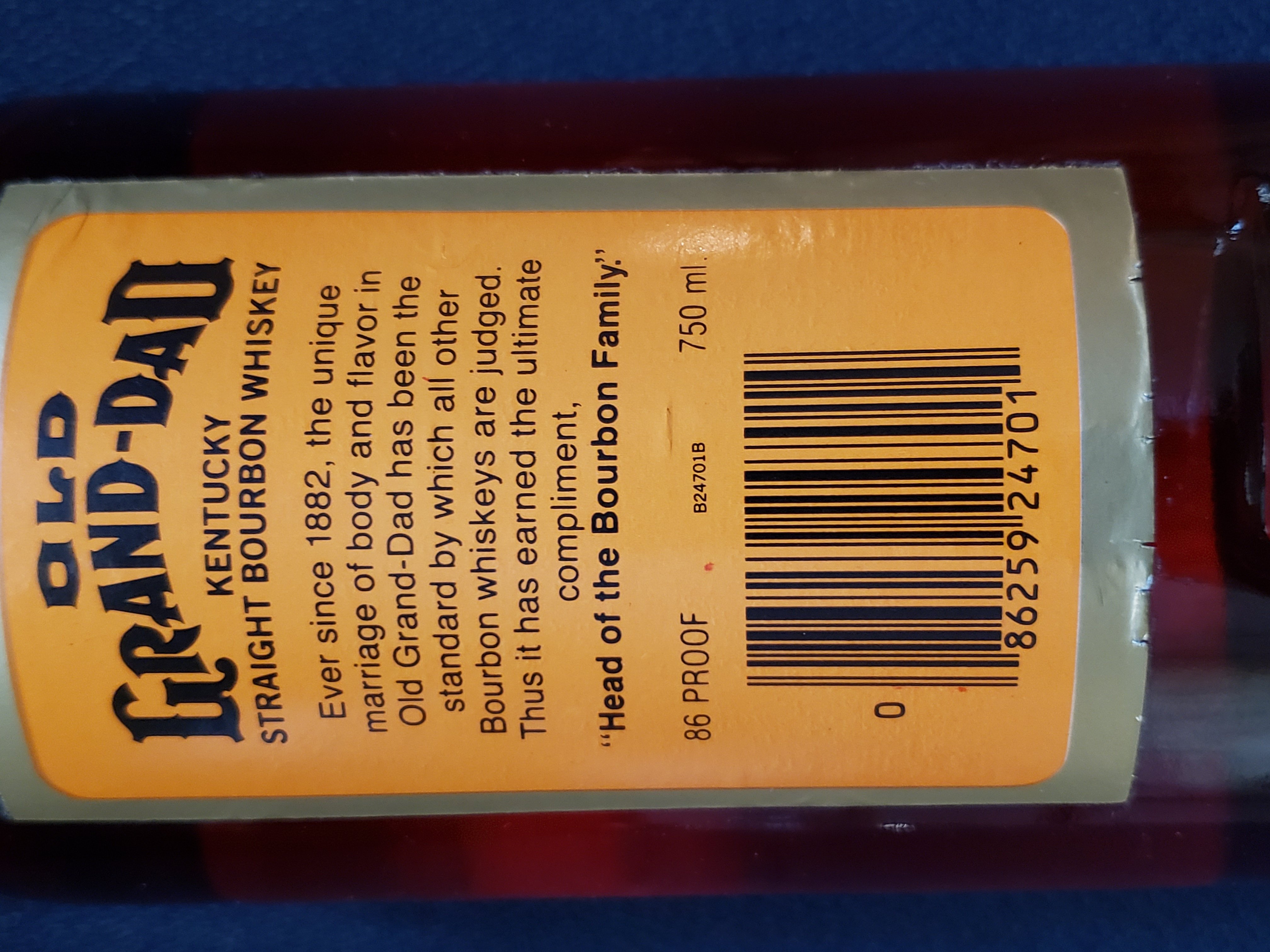 - 1) Text on label: Neck Label (Gold foil with red oval): OLD GRAND-DAD 86 PROOF The Spirit of America Purchase on (partially obscured, diagonal red strip) Front Label (Orange): OLD GRAND-DAD 86 PROOF (left of portrait) REGISTERED (arc around portrait) HEAD OF THE BOURBON FAMILY. (arc around portrait) U.S. PAT. OFF. (arc around portrait) 86 PROOF (right of portrait) KENTUCKY STRAIGHT BOURBON WHISKEY DISTILLED AND BOTTLED UNDER UNITED STATES GOVERNMENT SUPERVISION BY THE OLD GRAND-DAD DISTILLERY COMPANY FRANKFORT, KY. F24701A (bottom right) F-84 (bottom left, partly obscured) Back Label (Orange): OLD GRAND-DAD KENTUCKY STRAIGHT BOURBON WHISKEY Ever since 1882, the unique marriage of body and flavor in Old Grand-Dad has been the standard by which all other Bourbon whiskeys are judged. Thus it has earned the ultimate compliment, “Head of the Bourbon Family.” 86 PROOF B24701B 750 ml 0 86259 24701 2) Visual elements: Neck/Capsule: Gold foil capsule covers the cork/top. A small red oval with "86 PROOF" is on the front of the neck. A red, textured, diagonal strip label extends from the capsule down the left side of the neck. Upper Label (front): Features "OLD GRAND-DAD" in a prominent, decorative block/serif font. Mid Label (front): A central circular medallion depicts a portrait of a bald man with a white beard (presumably "Grand-Dad") against a white background, encircled by a gold band with text. Lower Label (front): "KENTUCKY STRAIGHT BOURBON WHISKEY" appears in a sans-serif, block font, with distillery information below it in a smaller, sans-serif font. Back Label: Repeats "OLD GRAND-DAD" in the same decorative block/serif font as the front. The descriptive text is in a clear, standard sans-serif font. A barcode is present at the bottom. 3) Fill level estimate: above shoulder: good Reason: Visible air gap above the liquid.