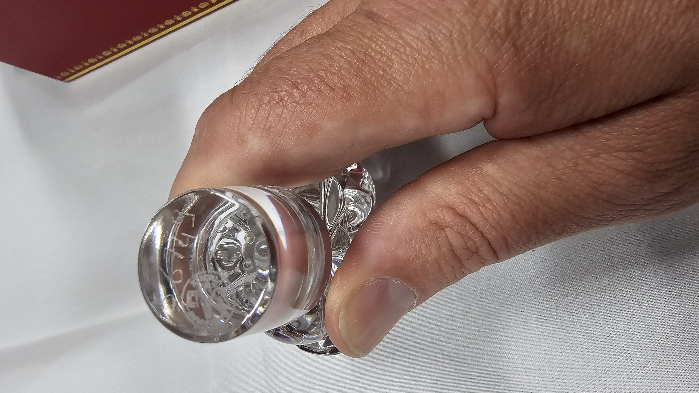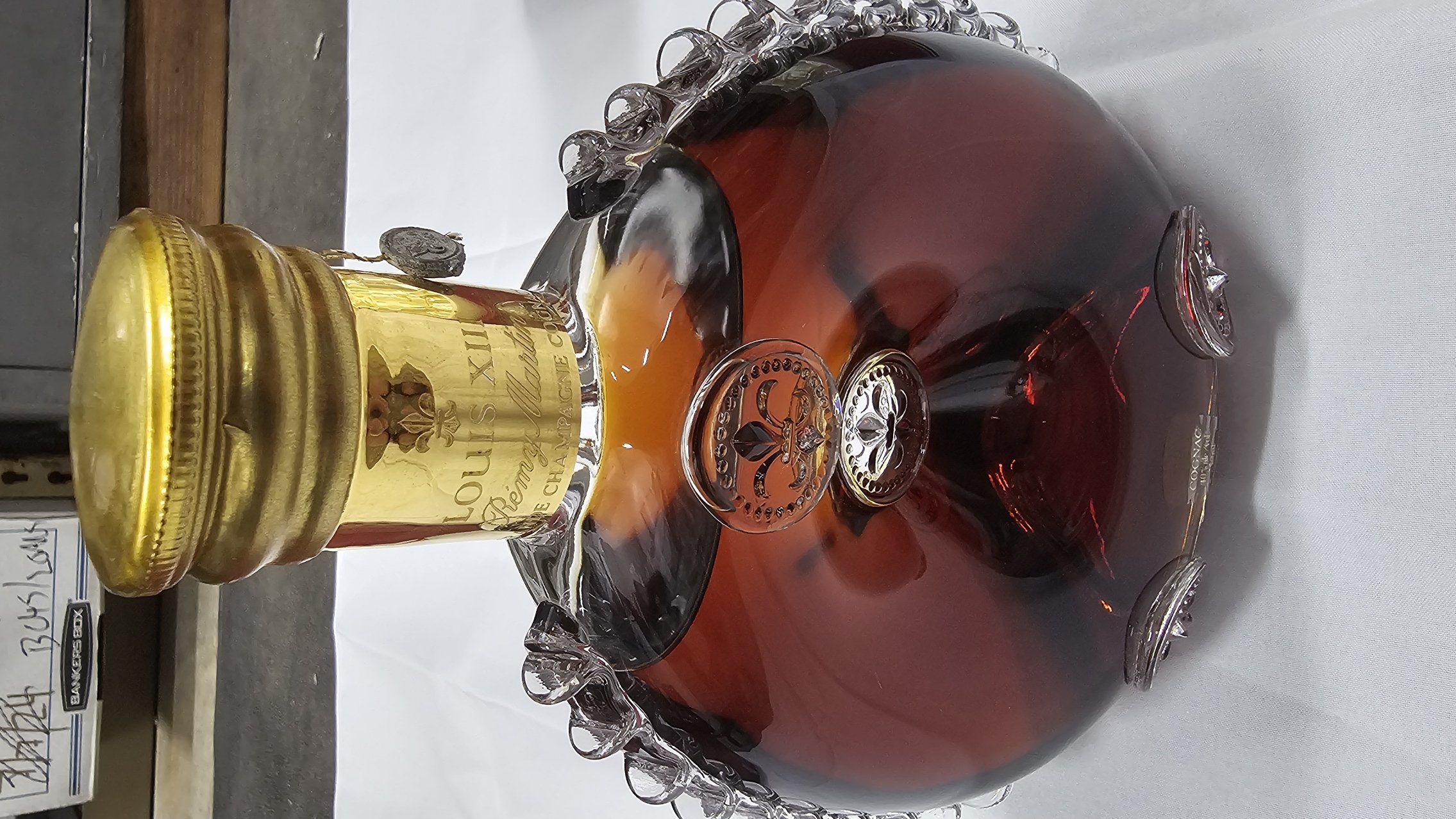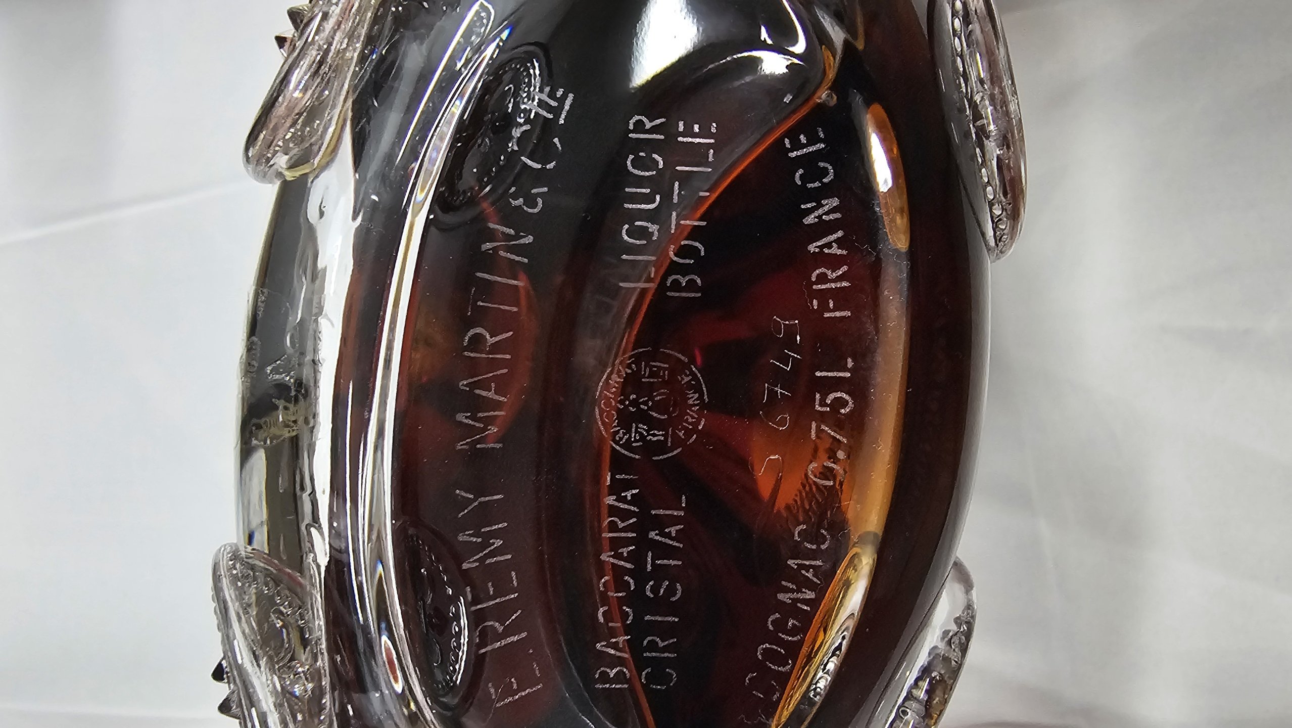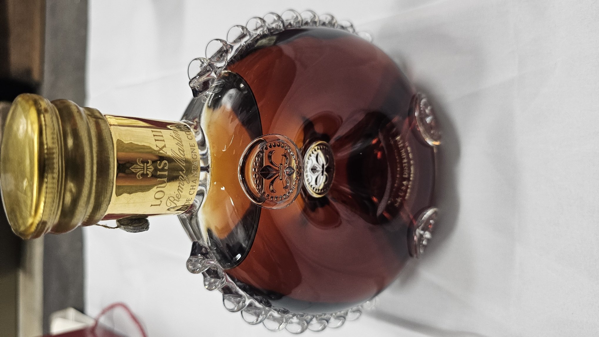 - 1) Text on label: On Gold Foil Neck Label (and Box Lid): LOUIS XIII de Rémy Martin GRANDE CHAMPAGNE COGNAC Engraved on Bottle Base: REMY MARTIN & Cie BACCARAT LIQUOR CRISTAL BOTTLE Nº 5674 COGNAC 0.75L FRANCE (Within a circular stamp on the base: BACCARAT FRANCE) 2) Visual elements: Bottle: Distinctive Baccarat crystal decanter with 12 fluted/scalloped clear crystal protrusions around the shoulder/mid-body and four clear crystal feet/medallions on the base. Neck/Capsule: A textured, pleated gold foil capsule covers the cork and neck. Upper label: Gold foil with black text, featuring a stylized crown/fleur-de-lis emblem above "LOUIS XIII". (Font styles: "LOUIS XIII" is serif; "de" is small sans-serif; "Rémy Martin" is cursive/script; "GRANDE CHAMPAGNE COGNAC" is uppercase sans-serif). Mid label: A prominent circular clear crystal medallion on the belly of the bottle, etched with a detailed fleur-de-lis emblem. Lower label/Base: The base has text engraved directly into the crystal (font style: uppercase sans-serif) and a small, circular, etched "BACCARAT FRANCE" stamp. Charm/Seal: A dark, circular wax-like seal or charm hangs from a chain attached to the gold capsule, depicting an emblem (appears to be a figure on horseback, though details are indistinct). 3) Fill level estimate: well above shoulder into neck: great