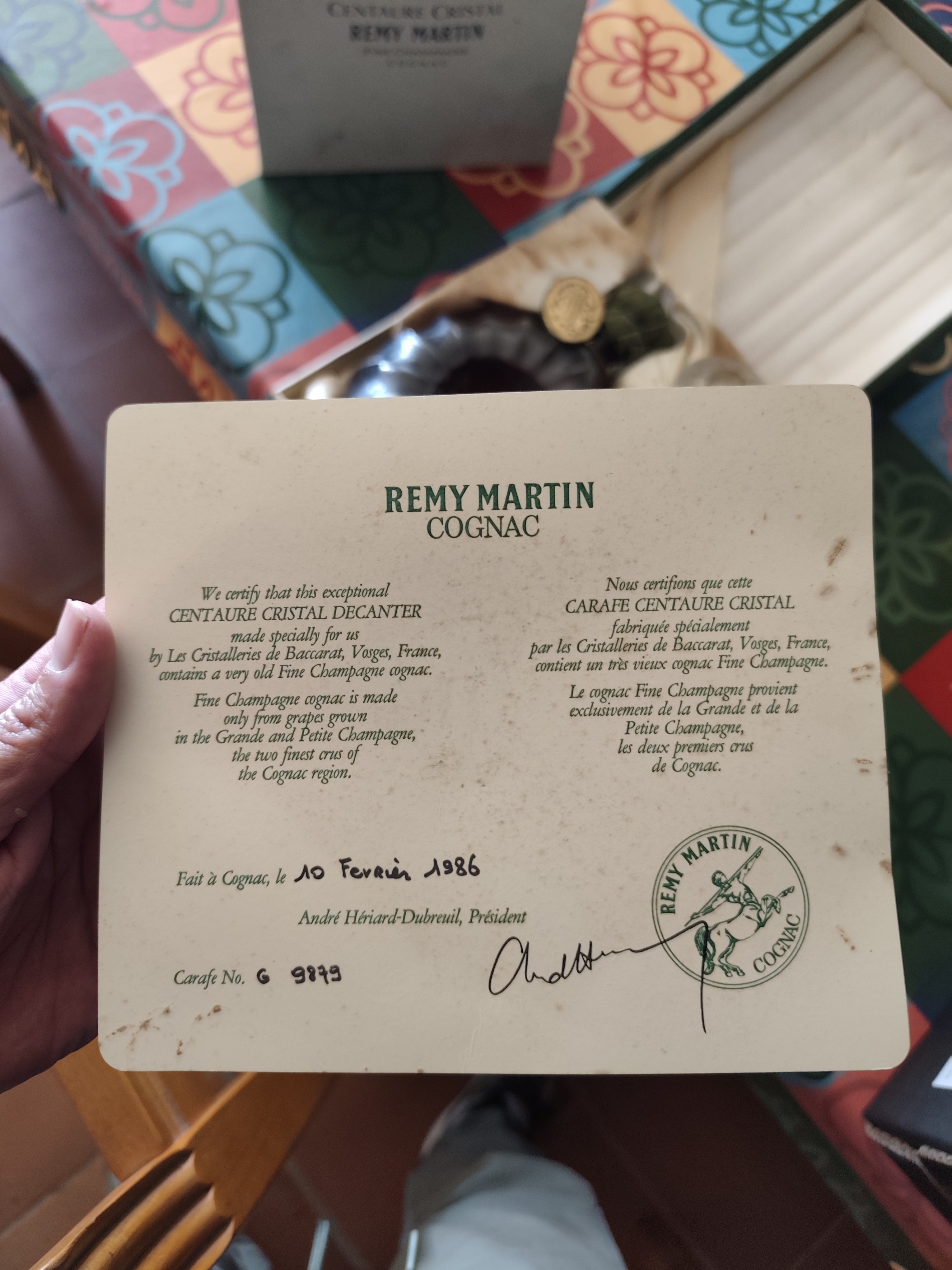 - 1) Text on label: On the certificate: REMY MARTIN COGNAC We certify that this exceptional CENTAURE CRISTAL DECANTER is made specially for us, by Les Cristalleries de Baccarat, Vosges, France, contains a very old Fine Champagne cognac. Fine Champagne cognac is made only from grapes grown in the Grande and Petite Champagne, the two finest crus of the Cognac region. Nous certifions que cette CARAFE CENTAURE CRISTAL fabriquée spécialement par Les Cristalleries de Baccarat, Vosges, France, contient un très vieux cognac Fine Champagne. Le cognac Fine Champagne provient exclusivement de la Grande et de la Petite Champagne, les deux premiers crus de Cognac. Fait à Cognac, le 10 Février 1986 André Hériard-Dubreuil, Président Carafe No. G 9899 On the medallion: REMY MARTIN FINE CHAMPAGNE COGNAC On the decanter (etched/embossed): Remy Martin 2) Visual elements: Decanter: A dark, fluted, flattened spherical decanter with "Remy Martin" etched or embossed near the bottom. Stopper: A clear crystal stopper with a fluted, circular design on its top. Neck: Wrapped in dark green velvet or fabric. Medallion: A gold-colored, oval medallion hangs from the neck, featuring a raised centaur emblem (Remy Martin logo) with text. Certificate (bottom right): A circular green stamp with the Remy Martin centaur logo (centaur with a spear) and the words "REMY MARTIN" and "COGNAC". This appears next to a cursive signature. Font styles: The certificate features a bold serif font for the main brand and product name ("REMY MARTIN COGNAC"), a clean serif font for the body text, a bold sans-serif for "CENTAURE CRISTAL DECANTER" and "CARAFE CENTAURE CRISTAL", and a cursive script for the signature. The medallion text is in a serif font. 3) Fill level estimate: well above shoulder into neck: great Reason: The liquid fills the decanter almost completely to the base of the short neck, with no visible air gap.