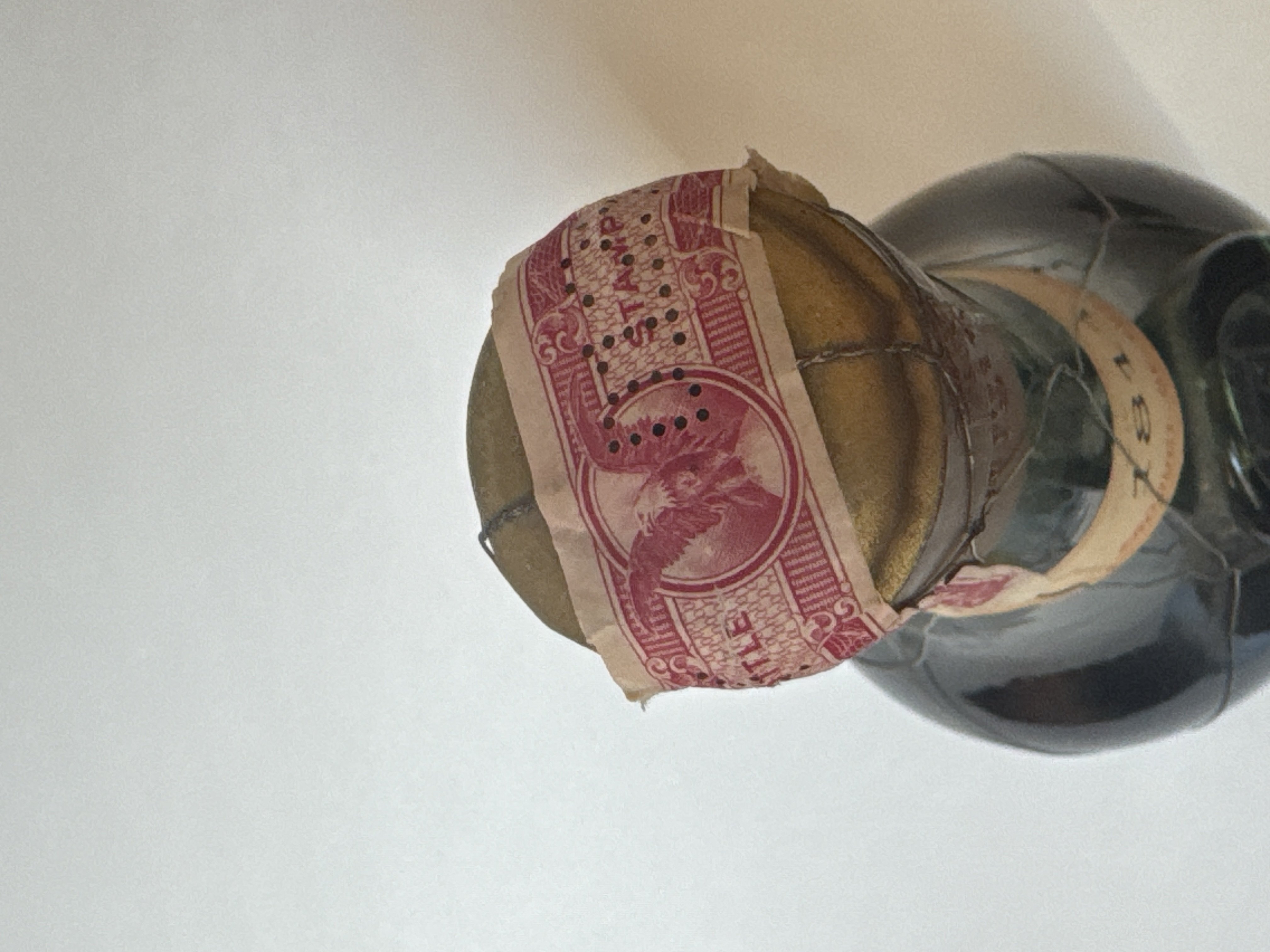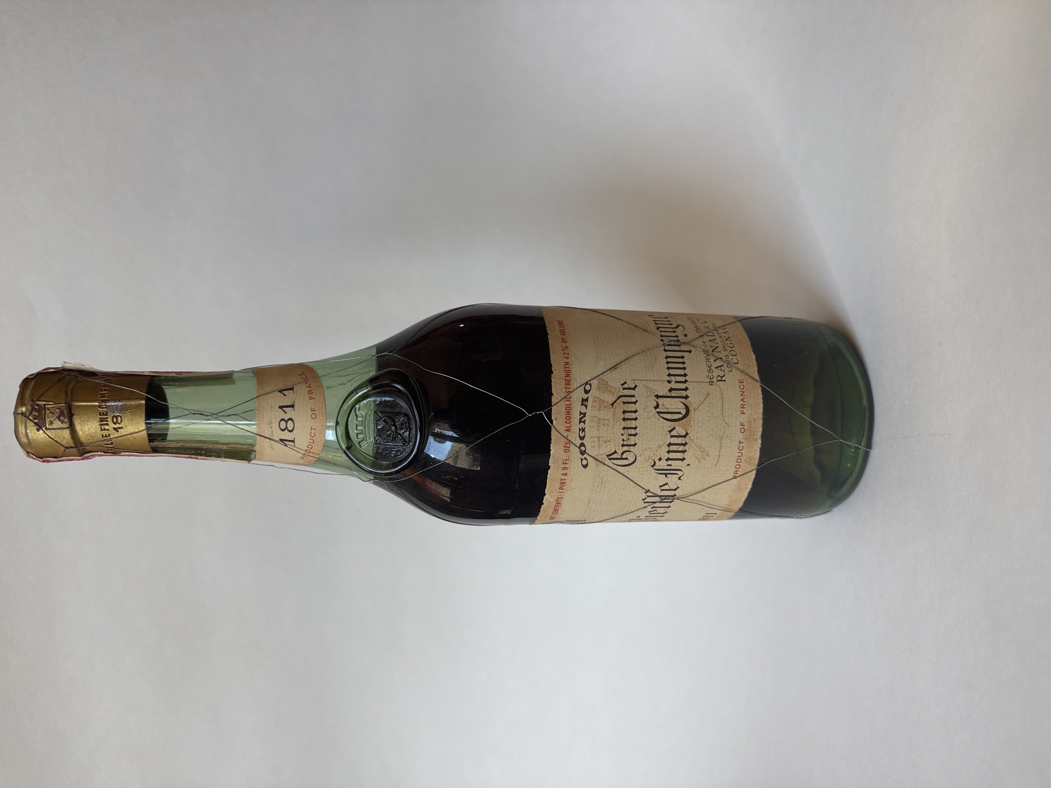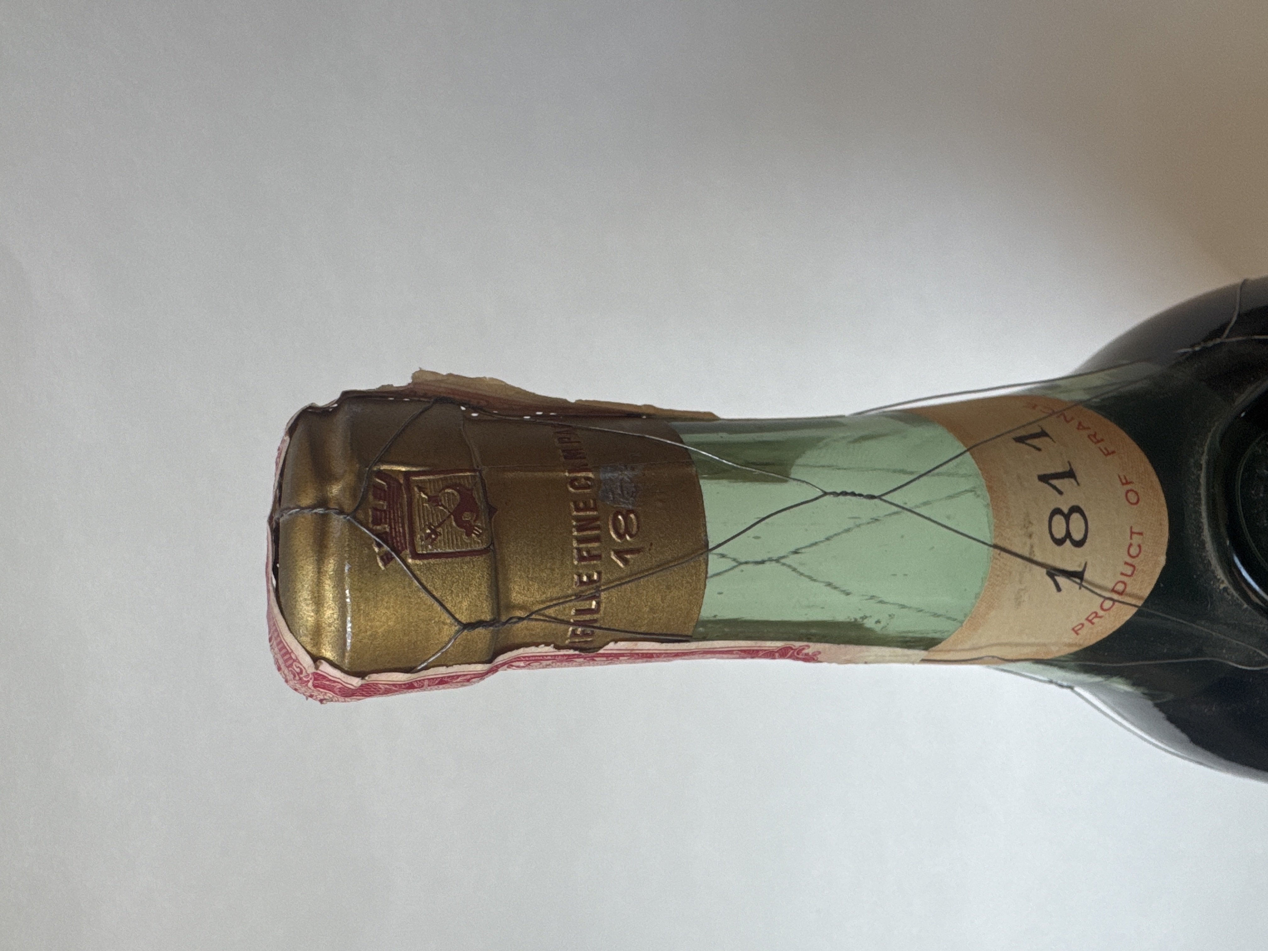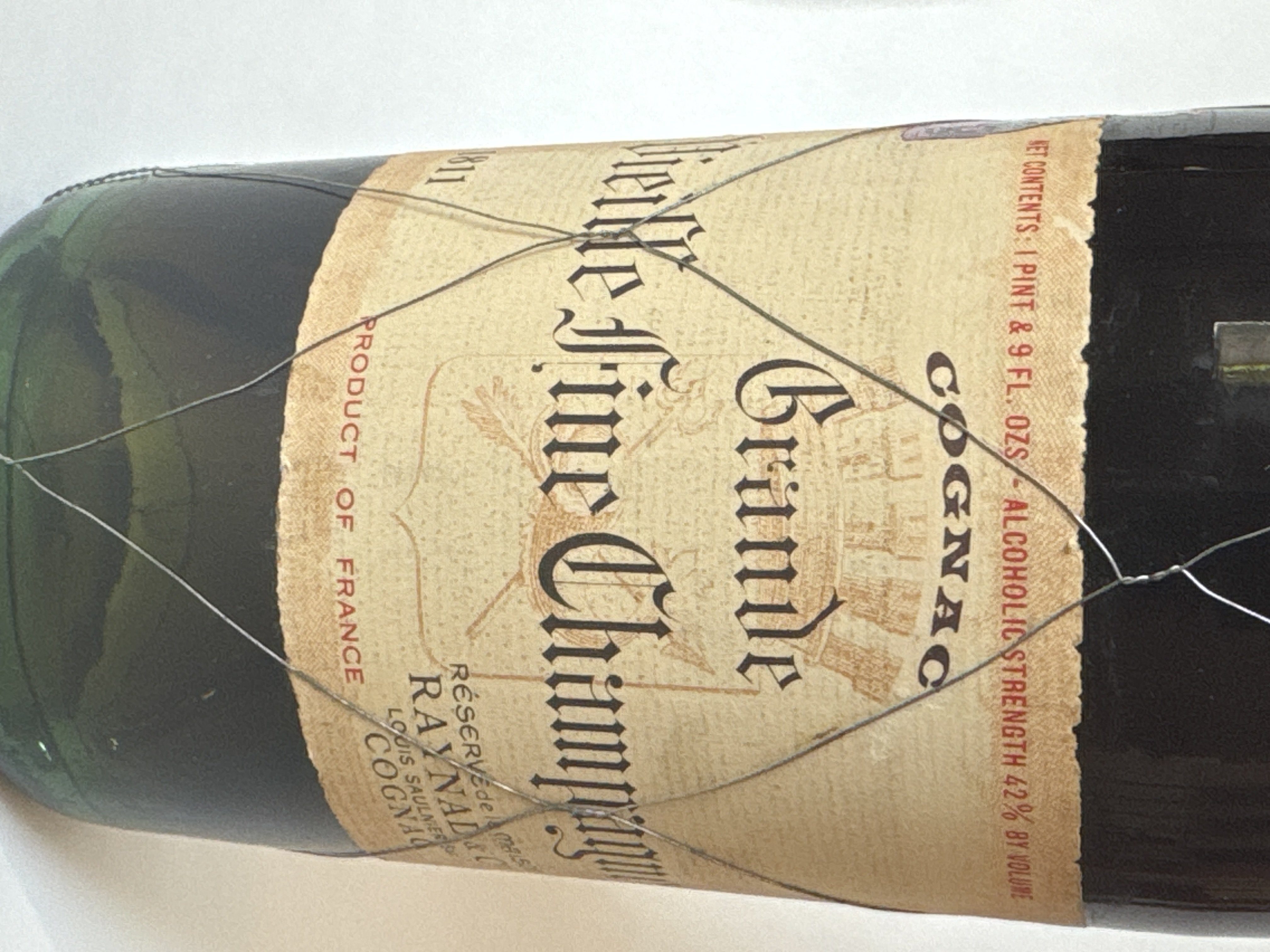- 1) Text on label: Neck Label (Front): 1811 PRODUCT OF FRANCE Main Front Label: NET CONTENTS: 1 PINT & 9 FL. OZS - ALCOHOLIC STRENGTH 42% BY VOLUME COGNAC Grande Vieille Fine Champagne RÉSERVÉ de la MAISON RAYNAL & C° LOUIS SAULNIER SUCᴿ COGNAC PRODUCT OF FRANCE Capsule/Foil: VIEILLE FINE CHAMPAGNE 1811 Tax Band (over capsule): BOTTLE STAMP Back Label (white strip): PRODUCT OF FRANCE Direct Importation under Bond N° F 468 Bottled many years before bottle - bottled fill IMPORTERS EAGLE PRODUCTS COMPANY INC. General Western Distributors LOS ANGELES (CALIF) LICENSE STAMP 2) Visual elements: Capsule: Gold foil with a small red and gold heraldic crest (crowned shield with an animal) on the upper front. Tax Band: A red and white paper strip label wrapped over the cork and capsule, featuring a central eagle graphic within a circle, and decorative border patterns. Embossed Seal: A circular green glass embossed seal on the upper shoulder of the bottle, depicting a crowned shield with an animal (likely a lion or griffin). Main Front Label: Features a central graphic of a crown above a shield, with a crossed sword and feather/quill behind it, integrated within the main title. Font Styles: Decorative script is used for "Grande Vieille Fine Champagne". Block sans-serif is used for "COGNAC" (main label) and "1811" (neck label). Most other functional text is in sans-serif, with "RÉSERVÉ de la MAISON" appearing in a serif font. 3) Fill level estimate: well above shoulder into neck: great Reason: Liquid is high in the neck with no visible air gap.