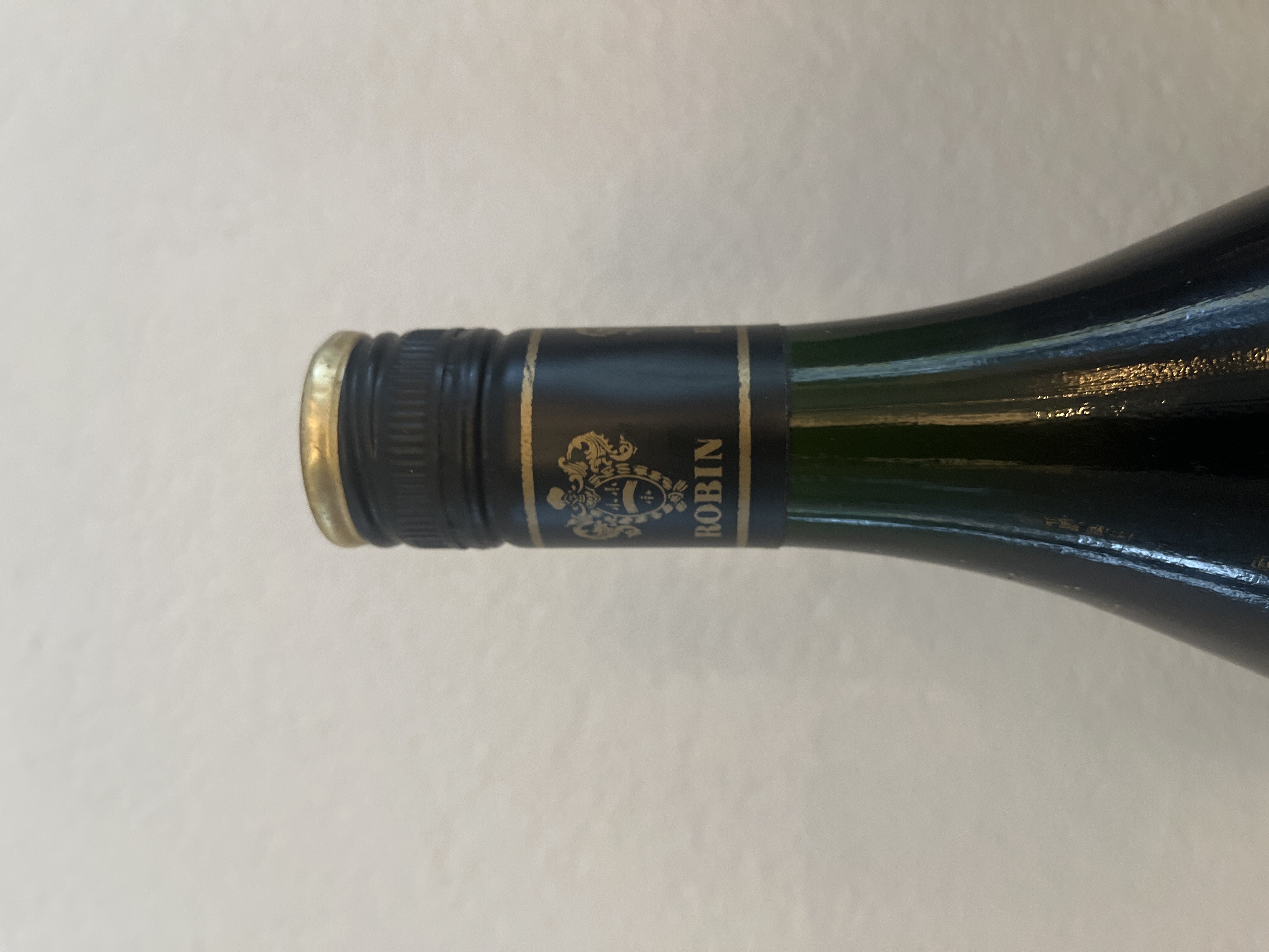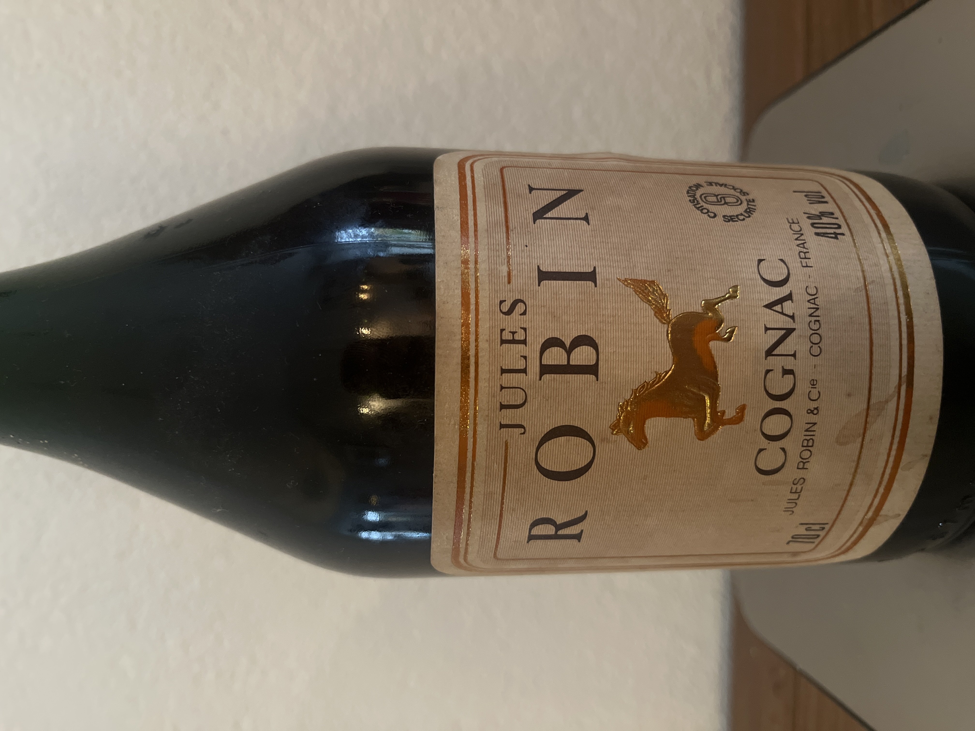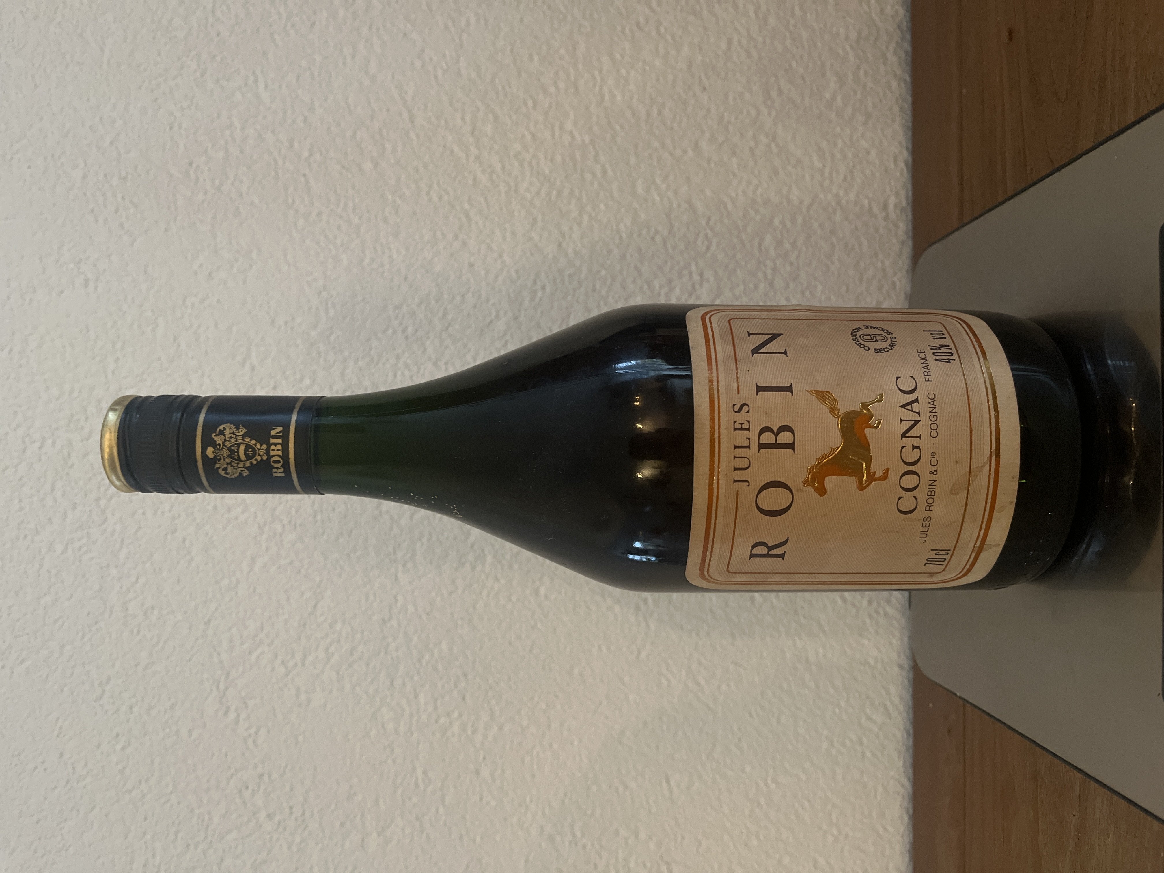 - 1) Text on label: Neck label: ROBIN Main label: JULES ROBIN COGNAC 70 cl JULES ROBIN & C° - COGNAC - FRANCE 40% vol (On circular seal to the right of the horse: COGNAC, APPELLATION CONTROLEE) Capsule top: PRODUCE OF FRANCE PRODUIT DE FRANCE 2) Visual elements Neck/Capsule: A gold crest/emblem featuring a shield (with symbols like a fleur-de-lis and stars) topped by a crown, flanked by decorative elements, appears on the neck label (gold on black) and centered on the gold capsule top. Gold bands are visible on the black capsule below the top. Mid label: A prominent gold graphic of a prancing horse (or possibly a stylized unicorn) is centered. To its right, a small circular gold-bordered seal contains "COGNAC" and "APPELLATION CONTROLEE" in black text, with an indistinct symbol in the center. The main label has a double gold line border. Font styles: "JULES" uses a thin serif font. "ROBIN" (on both main and neck labels) uses a large, bold serif font. "COGNAC" (on main label) uses a bold sans-serif font. The smaller text (e.g., "70 cl", "JULES ROBIN & C° - COGNAC - FRANCE", "40% vol") and the text on the circular seal and capsule top use sans-serif fonts. 3) Fill level estimate: well above shoulder into neck