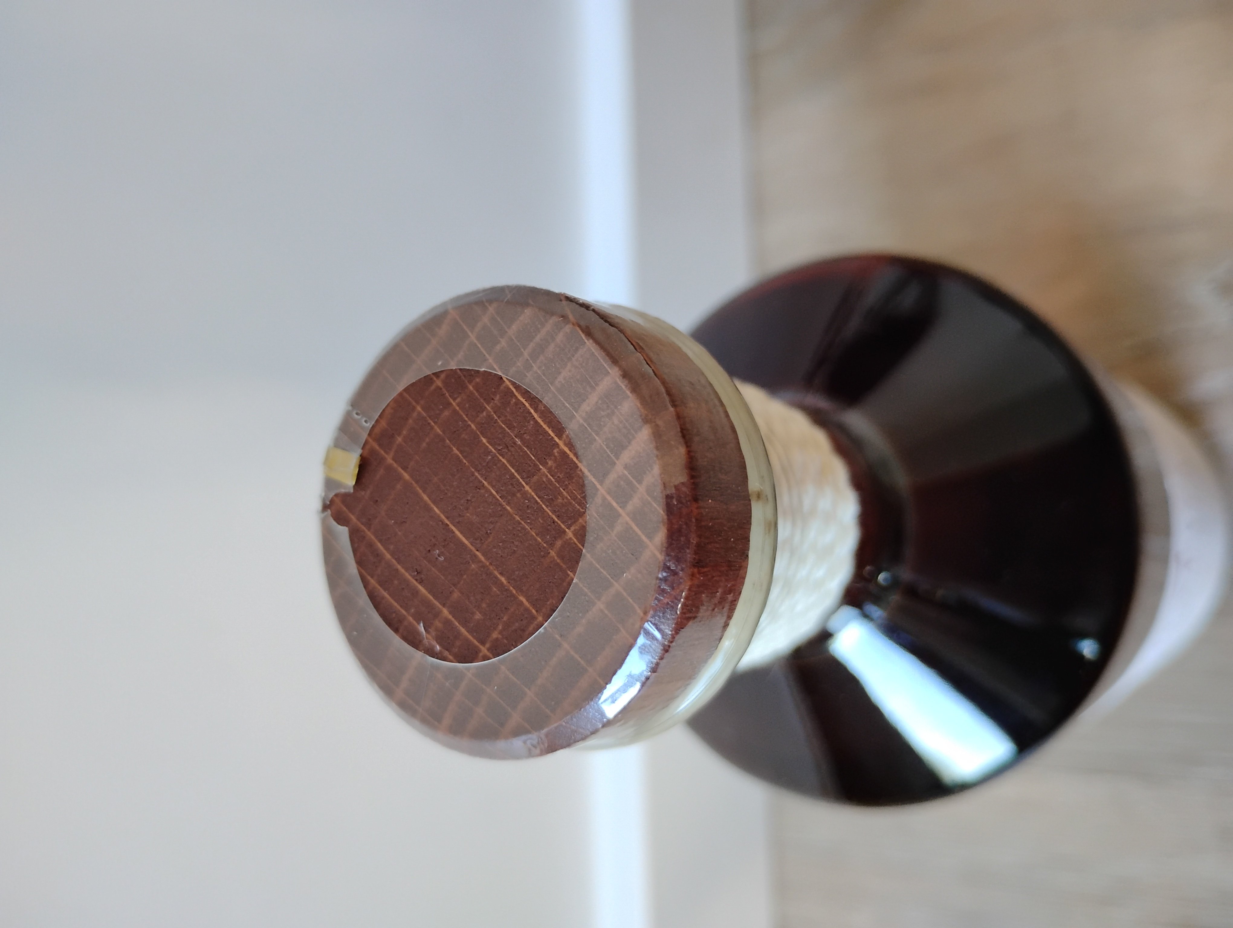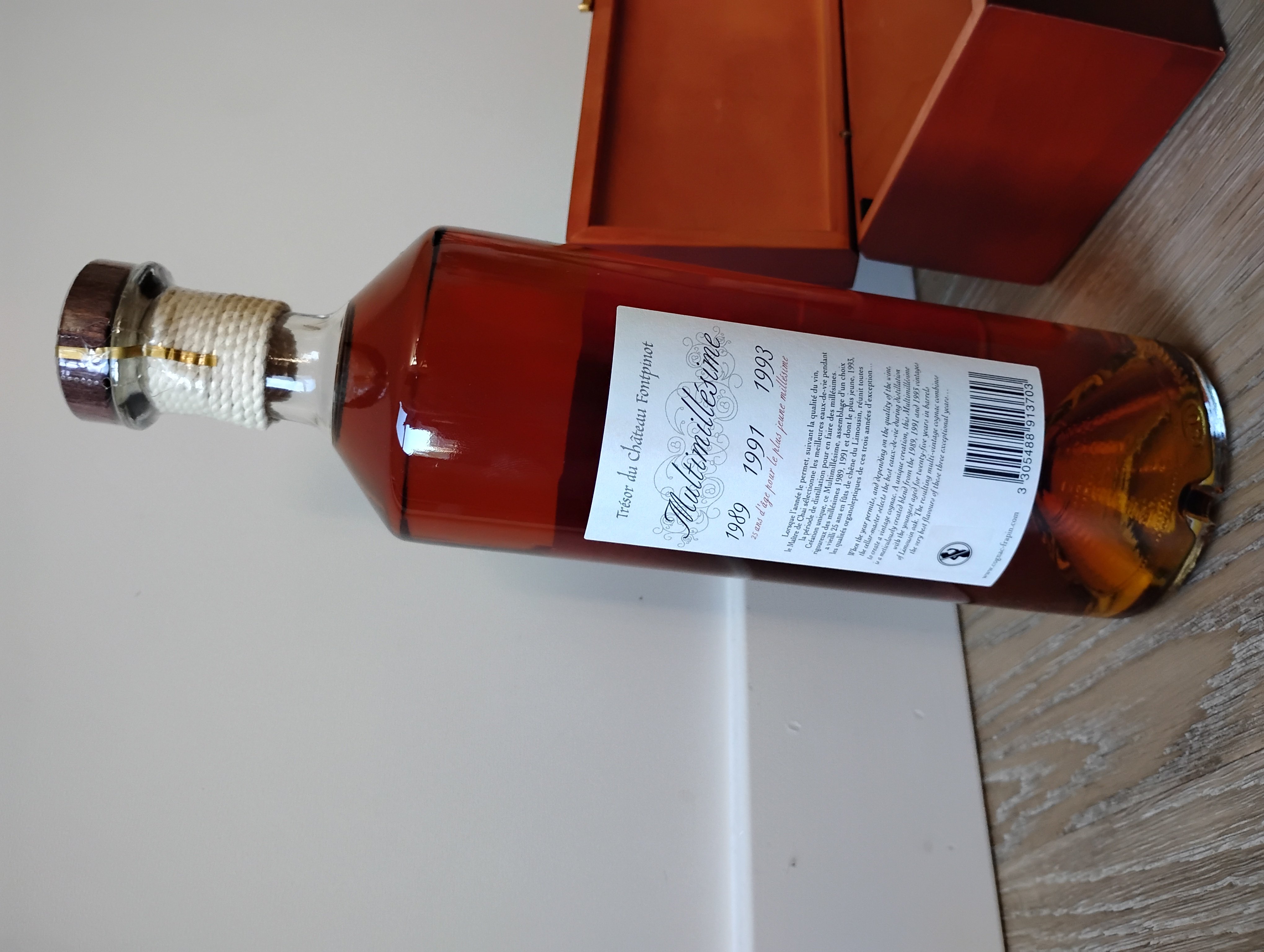 - 1) Text on label: COGNAC FRAPIN Trésor du Château Fontpinot Multimillésime 1989 - 1991 - 1993 Cognac Grande Champagne Appellation Cognac Grande Champagne Contrôlée Premier Cru de Cognac Série n°7 - N° 1644 70 cl Produce of France 40,8% vol. Domaine Château de Fontpinot - Segonzac (Charente) 25 ans d'âge pour le plus jeune millésime Lorsque l'année le permet, suivant la qualité du vin, le Maître de Chai sélectionne les meilleures eaux-de-vie pendant la période de distillation pour en faire des millésimes. Création unique, ce Multimillésime, assemblage d'un choix rigoureux des millésimes 1989, 1991 et dont le plus jeune, 1993, a vieilli 25 ans en fûts de chêne du Limousin, réunit toutes les qualités organoleptiques de ces trois années d'exception... When the year permits, and depending on the quality of the wine, the cellar-master selects the best eaux-de-vie during distillation to create a vintage cognac. A unique creation, this Multimillésime is a meticulously created blend from the 1989, 1991 and 1993 vintages with the youngest aged for twenty-five years in barrels of Limousin oak. The resulting multi-vintage cognac combines the very best flavours of these three exceptional years!... www.cognac-frapin.com 3 305488 913703 2) Visual elements (concise): Neck/Cork: A woven rope/cord wraps around the mid-neck. The cork stopper is topped with a dark, textured wooden cap, partially covered by a clear circular seal with a small gold tab. Front label: White, irregular torn-edge shape. A small, stylized red feather-like emblem appears above "FRAPIN" (upper label). "Multimillésime" is in a decorative cursive/script font with flourishes. "FRAPIN" is in a bold serif font. "COGNAC" and the vintage years are in sans-serif. Other descriptive text is primarily in a refined serif font. Back label: Contains a barcode at the bottom. To the left of the barcode, a small, circular dark graphic (possibly a stylized initial or emblem) is present. Text is in a serif font. Box: Dark red wooden box. Gold lettering for "COGNAC" (sans-serif), "FRAPIN" (bold serif), and "Trésor du château Fontpinot" (serif) with the red feather emblem (upper part). "Multimillésime" (decorative cursive/script) is embossed in gold near the bottom, with a gold-colored metal plate below it displaying the vintage years "1989 - 1991 - 1993" in black sans-serif text. 3) Fill level estimate: Well above shoulder (very good). Liquid is high in the neck.