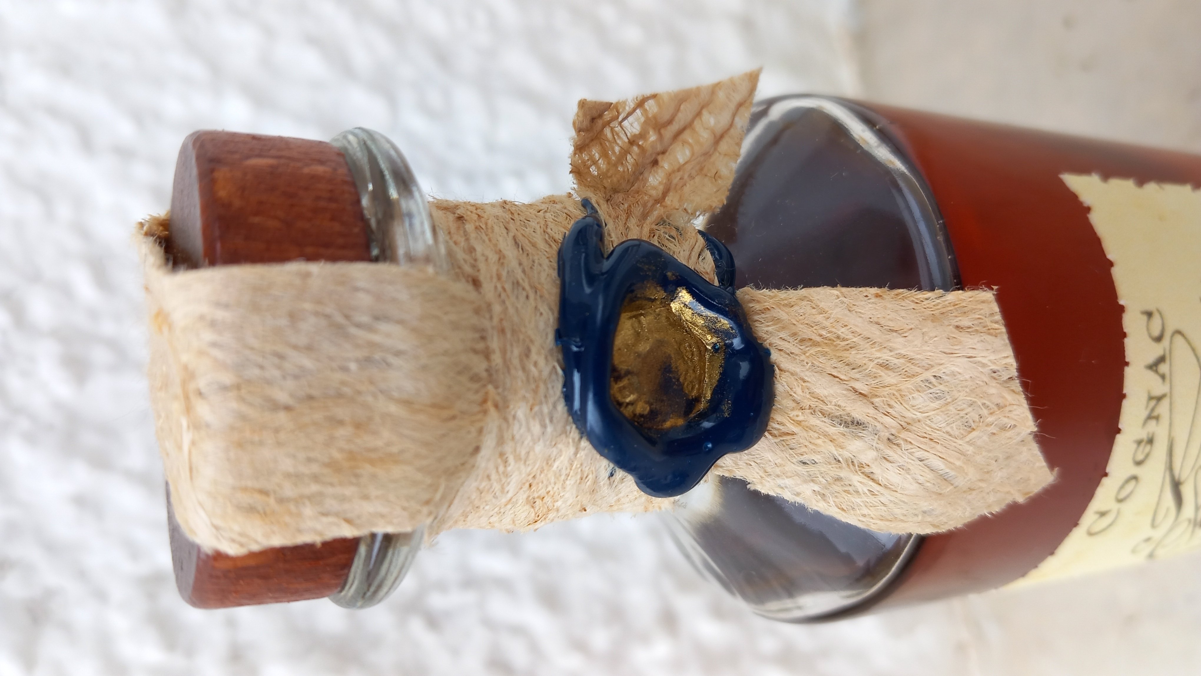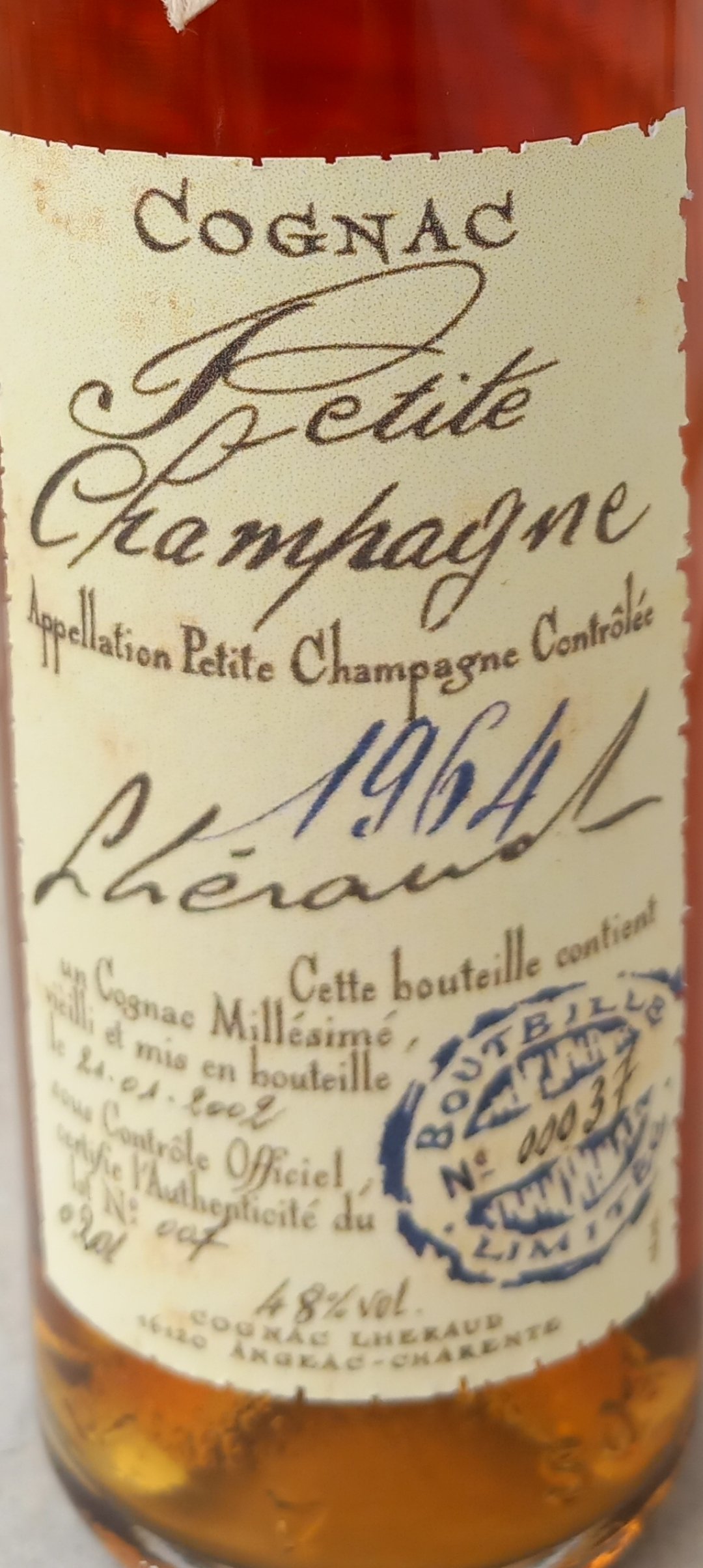 - 1) Text on label: COGNAC Petite Champagne Appellation Petite Champagne Controlée 1964 Lhéraud Cette bouteille contient un Cognac Millésimé, vieilli et mis en bouteille le 24.01.2002 sous Contrôle Officiel certifie l'Authenticité du lot N° 004 48% vol. COGNAC LHERAUD 16400 ANGEAC-CHARENTE (Within circular blue stamp on label): EMBOUTEILLE N° 0037 SÉRIE LIMITÉE 2) Visual elements: Label: A single, large, irregularly shaped label with slightly ragged edges covers the mid-section of the bottle. It has an aged, light beige/off-white appearance with a textured finish. Neck/Capsule: The cork is sealed with a wooden stopper. Around the neck, a rustic, light brown, fibrous ribbon is tied with twine. Wax Seal: A dark blue wax seal with a metallic gold imprint (an indistinct emblem/crest) is affixed to the front of the neck, securing the ribbon and twine. Stamp: A circular blue ink stamp, containing text and the number "0037", is visible on the lower right of the main label. Font styles: "COGNAC" is in a decorative serif font. "Petite Champagne" and "Lhéraud" are in an elegant, flowing script/cursive font. "Appellation Petite Champagne Controlée" and smaller informational text use a simple serif font. "1964" is in a bold, almost block-like serif font. Text within the blue stamp is a sans-serif, block-like font. 3) Fill level estimate: well above shoulder into neck: great Reason: The liquid fills most of the bottle's neck, just below the cork.