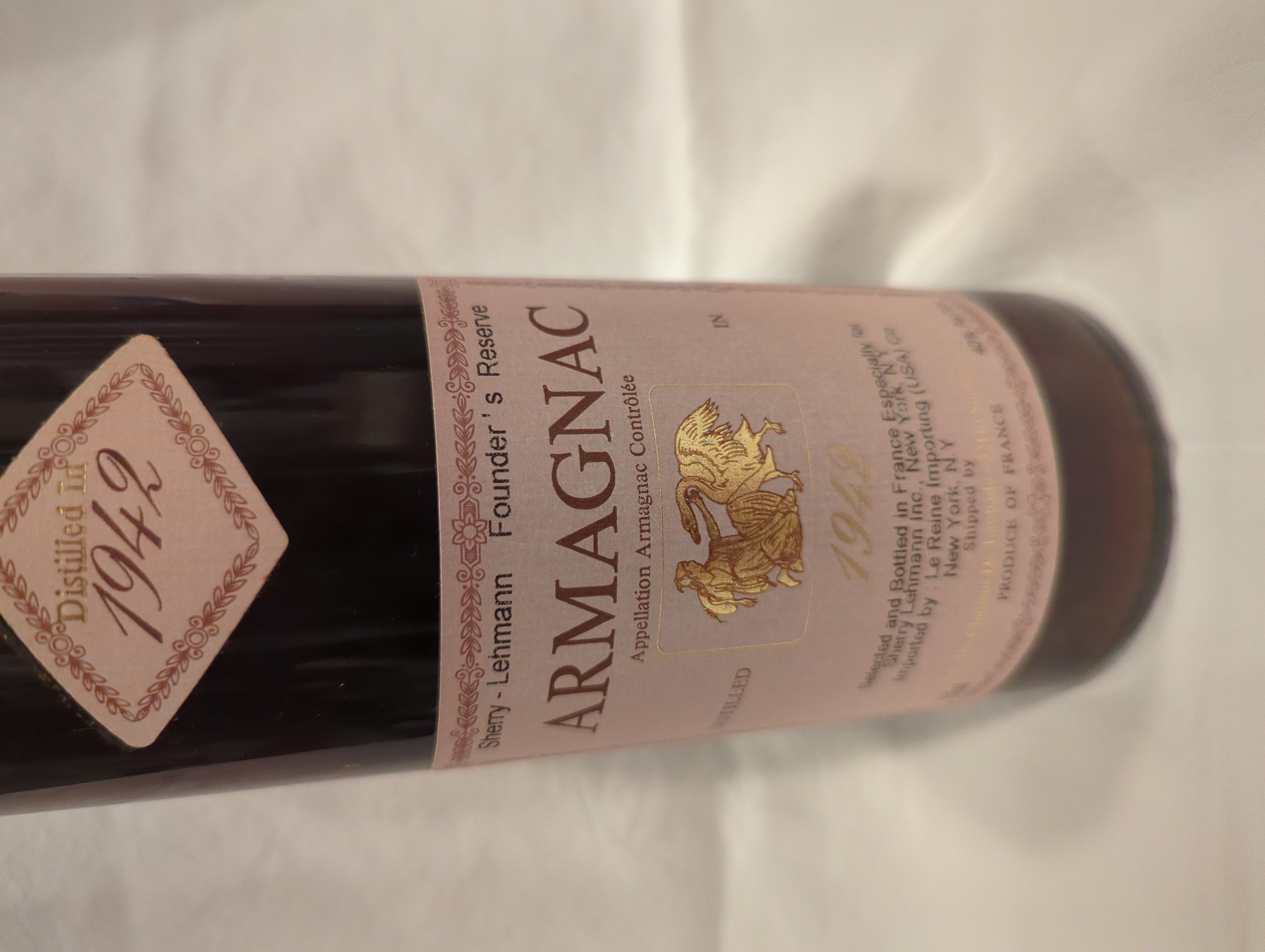 - This bottle of Armagnac was a gift from my uncle to my mother. The grapes were harvested in 1942 in Gascony, France in Sept 1942. There is a letter from my uncle describing how the Germans tried to find all the the distilled alcohol to fuel torpedos, but this batch remained hidden. My uncle was a collector and purchased this in New York and took it to Hawaii to give it to my mom in 2002 for her 60th birthday. Today is her 82nd birthday and