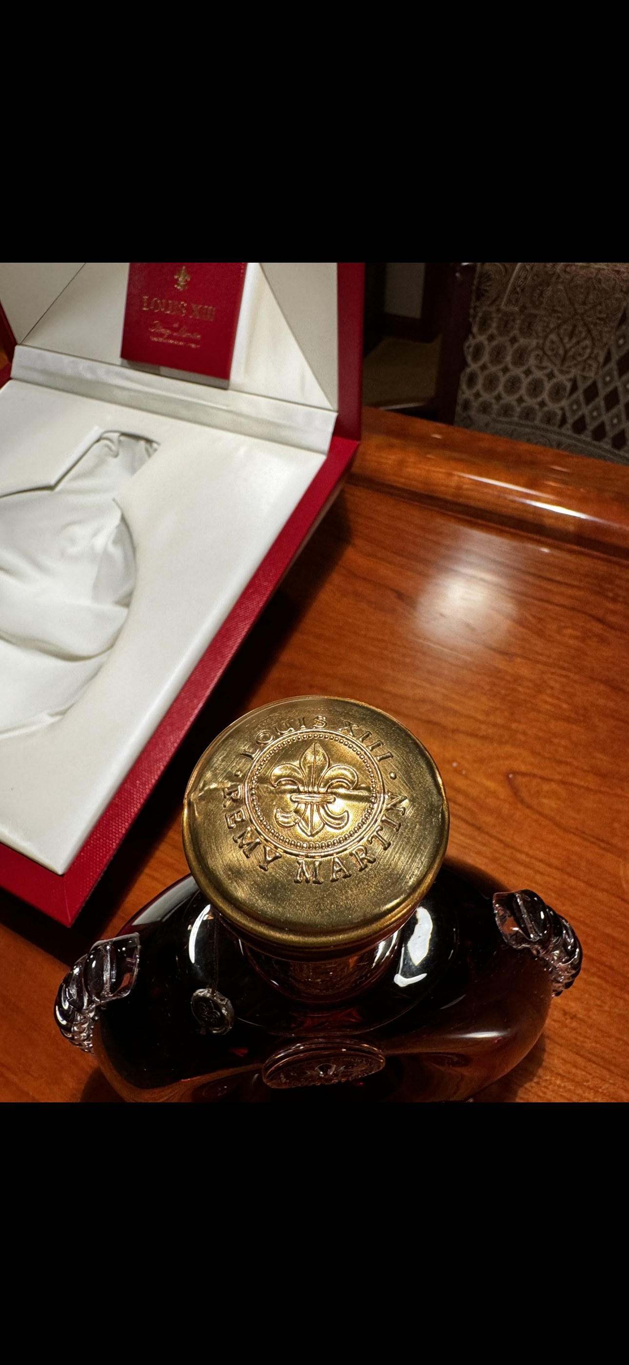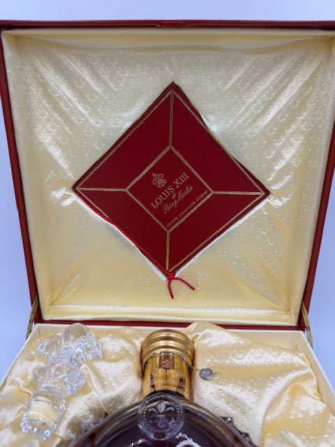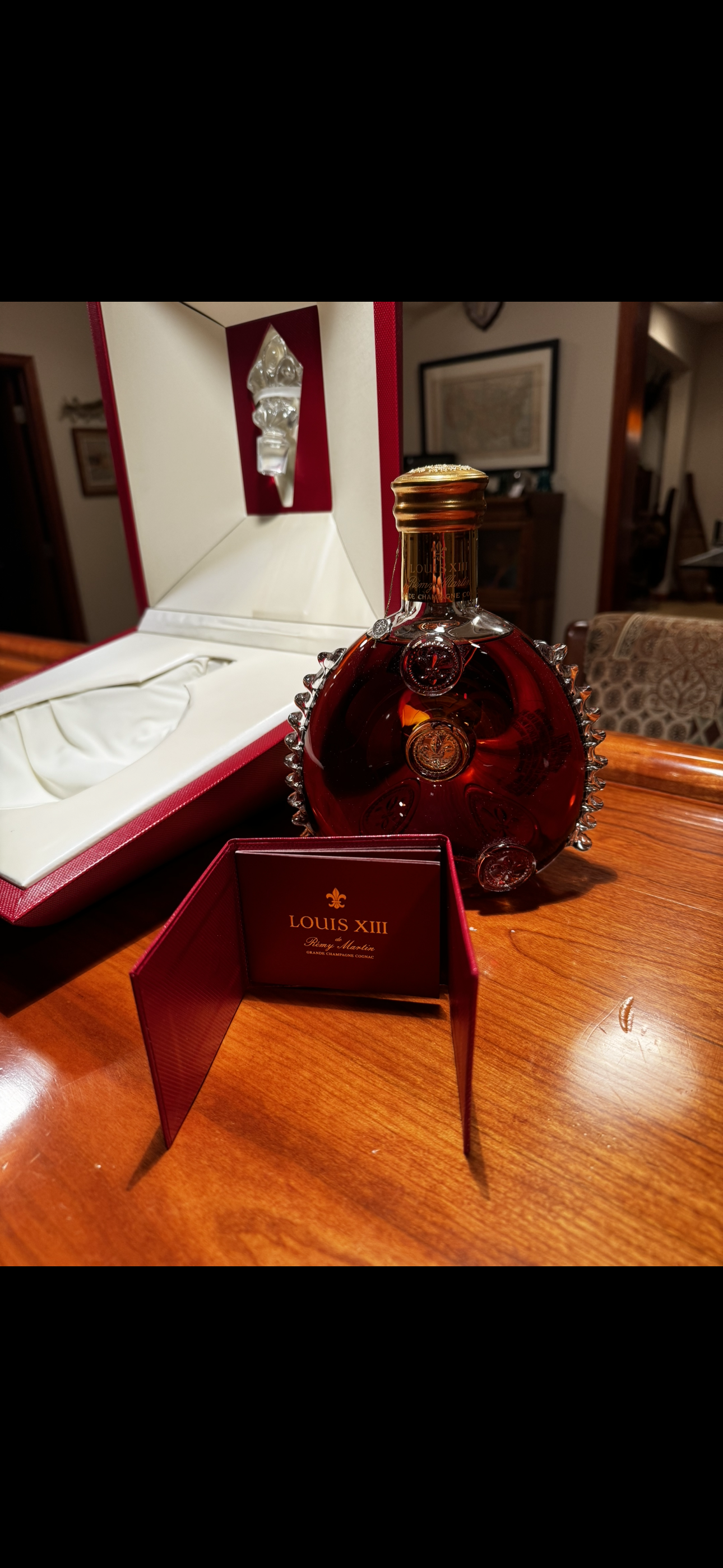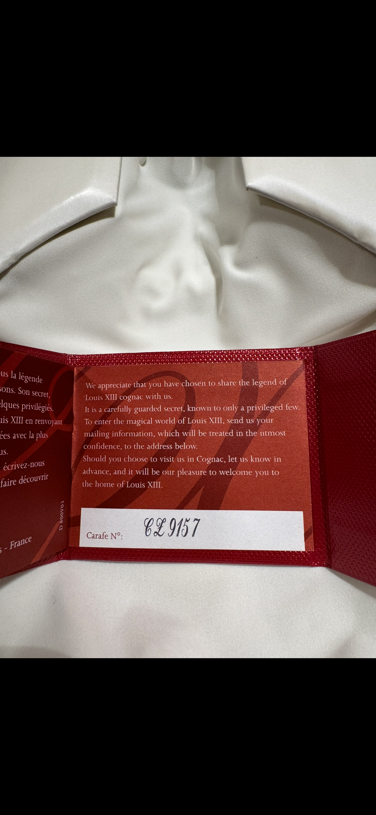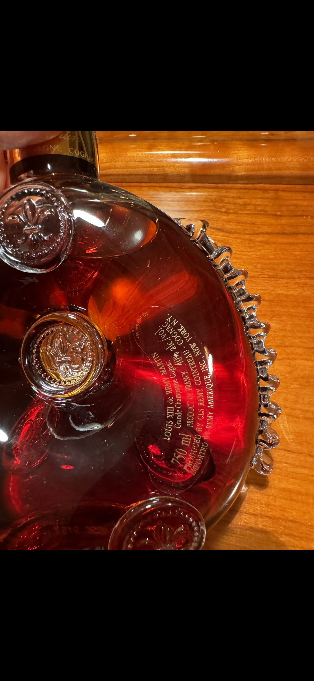 - 1) Text on label: LOUIS XIII Rémy Martin GRANDE CHAMPAGNE COGNAC PRODUCED BY E. RÉMY MARTIN & C° COGNAC, FRANCE IMPORTED BY RÉMY MARTIN AMERIQUE INC. NEW YORK, N.Y. 750 ml 40% ALC./VOL. (From accompanying booklet/packaging) LOUIS XIII Rémy Martin GRANDE CHAMPAGNE COGNAC We appreciate that you have chosen to share the legend of Louis XIII cognac with us. It is a carefully guarded secret, known to only a privileged few. To enter the mythical world of Louis XIII, send us your mailing information, which will be treated in the utmost confidence to the address below. Should you choose to visit us in Cognac, let us know in advance, and it will be our pleasure to welcome you to the home of Louis XIII. Carafe N°: CL9157 2) Visual elements: Bottle: The bottle features several embossed circular medallions with a fleur-de-lis design on the mid label. It also has a distinctive scalloped/rippled glass edge around its circumference. Font style on glass is primarily serif. Stopper: A gold metallic stopper is embossed with a central fleur-de-lis emblem, encircled by the words "LOUIS XIII" and "RÉMY MARTIN" in an embossed serif font. Packaging (Box & Booklet): The box and booklet feature gold rectangular labels against a red textured background. These labels display a gold fleur-de-lis emblem above the product name. Font styles on the main labels are serif; the body text inside the booklet is sans-serif, with "Louis XIII" rendered in serif. 3) Fill level estimate: well above shoulder into neck: great