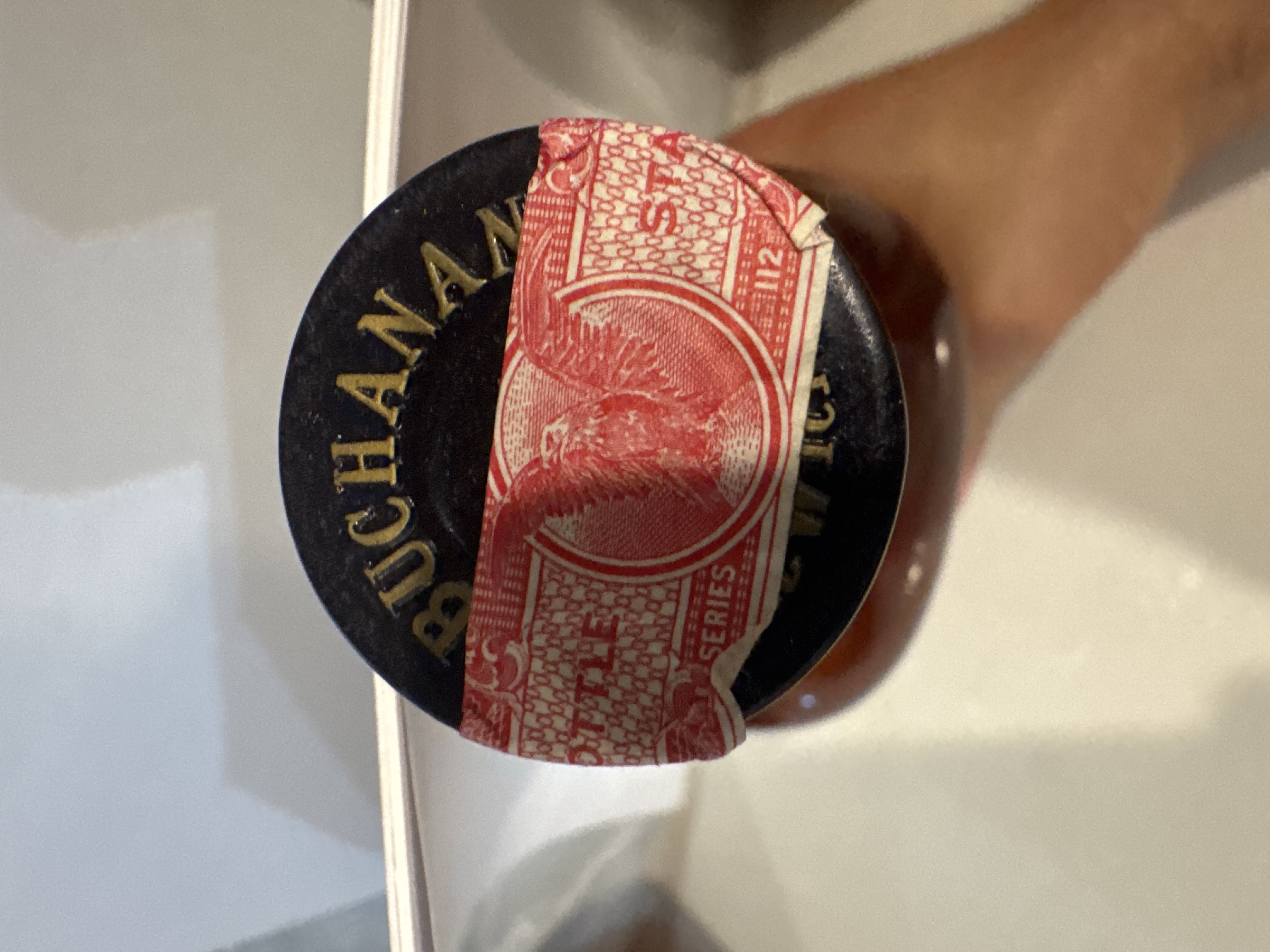 - 1) Text on label: Neck Capsule (front): BUCHANAN'S 12 Years Old Neck Capsule (top): BUCHANAN'S Neck Capsule (side strip - US Tax Strip): BOTTLE SERIES TAX PAID DISTILLED SPIRITS BUCHANAN'S SCOTCH WHISKY 112 HEUBLEIN, INC. HARTFORD, CONN. Main Front Label: BUCHANAN'S BY APPOINTMENT TO HER MAJESTY THE QUEEN SCOTCH WHISKY DISTILLERS JAMES BUCHANAN & CO. LTD. LONDON RESERVE Twelve Years Old FINEST BLENDED SCOTCH WHISKY DISTILLED BLENDED AND BOTTLED IN SCOTLAND James Buchanan & Co. Ltd. LIMITED 4/5 QUART 100% SCOTCH WHISKIES 86.8 PROOF PRODUCT OF SCOTLAND IMPORTED BY HEUBLEIN, INC., HARTFORD, CONN. SOLE DISTRIBUTOR, U.S.A. © H.I. Embossed on Glass (lower front): James Buchanan & Co. Ltd DISTILLERS GLASGOW. SCOTLAND BUCHANAN'S SCOTCH WHISKY 4/5 QUART UGB 26 D-2 Box Label (top): Buchanan's Reserve 2) Visual elements : Neck/Capsule: Dark blue capsule with gold arched text and a gold ring on the front enclosing "12 Years Old." A red and white patterned US tax strip, featuring a central circular emblem with a stylized eagle, runs vertically over the cork and down the side of the capsule. Main Label: A prominent circular red medallion with a gold outer border, featuring a detailed gold emblem resembling the Royal Arms of the United Kingdom (a shield flanked by a lion and a unicorn, topped with a crown). Below this, the label transitions to a black background with decorative gold star/ribbon-like patterns extending from the sides. Bottle: The lower front of the glass bottle has text embossed in a cursive style and block letters. Box Label: A small rectangular light beige label is affixed to the wooden box, featuring text in an elegant cursive script. Font Styles: Serif (e.g., "BUCHANAN'S" on main label, "Twelve Years Old"), Sans-serif (e.g., "FINEST BLENDED SCOTCH WHISKY," small print), Cursive/Script (e.g., "RESERVE," "James Buchanan & Co. Ltd." signature, text on box label), and Block (for some embossed text). 3) Fill level estimate: Estimate: Well above shoulder (very good). Reason: The liquid level is high in the neck, close to the base of the capsule.