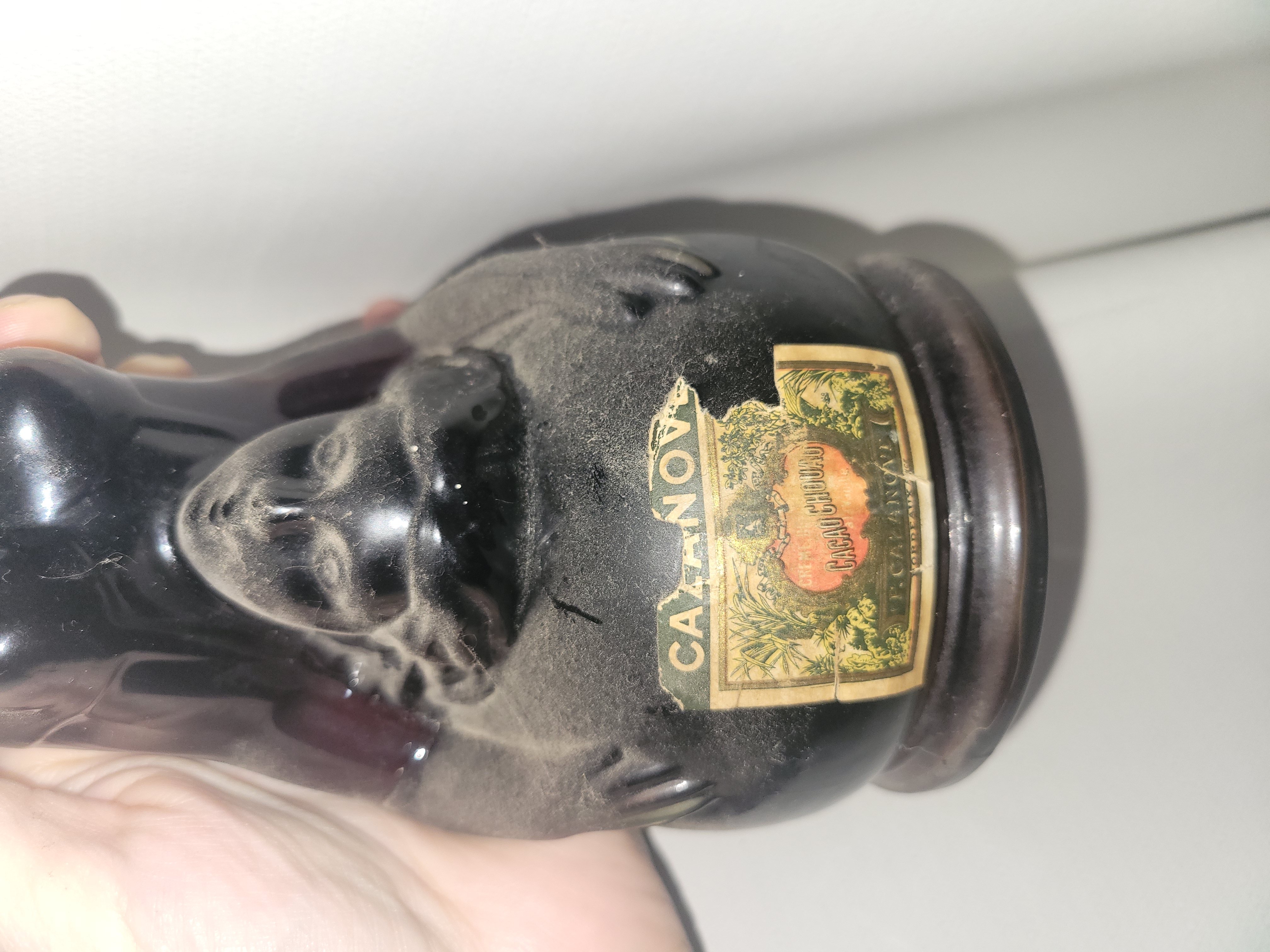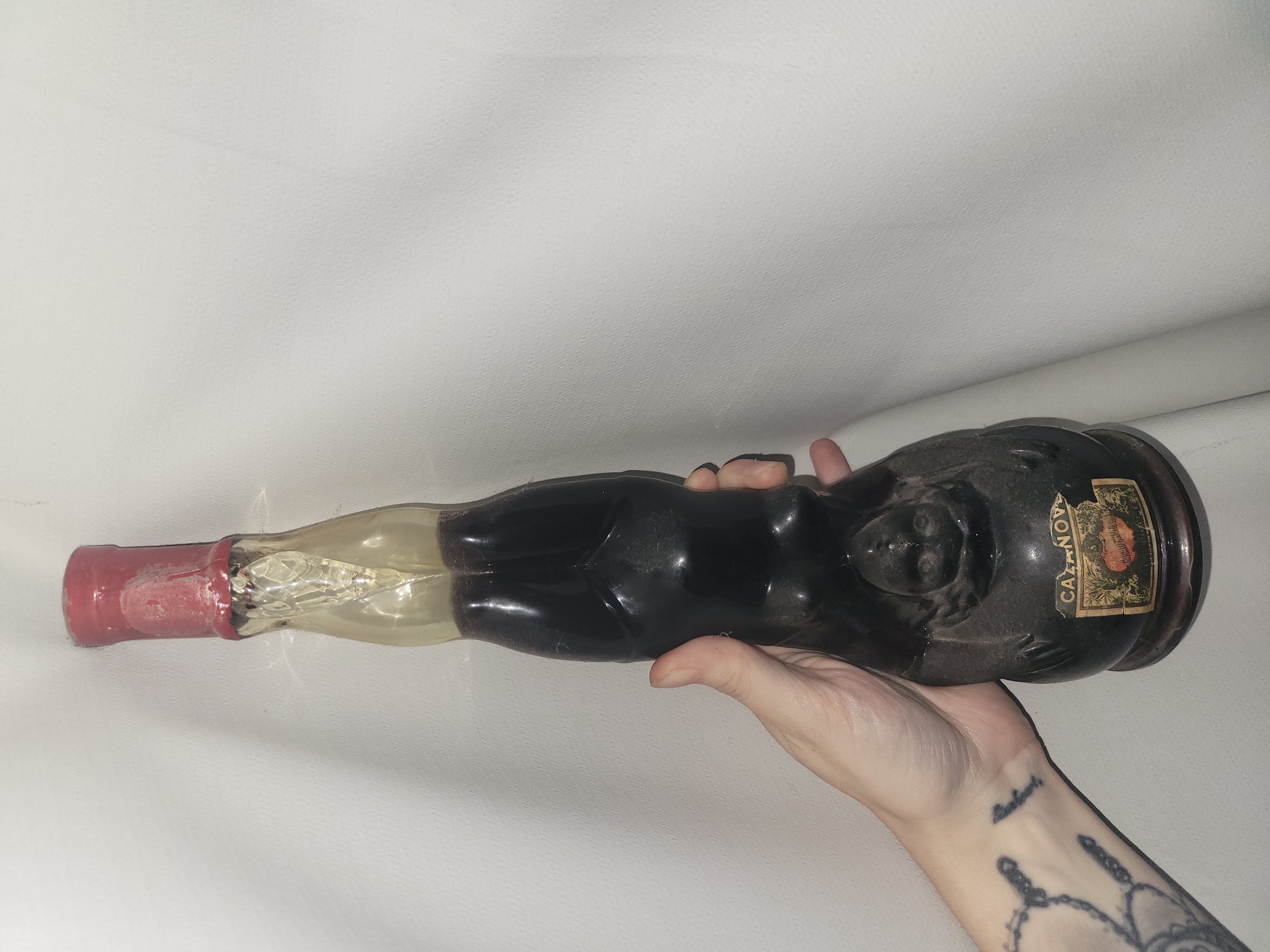 - 1) Text on label: CAZA-NOVA LIQUOR DE CACAO CHOCOLATE DE CAZANOVA FUNDA (Embossed on back): FEDERAL LAW FORBIDDS SALE (On cap top, partially legible): LIQUOR DE CACAO CAZANOVA 2) Visual elements: Bottle shape: A distinctive dark brown glass bottle shaped like a reclining nude woman, with the head at the base and the legs forming the neck. Neck/capsule: Sealed with a prominent red wax or wax-like capsule. Label paper not in great shape. Cap top: A circular, gold-colored label is affixed to the top of the capsule, featuring a central graphic (difficult to discern, possibly a stylized plant or letter 'C') surrounded by text. Main label (front, lower body): A rectangular, gold-yellow label with green borders and an illustration of cocoa plants or a jungle scene surrounding an orange-red cocoa pod/fruit. Embossing (back, lower body): Text is embossed directly onto the glass. Font styles: "CAZA-NOVA" and "CHOCOLATE" on the main label use decorative serif fonts. "LIQUOR DE", "CACAO", "DE CAZANOVA", and "FUNDA" are in sans-serif or smaller serif styles. The embossed text "FEDERAL LAW FORBIDDS SALE" uses a clear block sans-serif font. Text on the cap appears to be sans-serif. 3) Fill level estimate: well above shoulder into neck: great
