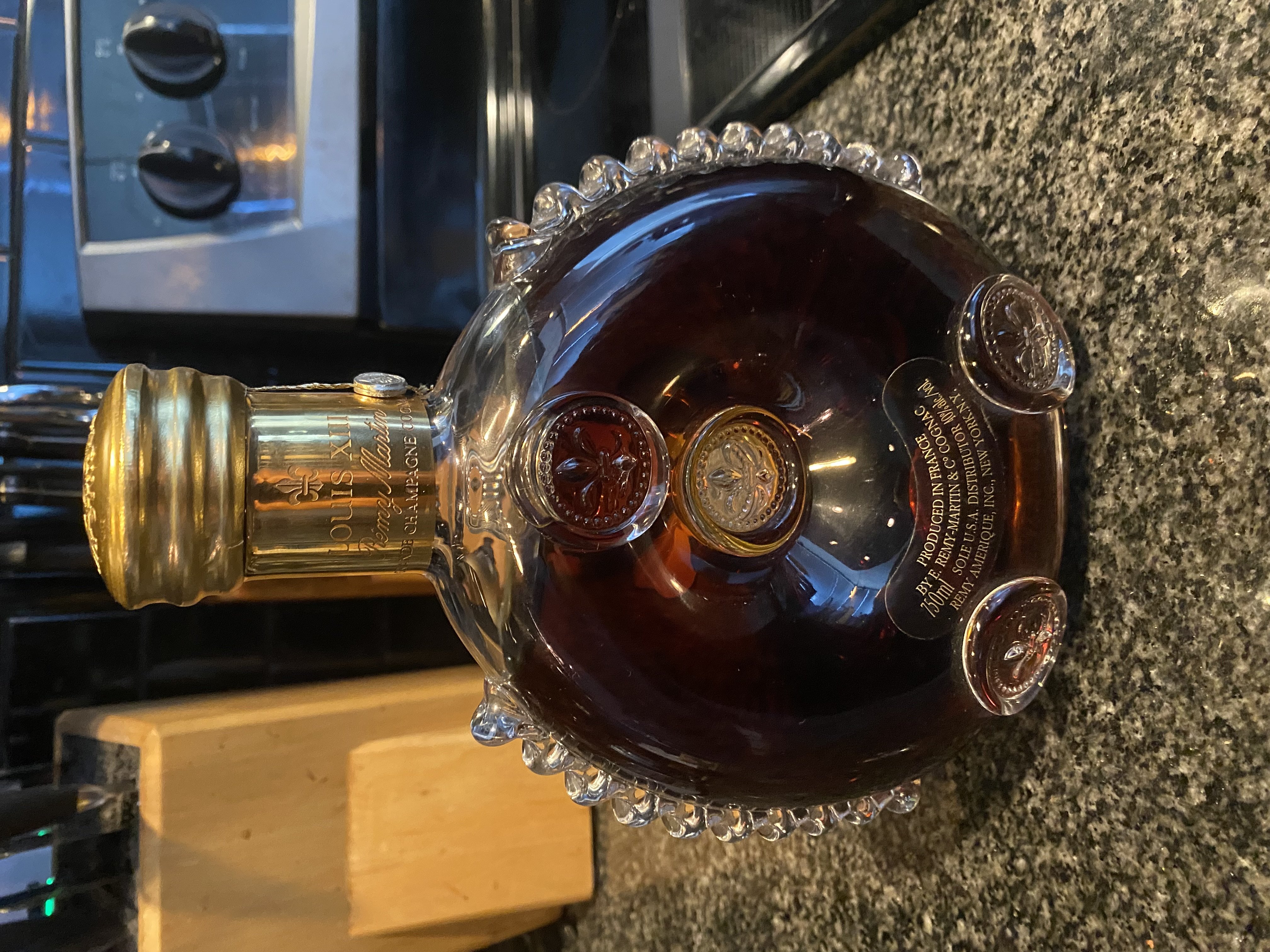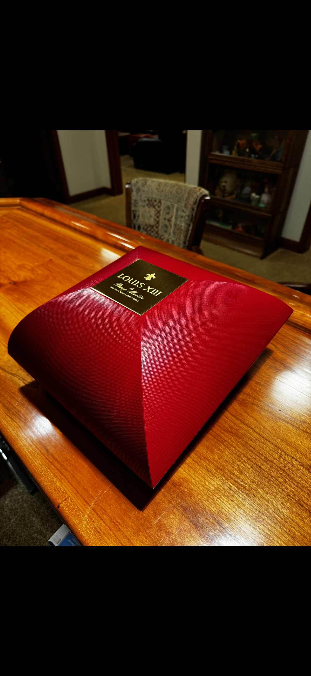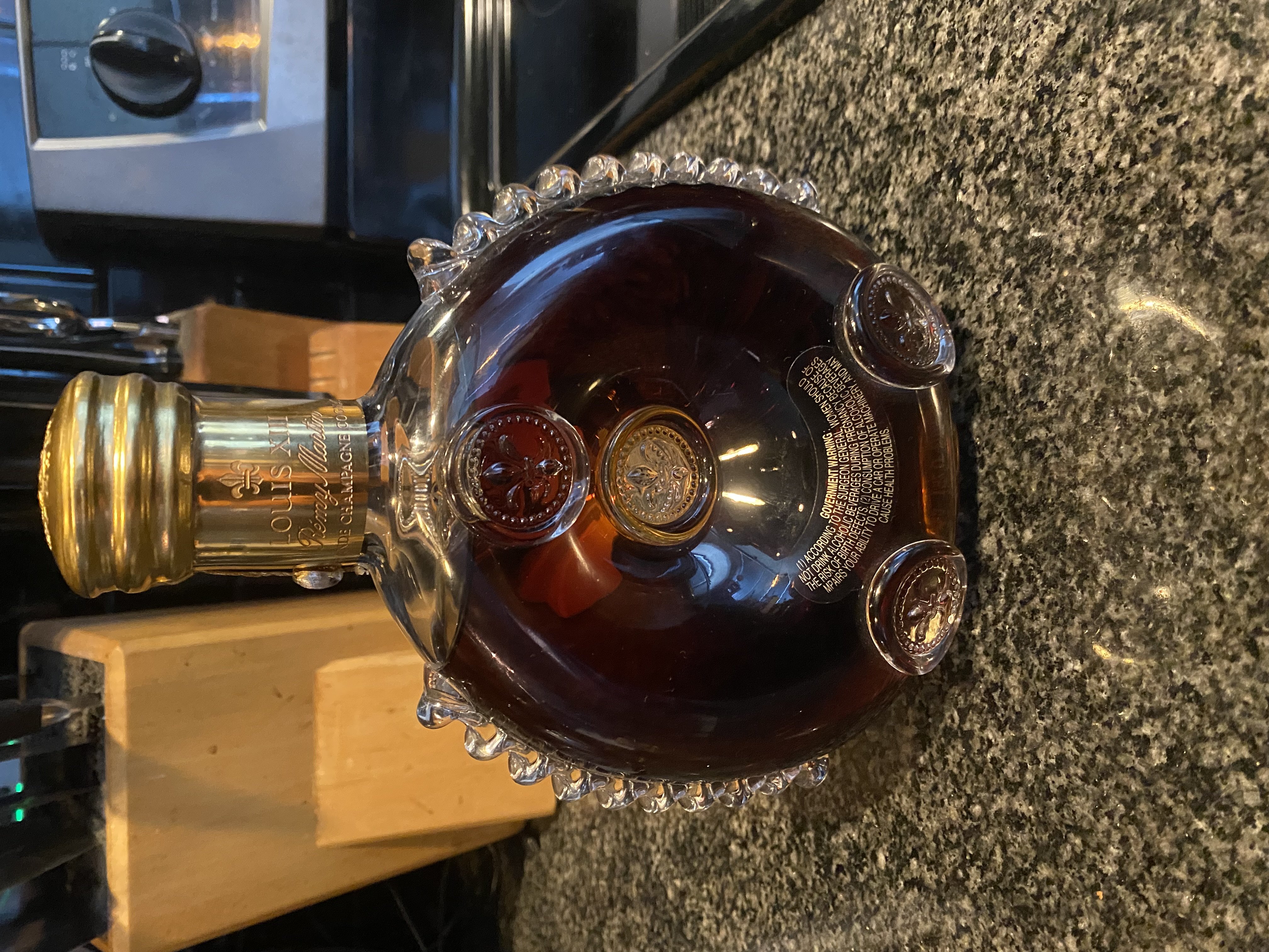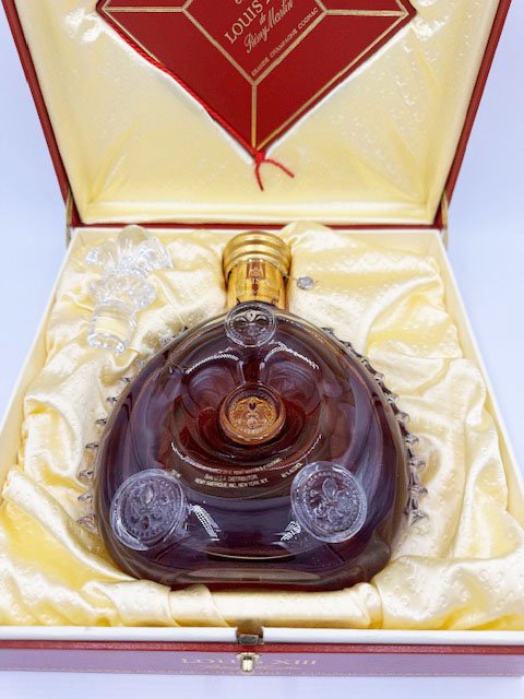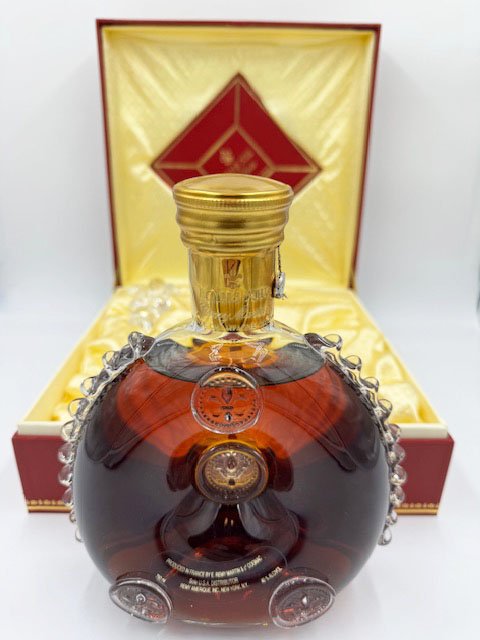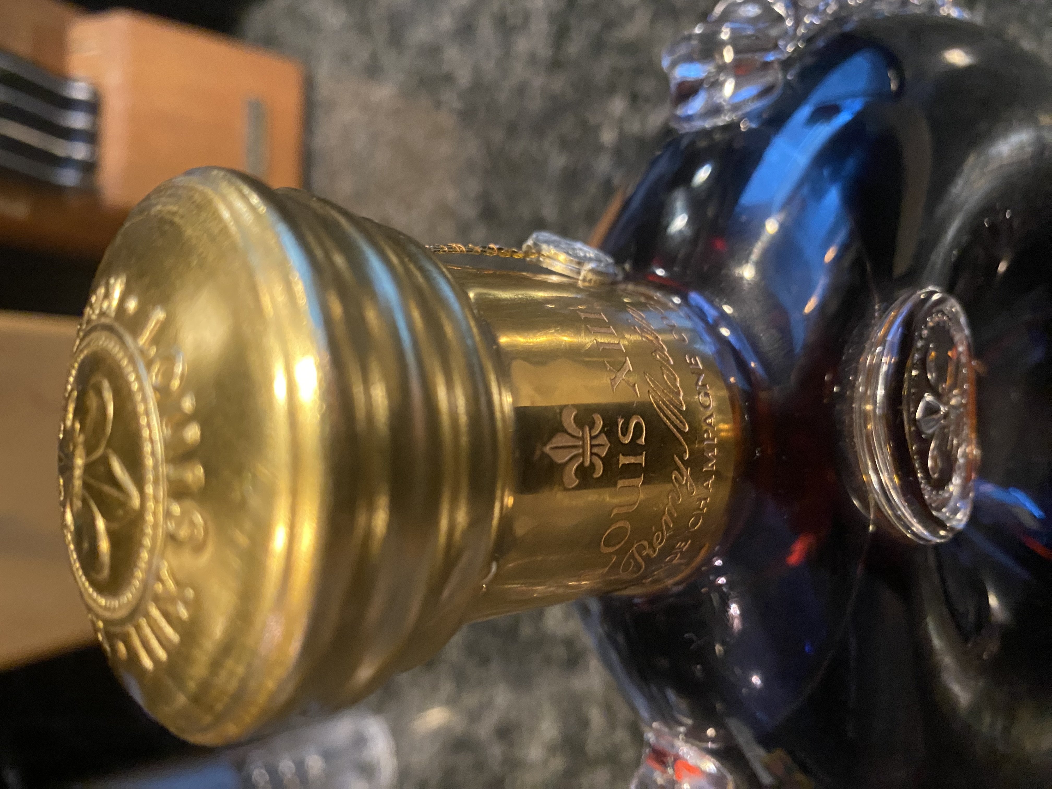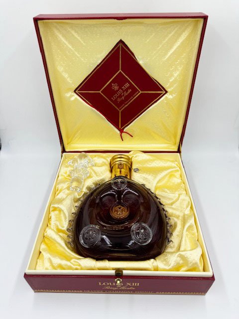 - 1) Text on label: On bottle neck label (gold foil): LOUIS XIII de Rémy Martin GRANDE CHAMPAGNE COGNAC On bottle lower label (on glass): PRODUCED IN FRANCE BY E. REMY MARTIN & CO, COGNAC 700ML SOLE U.S. DISTRIBUTOR: 40% Alc./Vol. REMY-AMERIQUE, INC., NEW YORK, N.Y. GOVERNMENT WARNING: (1) ACCORDING TO THE SURGEON GENERAL, WOMEN SHOULD NOT DRINK ALCOHOLIC BEVERAGES DURING PREGNANCY BECAUSE OF THE RISK OF BIRTH DEFECTS. (2) CONSUMPTION OF ALCOHOLIC BEVERAGES IMPAIRS YOUR ABILITY TO DRIVE A CAR OR OPERATE MACHINERY, AND MAY CAUSE HEALTH PROBLEMS. On bottle cap (embossed): LOUIS XIII REMY MARTIN (text in an arc around an emblem) On presentation box lid: LOUIS XIII de Rémy Martin GRANDE CHAMPAGNE COGNAC 2) Visual elements: Neck/Capsule: A gold-colored foil/metal capsule covers the cork and upper neck, featuring a prominent fleur-de-lis emblem. The top of the cap is gold and embossed with "LOUIS XIII" and "REMY MARTIN" in a circular pattern around a central fleur-de-lis. Bottle Body: The unique round bottle design features raised, shell-like glass patterns around its shoulders. There are multiple circular glass medallions/seals embedded around the bottle's circumference; on the front, the upper medallion contains a red-tinted fleur-de-lis, the middle one a gold-tinted royal seal/sun emblem, and the lower one a dark-tinted design. The bottle also rests on three prominent glass "feet" at its base, which appear to have embossed designs within them. Presentation Box: The red box lid is adorned with elegant gold geometric lines creating panels, and features four gold fleur-de-lis emblems, one in each corner section of the main design. Apparent font style(s): "LOUIS XIII" on the bottle neck and box lid uses a large, ornate serif font. "de Rémy Martin" is in a decorative script/cursive font. "GRANDE CHAMPAGNE COGNAC" is in a smaller, elegant serif font. The lower bottle label text is primarily a small, clear sans-serif font, while the embossed text on the bottle cap uses a block serif font. 3) Fill level estimate: well above shoulder into neck: great Reason: The liquid level is clearly visible just below the neck's gold foil, indicating a full fill with no noticeable air gap or evaporation.